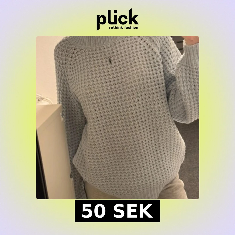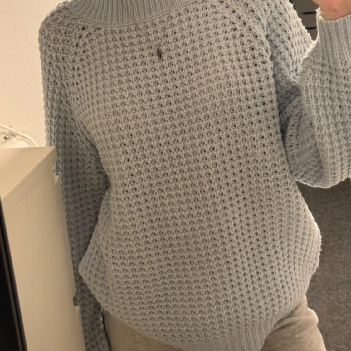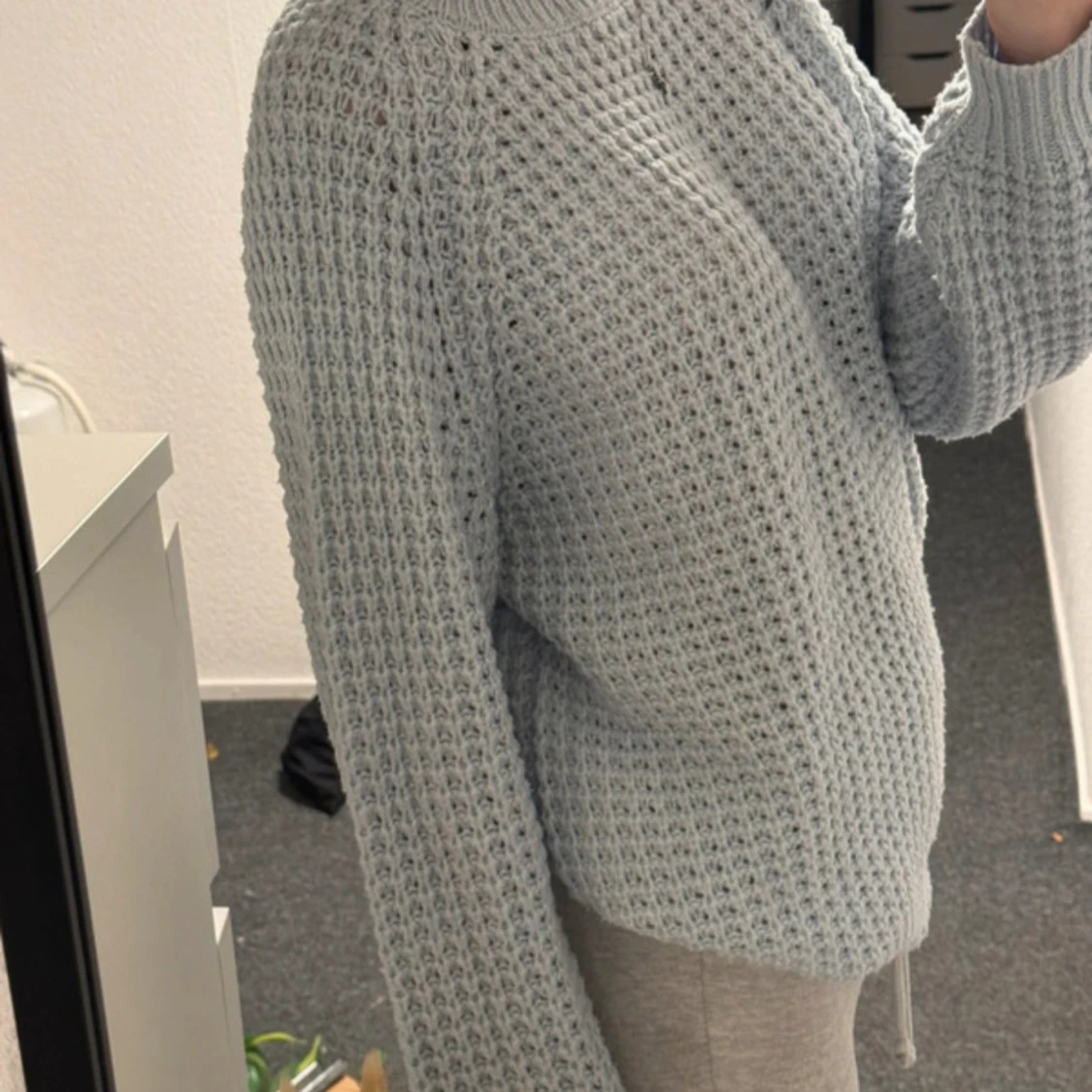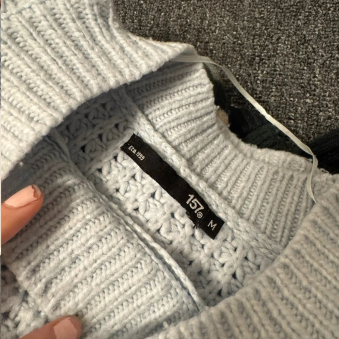 Mysig ljusblå stickad tröja från 157 med grovstickat mönster och hög krage. Tröjan har långa ärmar och en avslappnad passform, perfekt för kyliga dagar.