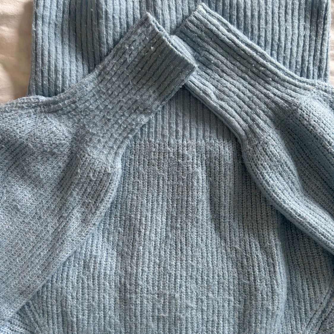Supermysig ljusblå stickad tröja från Gina Tricot. Tröjan har en hög ribbad krage och långa ärmar med breda muddar. Perfekt för lager-på-lager och chill dagar. Enkel och stilren design som är lätt att matcha.