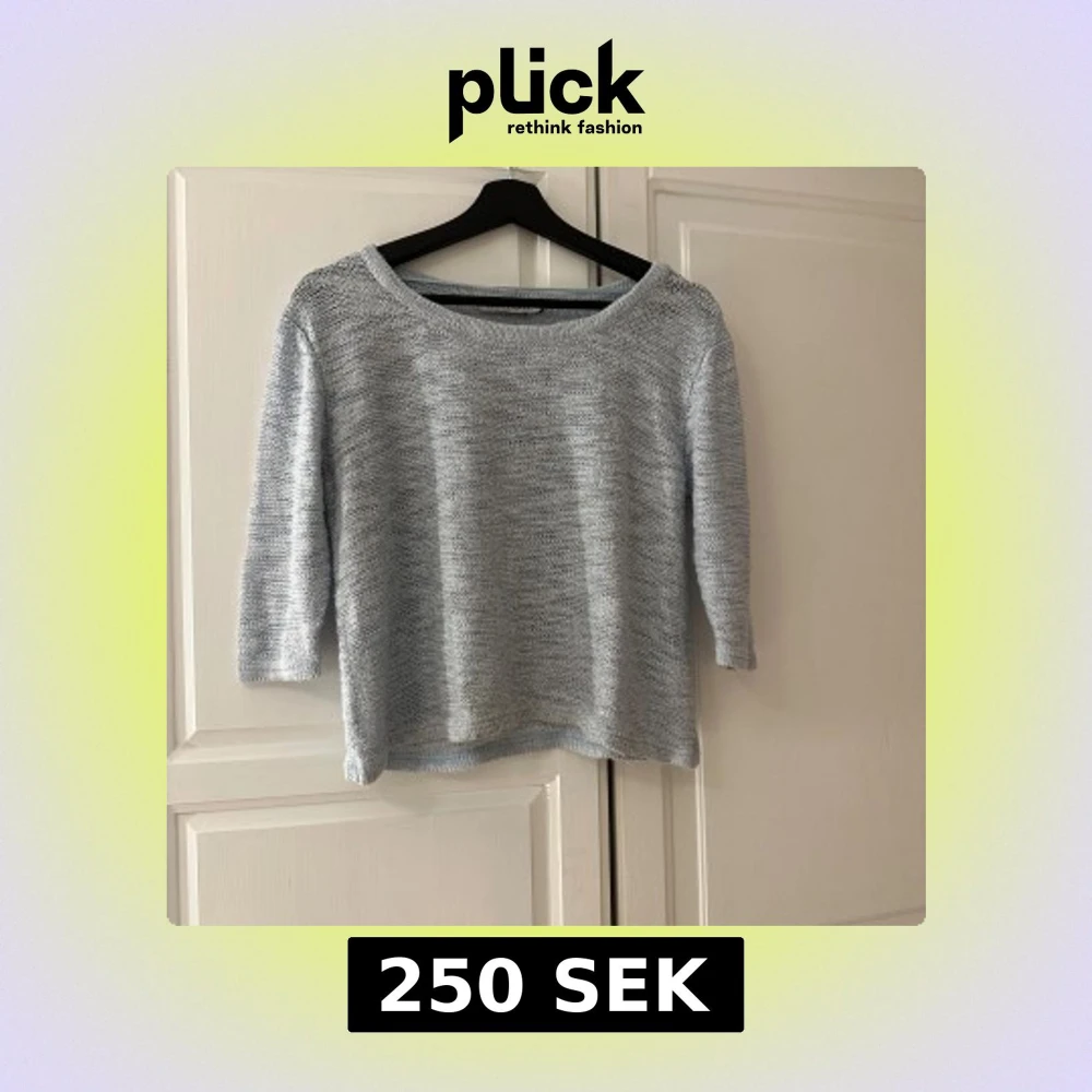 Säljer en ljusblå stickad tröja från Seppälä Woman. Tröjan har trekvartsärmar och en rund halsringning
