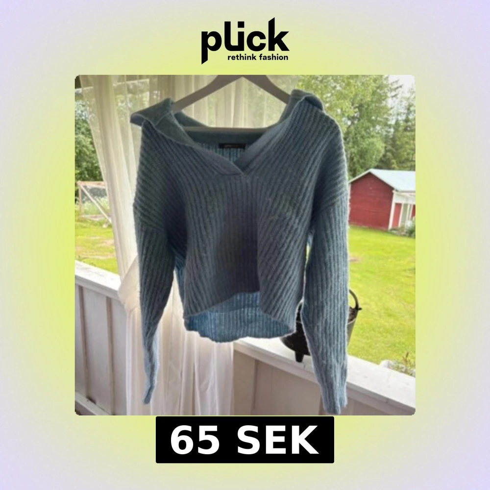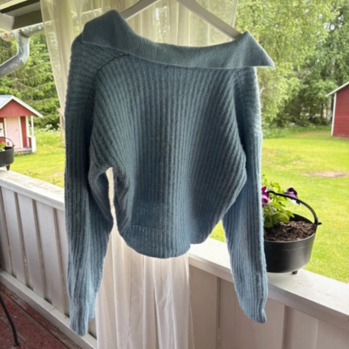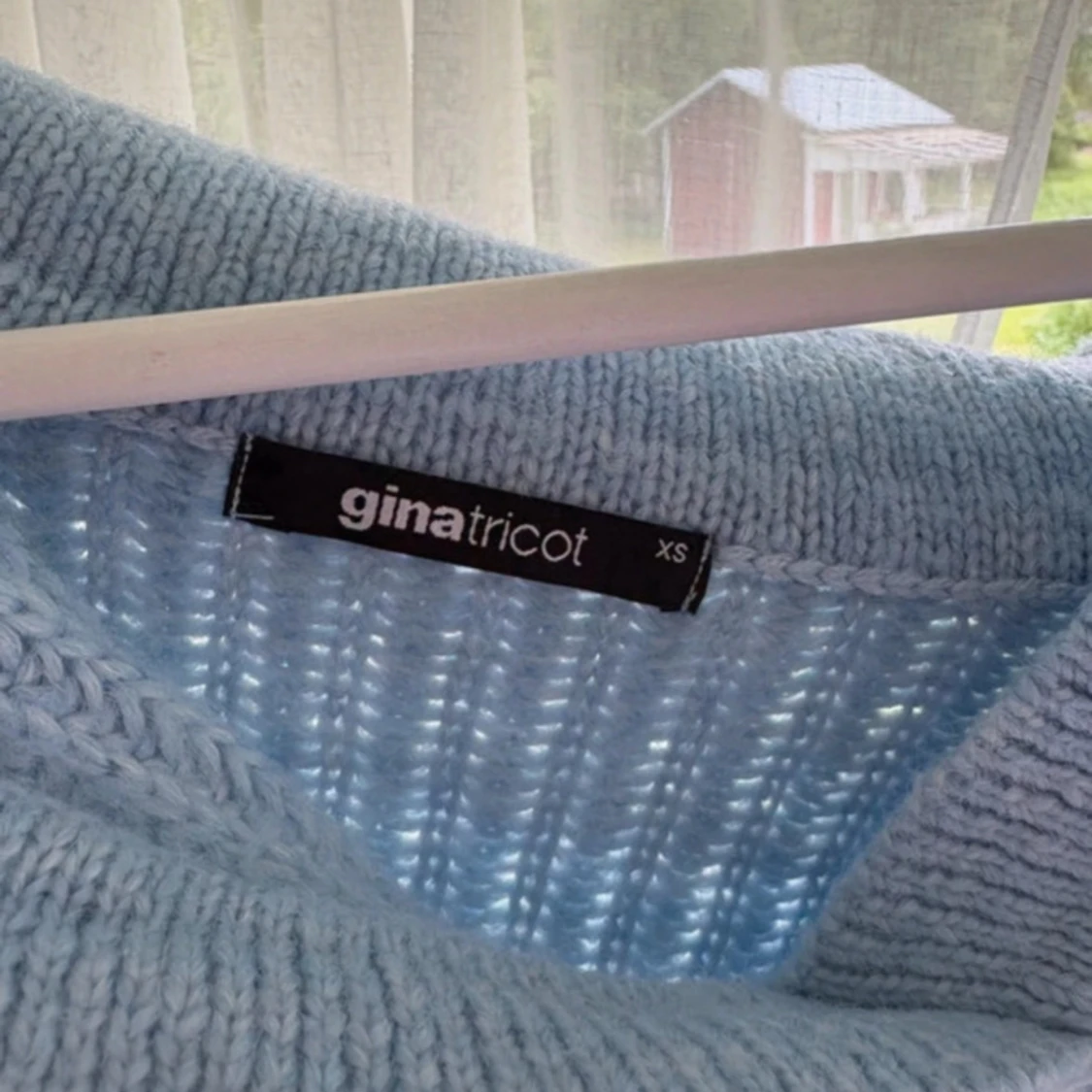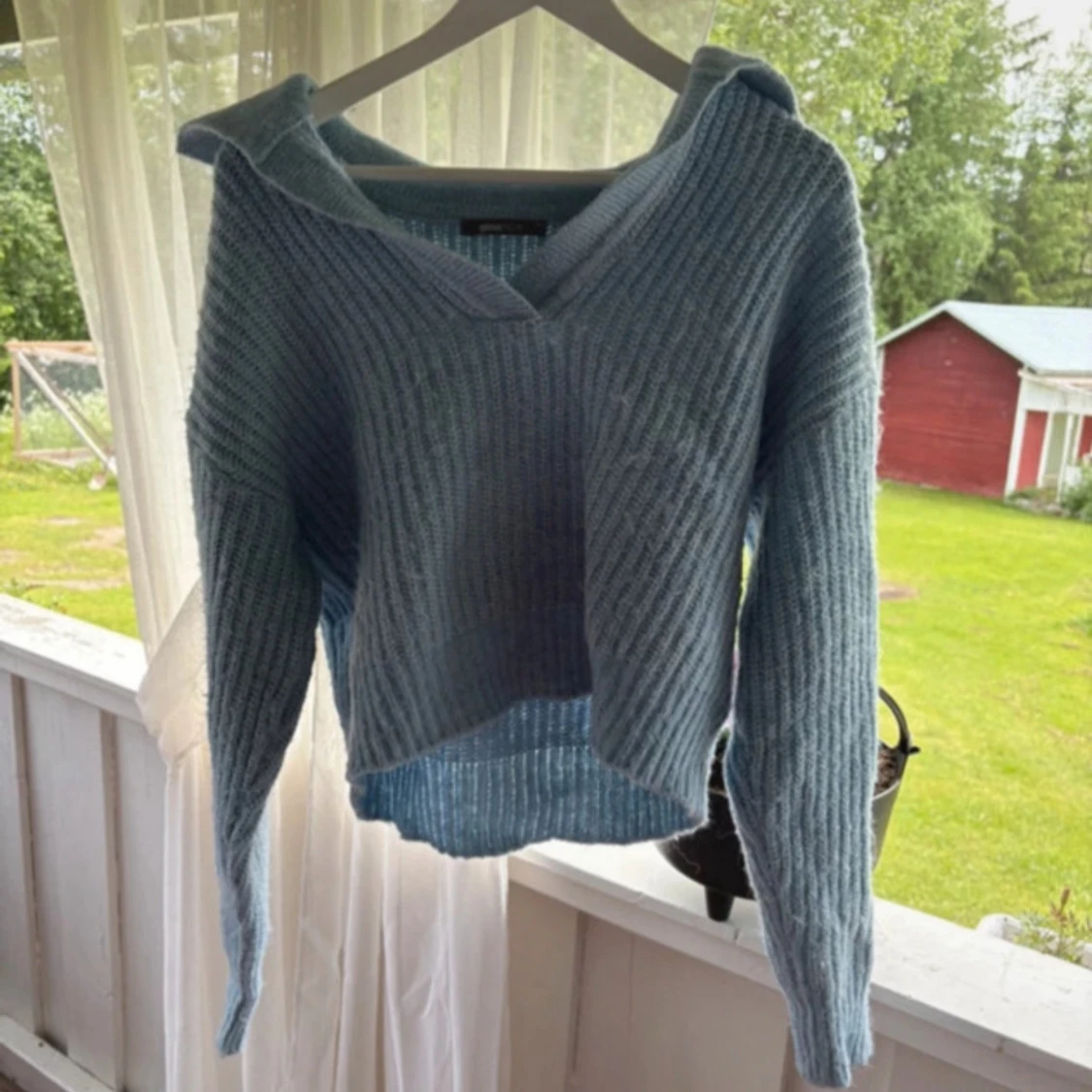 Superfin ljusblå stickad tröja från Gina Tricot i ribbad modell. Tröjan har en bred krage, croppad passform och långa ärmar. Perfekt för dig som gillar en chill och trendig look. Snygg att matcha med jeans eller kjol!