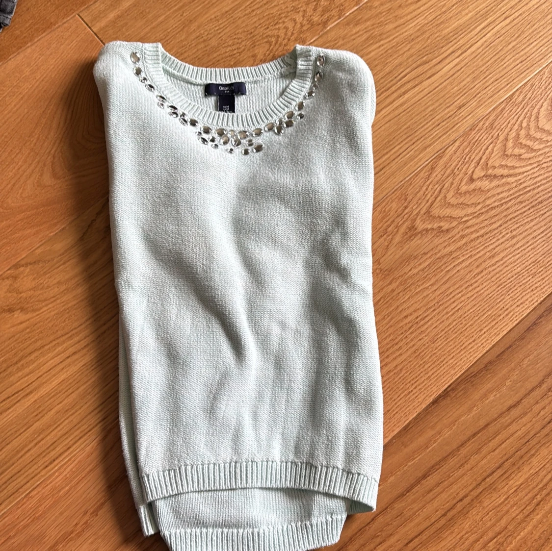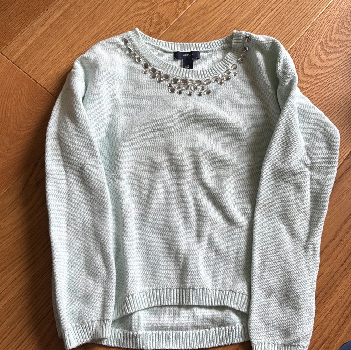 Ljusblå stickad tröja med pärldetaljer
