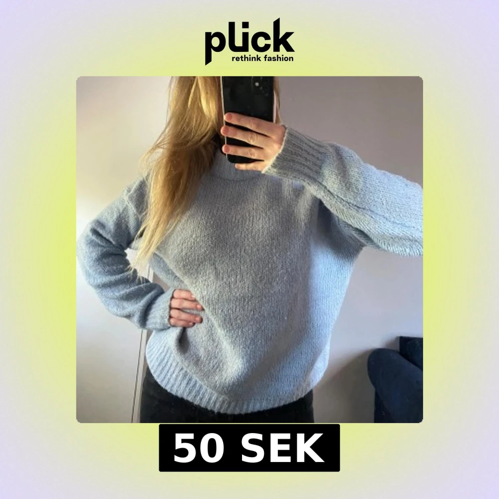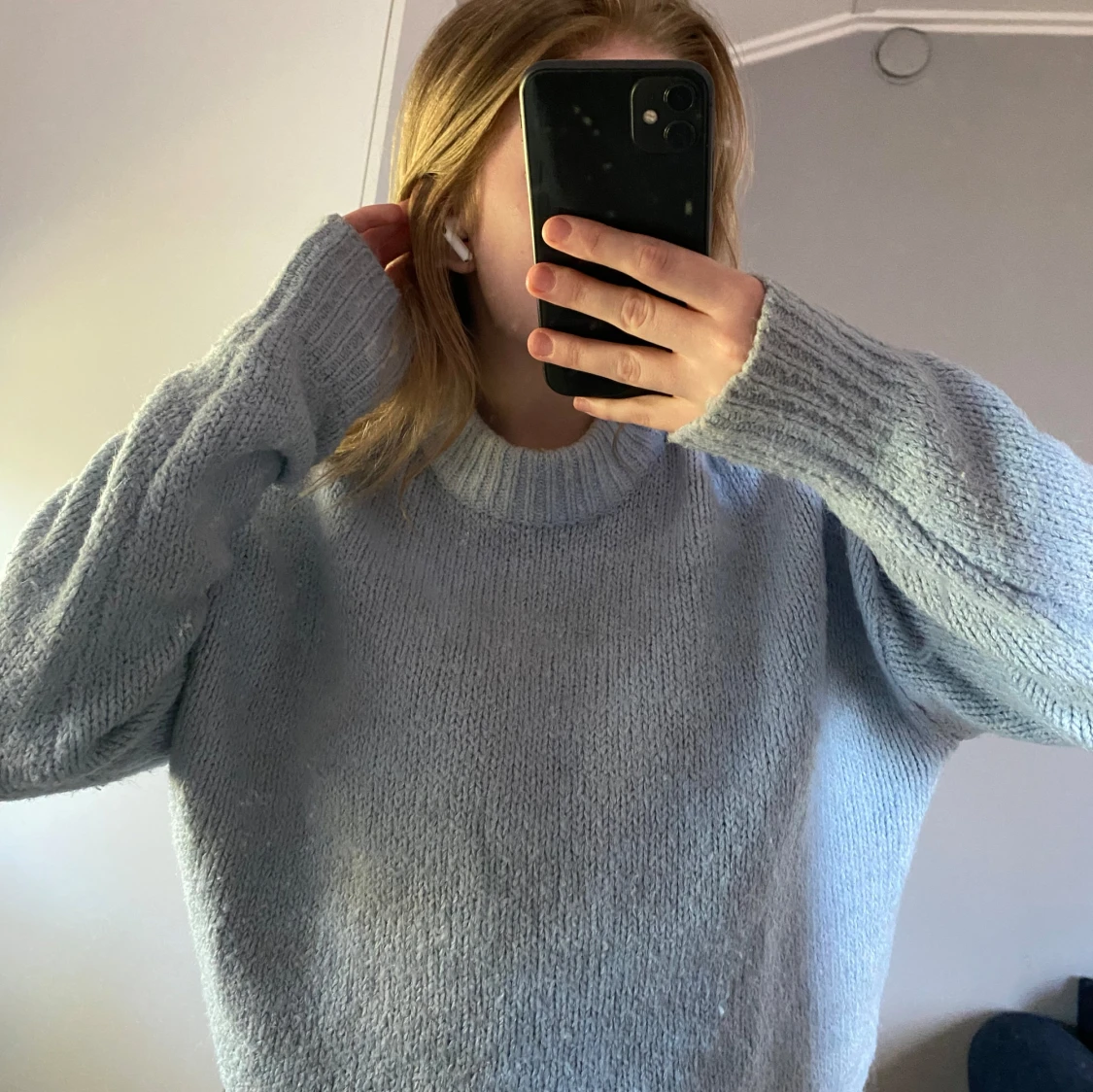 Mysig ljusblå stickad tröja med rund halsringning och långa ärmar. Tröjan har en relaxed passform och breda ribbade muddar vid ärmslut och nederkant.
