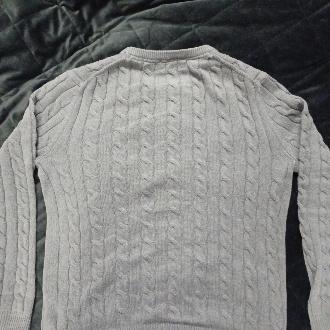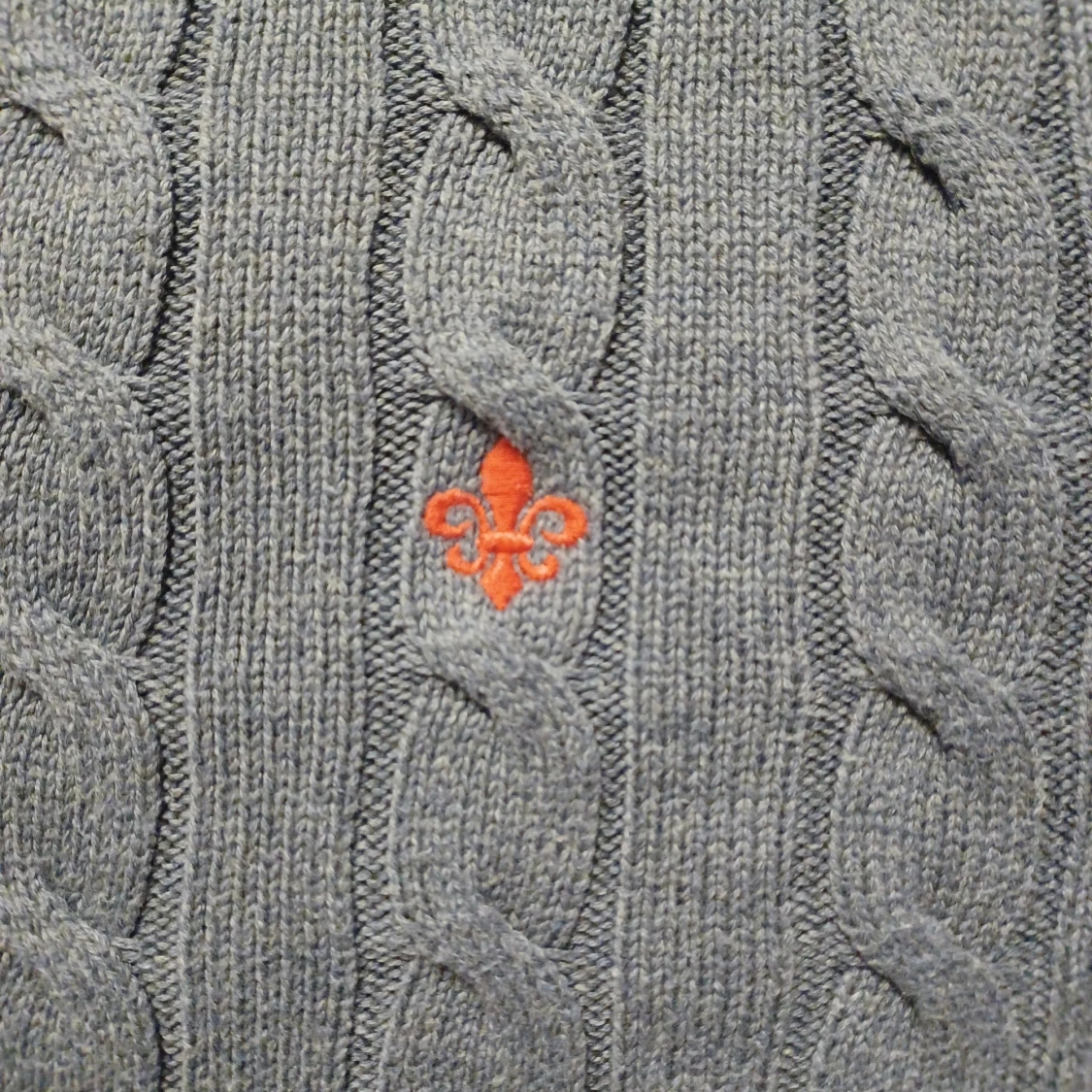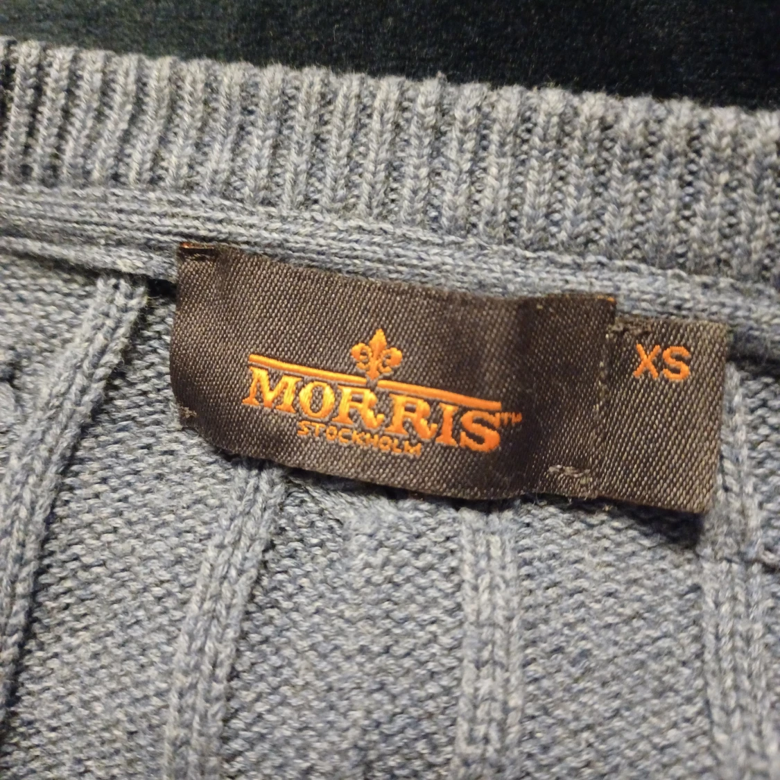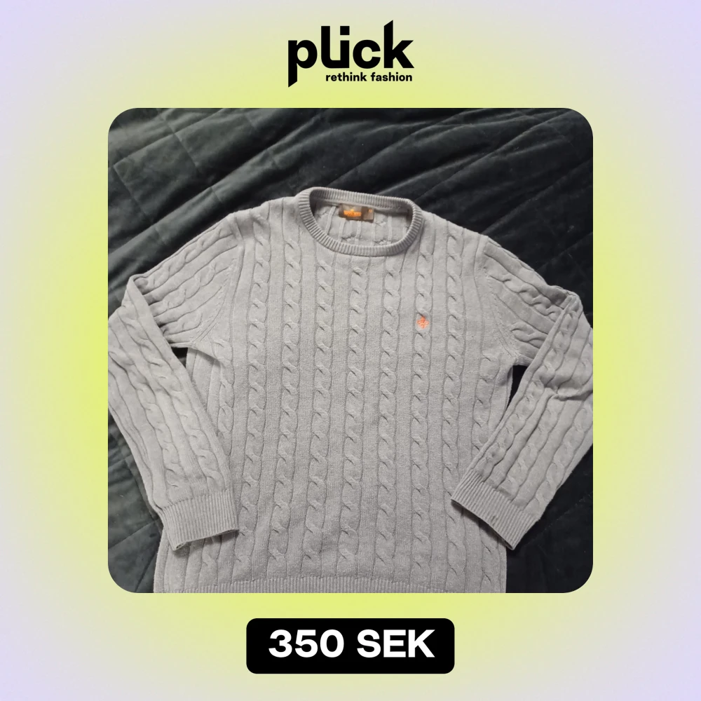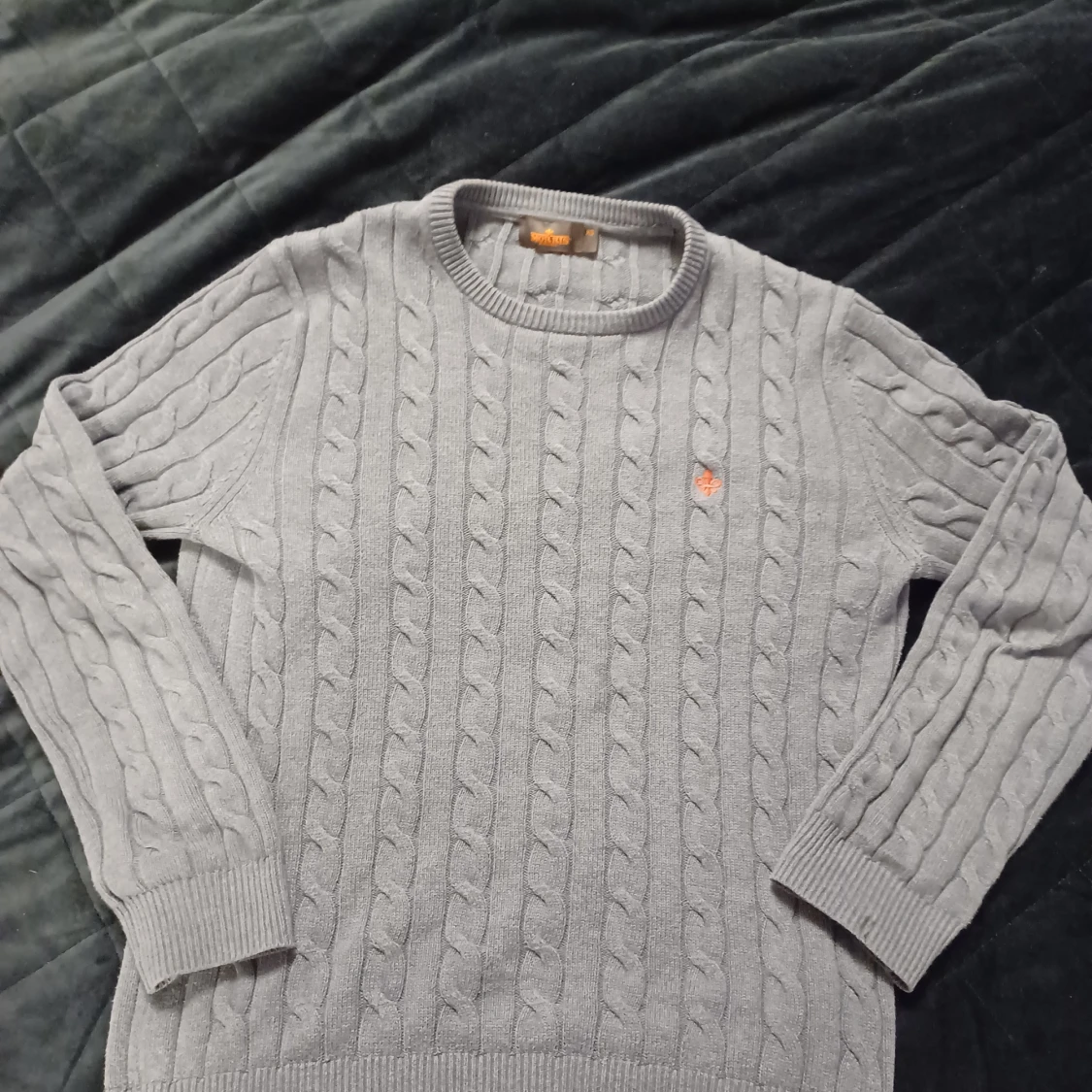 Säljer en stilren grå stickad tröja från Morris med klassiskt flätmönster. Tröjan har en liten orange broderad detalj på bröstet och ribbade muddar vid ärmslut och nederkant. Perfekt för kyliga dagar! OBS MÖRKARE I VERKLIGENHETEN