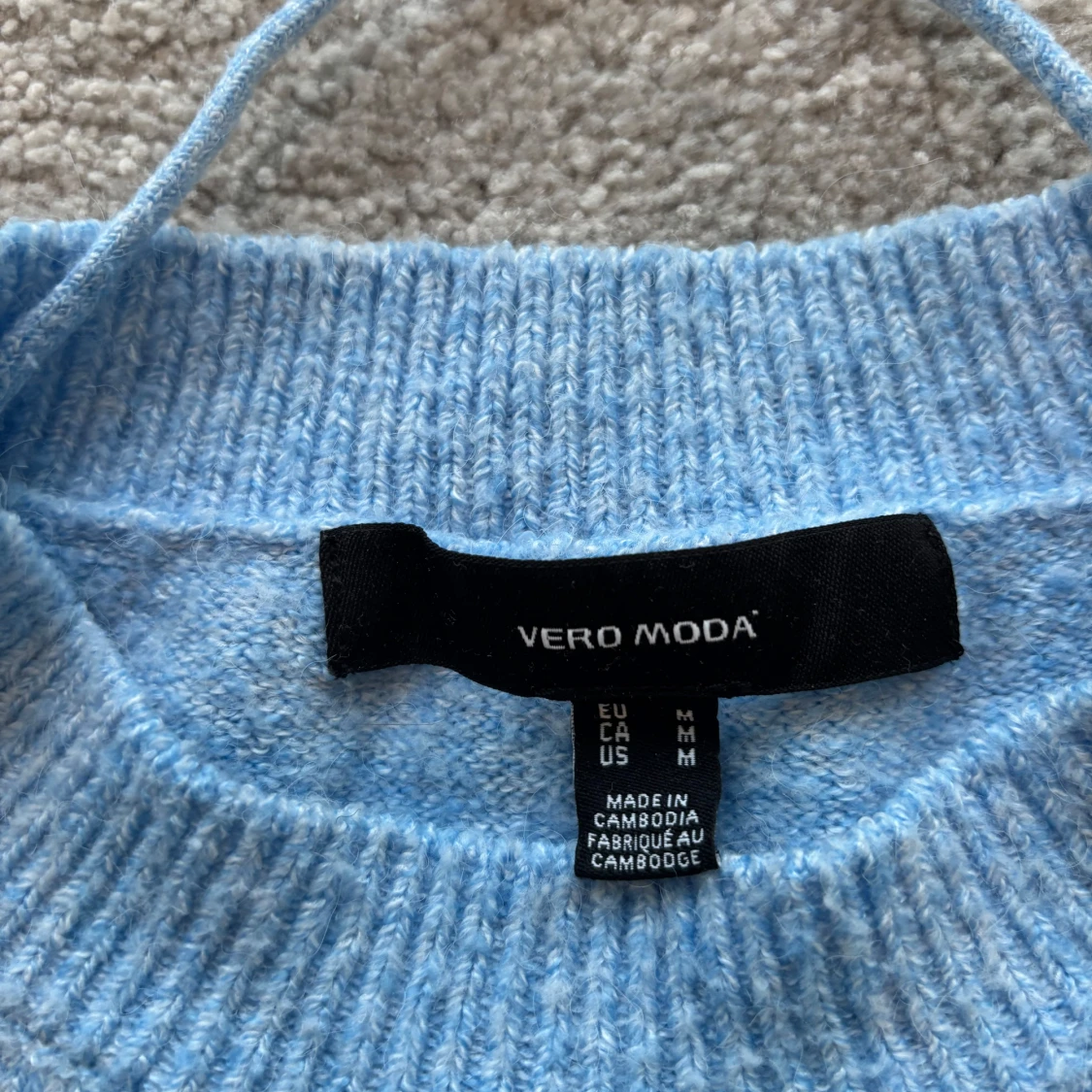 Supersöt ljusblå stickad tröja från Vero Moda med puffiga korta ärmar och ribbade muddar. Perfekt för dig som vill ha en trendig och mysig look. Tröjan har en klassisk rund halsringning och är riktigt mjuk och skön.