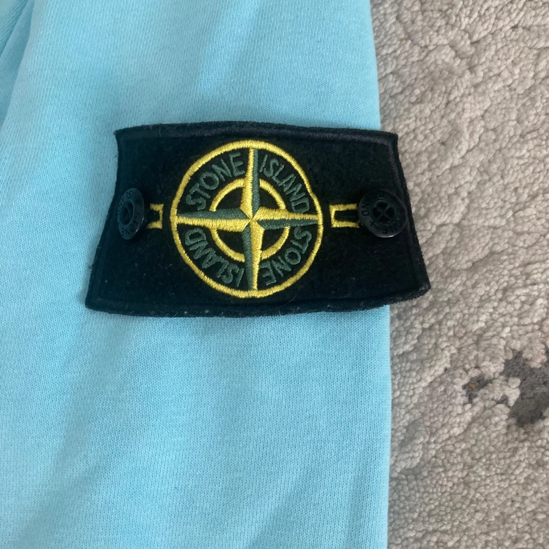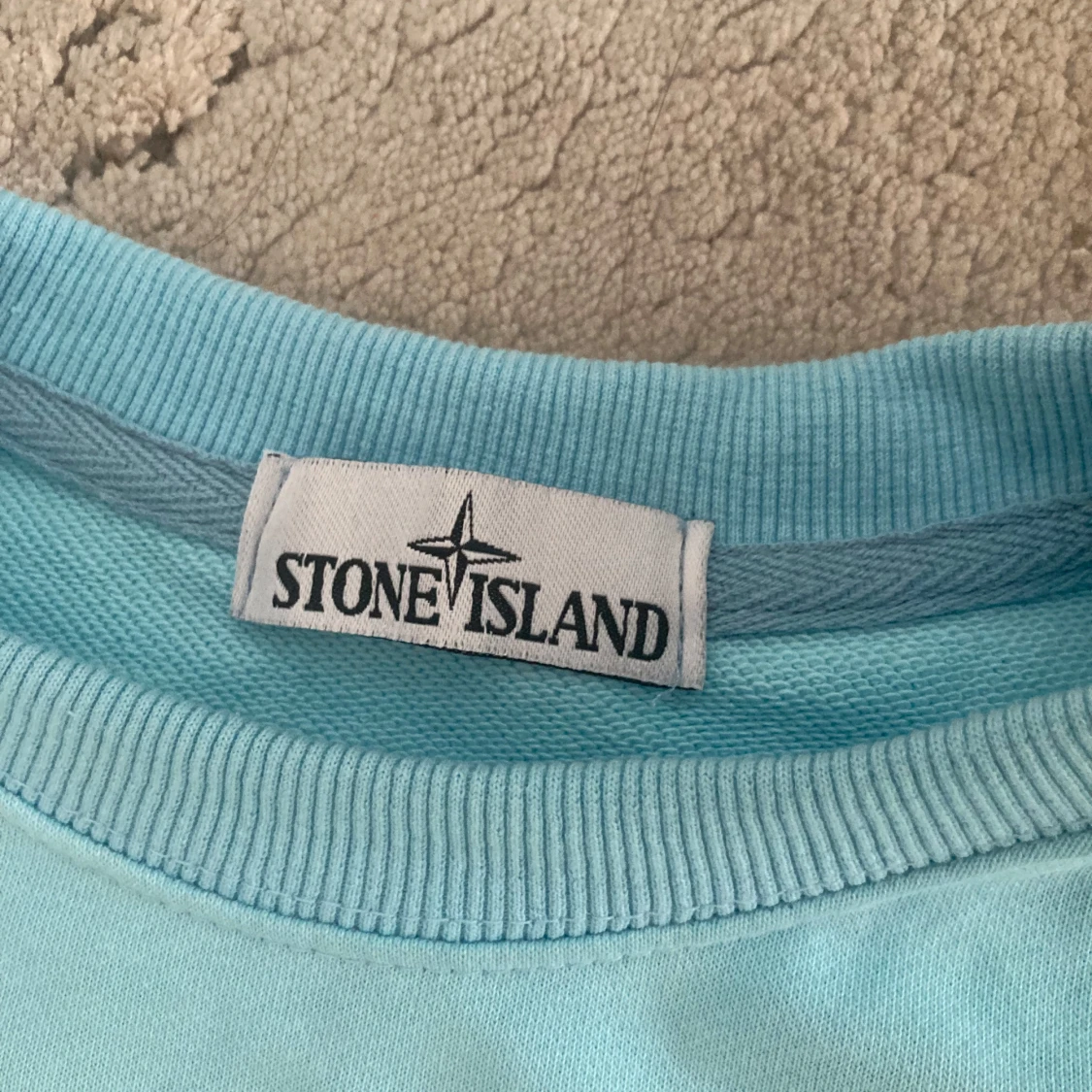 Säljer en ljusblå sweatshirt från Stone Island med klassisk patch på ärmen. Tröjan har rund hals, ribbade muddar och är tillverkad i mjuk bomull. Perfekt för dig som gillar streetwear och vill sticka ut med en clean look.