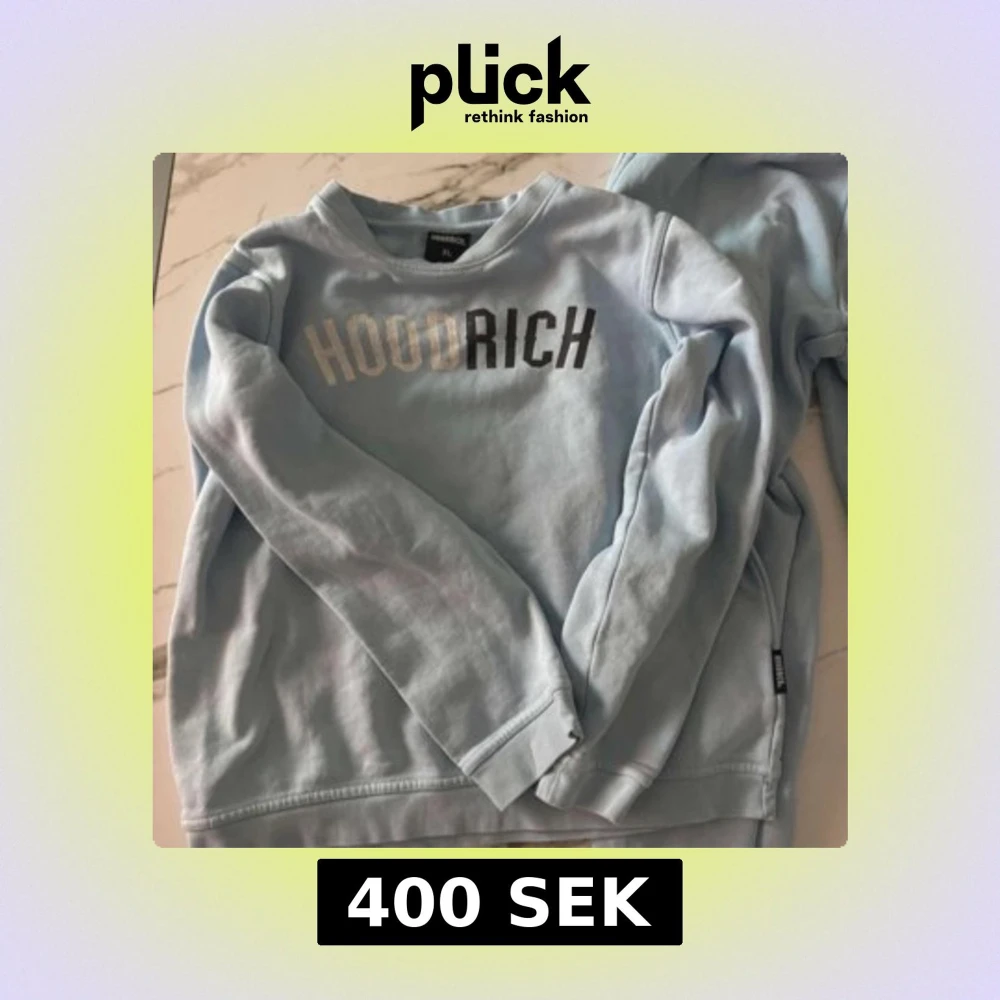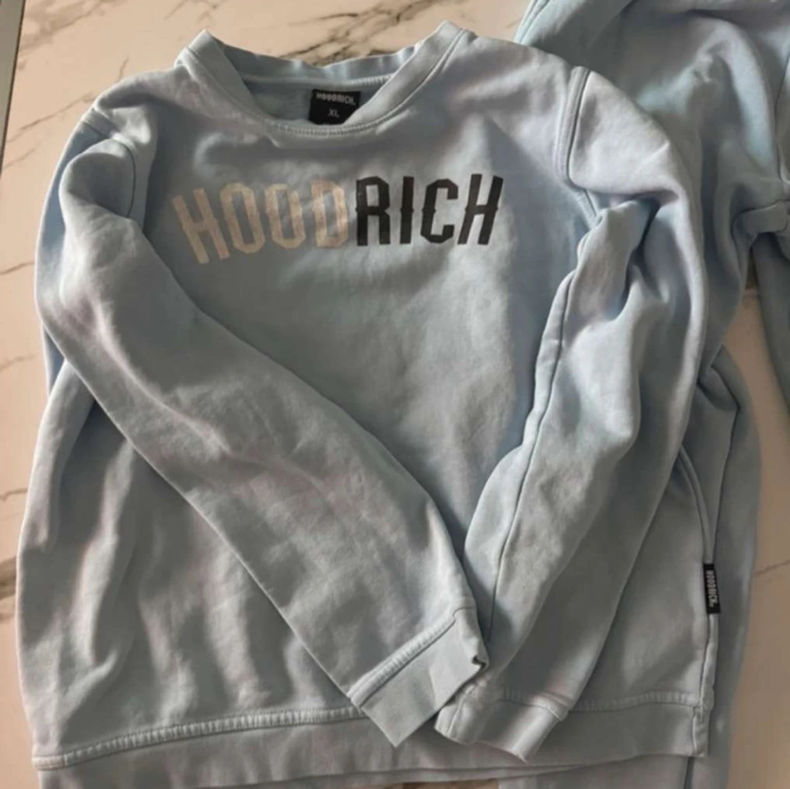 Ljusblå sweatshirt från Hoodrich i storlek XL (13-15 år). Tröjan har rund hals, långa ärmar och tryckt HOODRICH-logga i vitt och svart framtill. Mjuk insida och ribbade muddar vid ärmslut och nederkant. Perfekt för chill dagar.