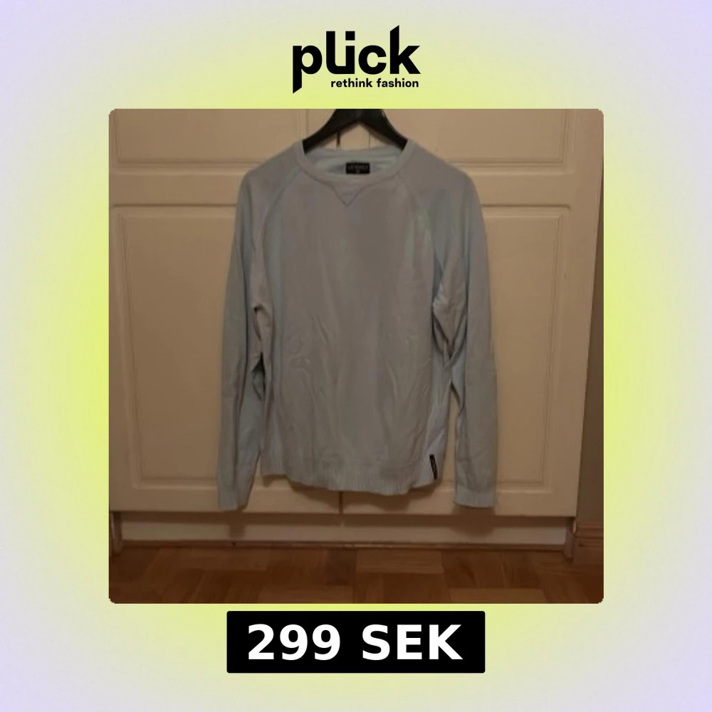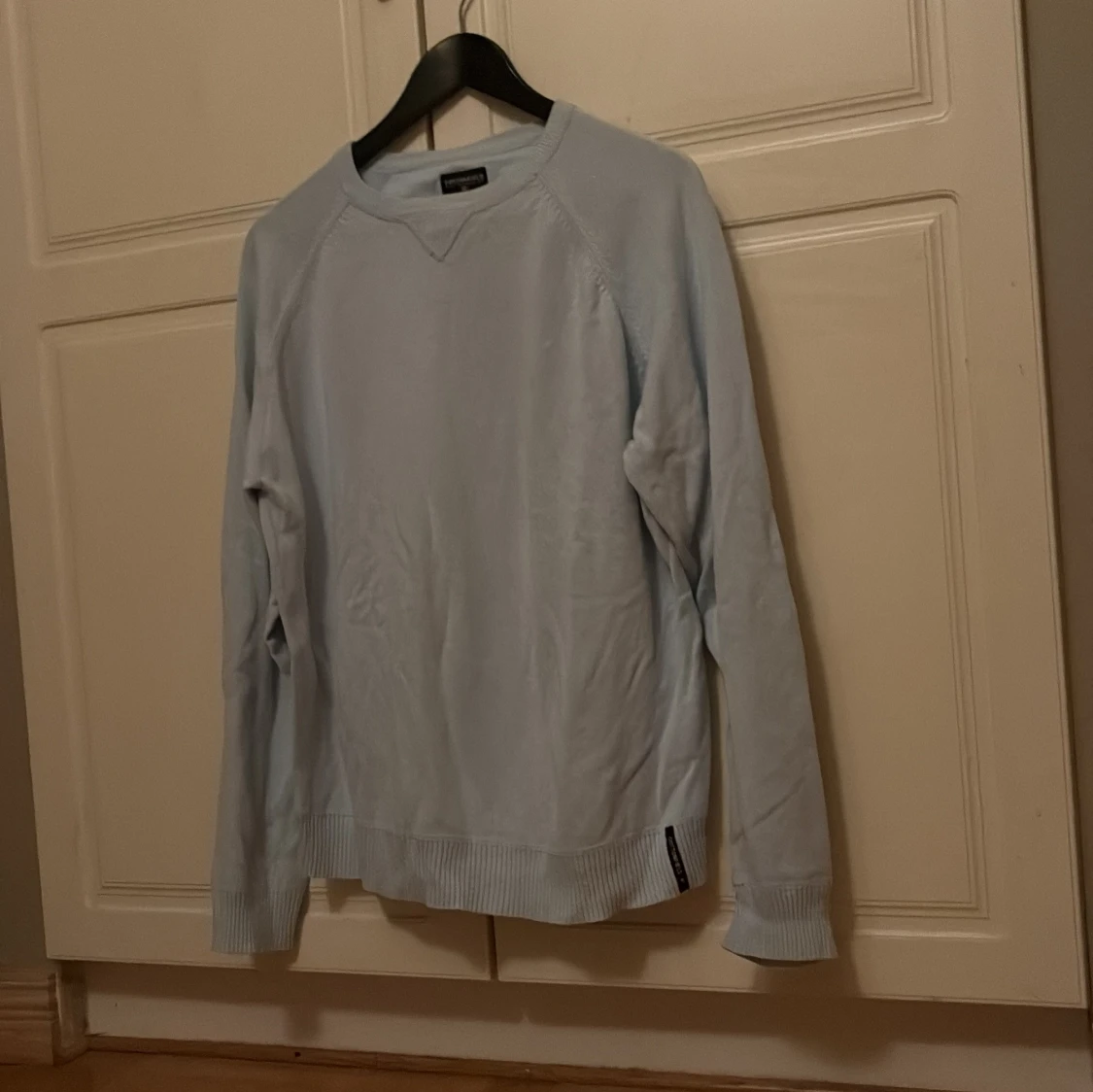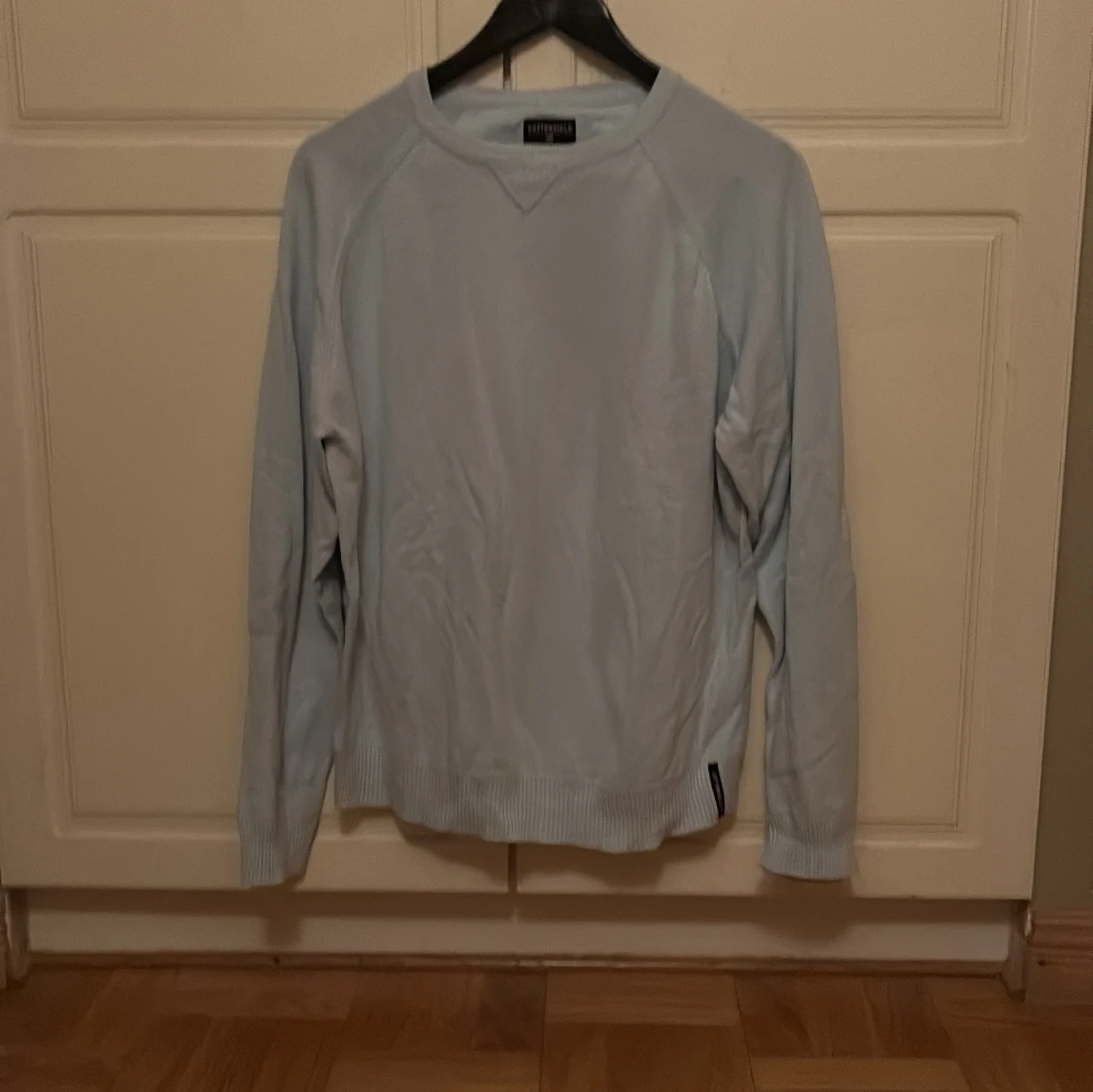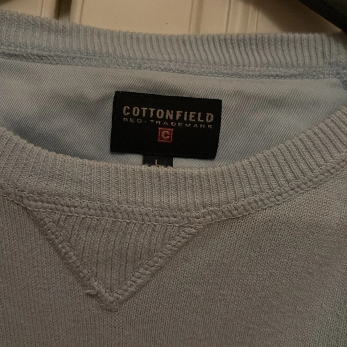 Säljer en ljusblå långärmad tröja från Cottonfield. Tröjan har rund halsringning med ribbade muddar vid ärmslut och nederkant. Perfekt för en stilren och enkel look.