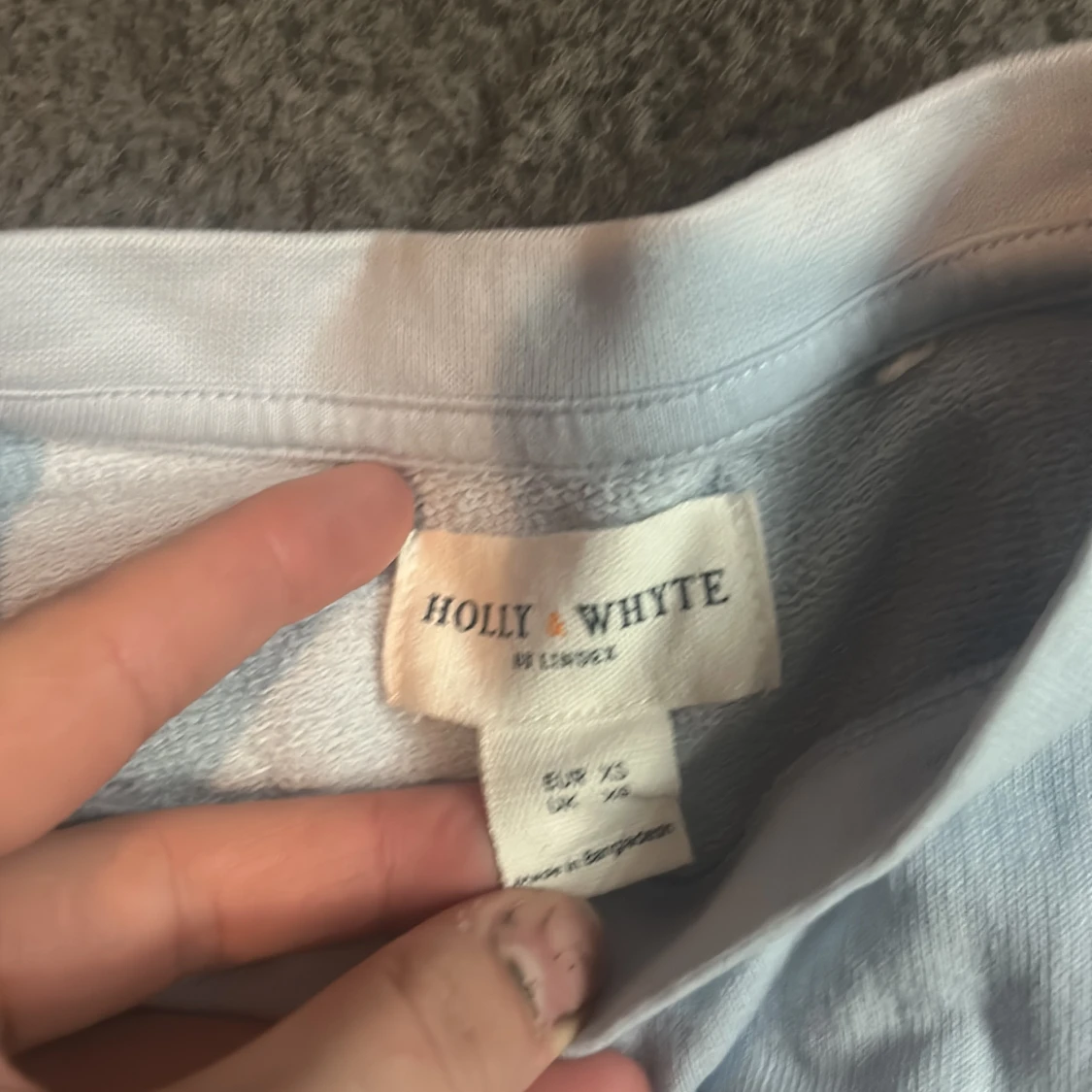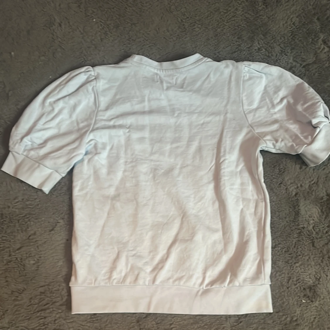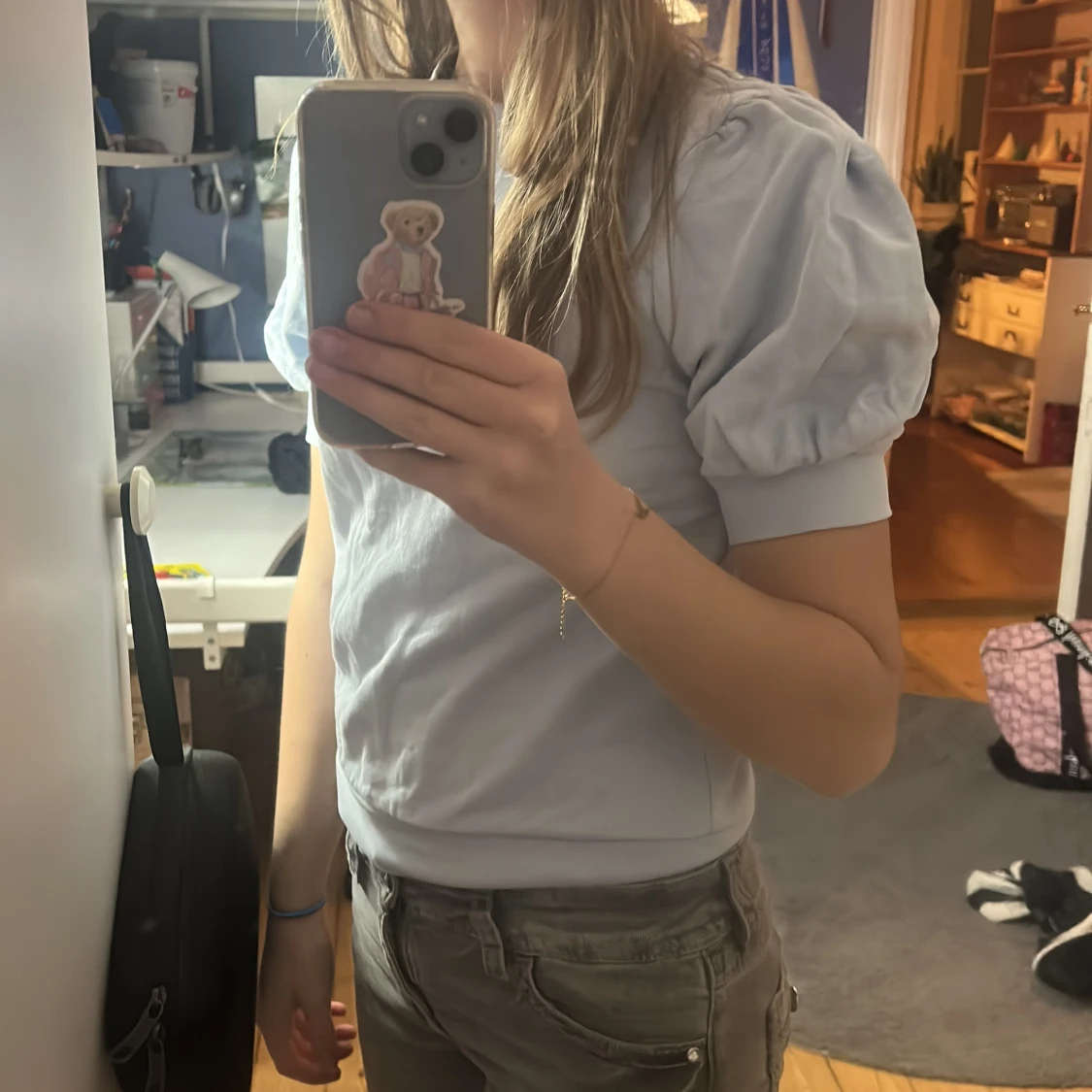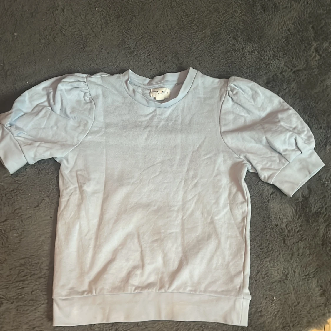 Säljer en söt ljusblå tröja från Holly & Whyte med puffiga korta ärmar. Perfekt för en stilren look. Tröjan har en rund halsringning och är gjord i ett mjukt material. Storlek xs