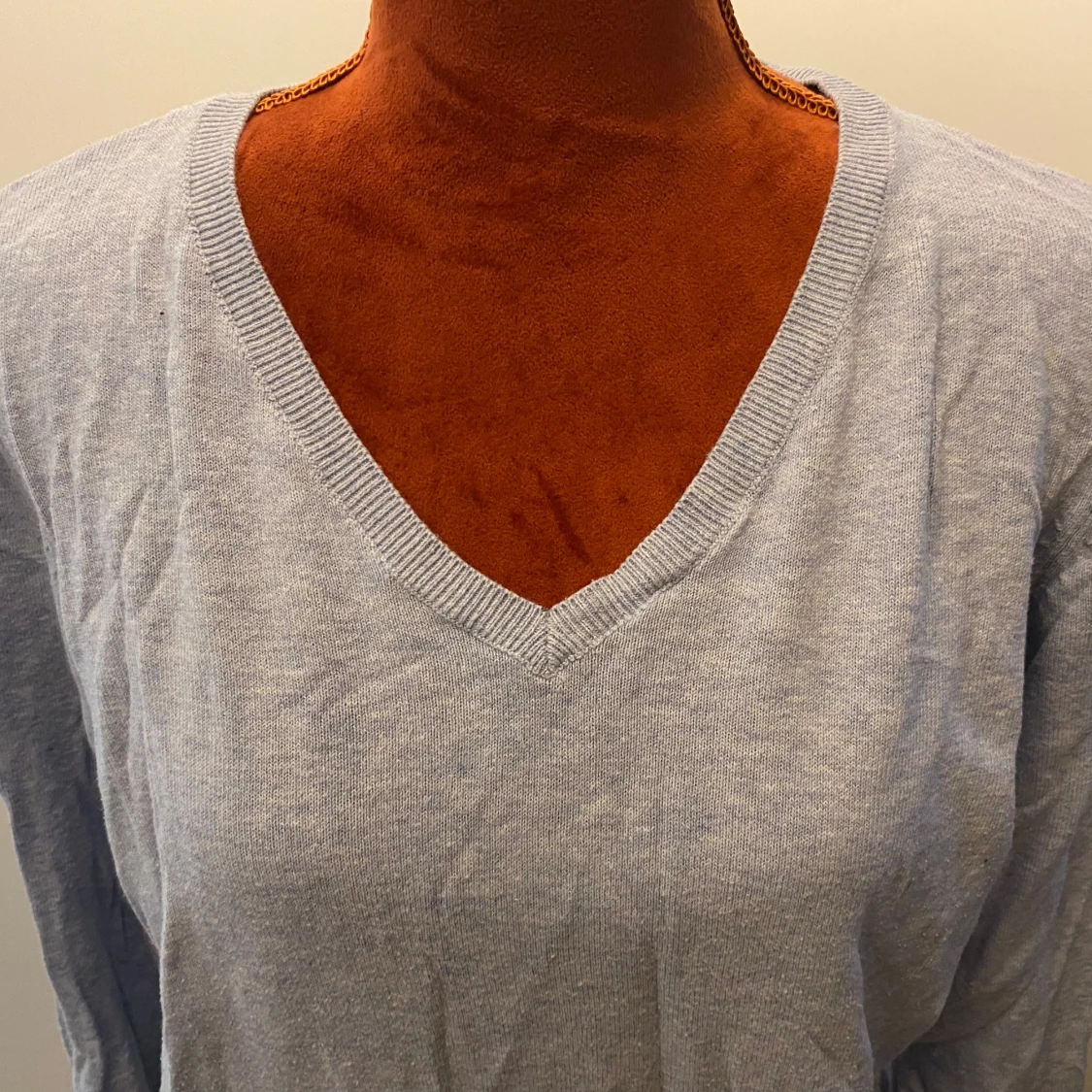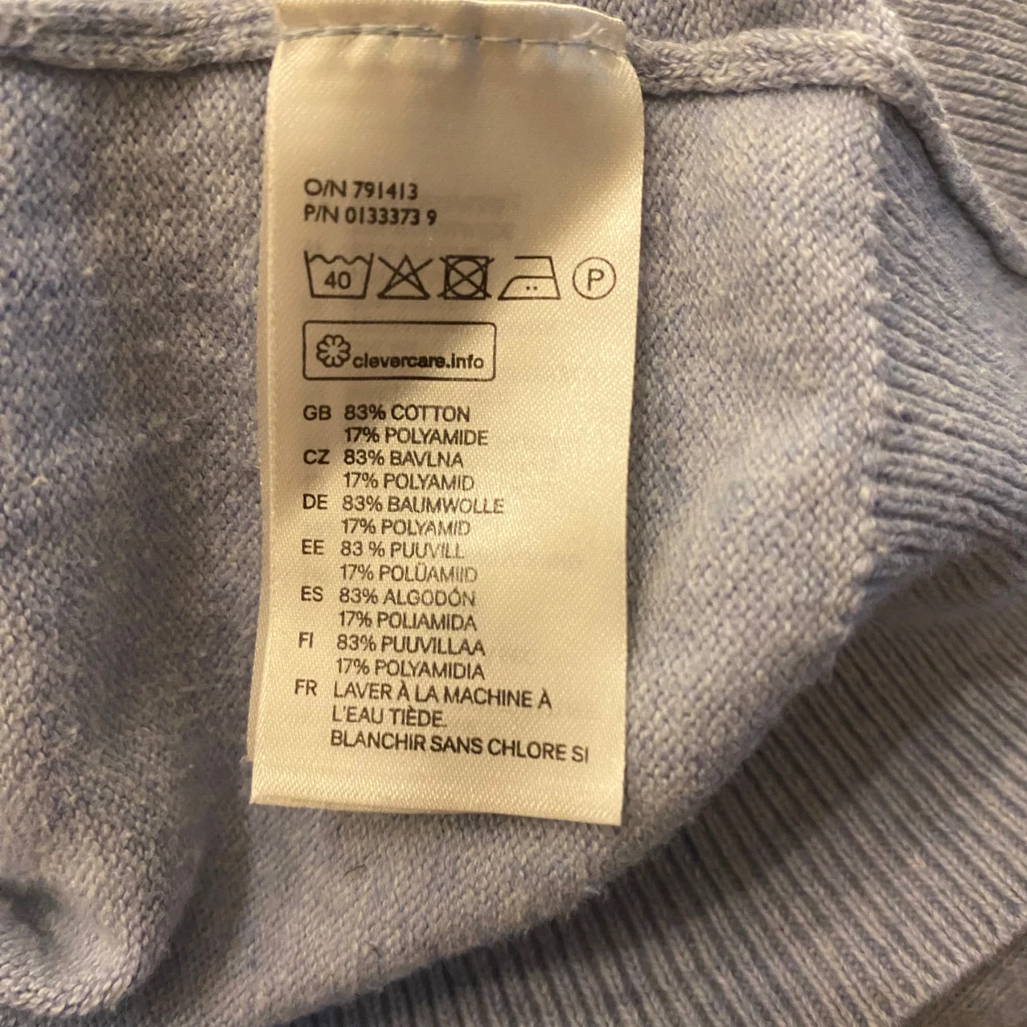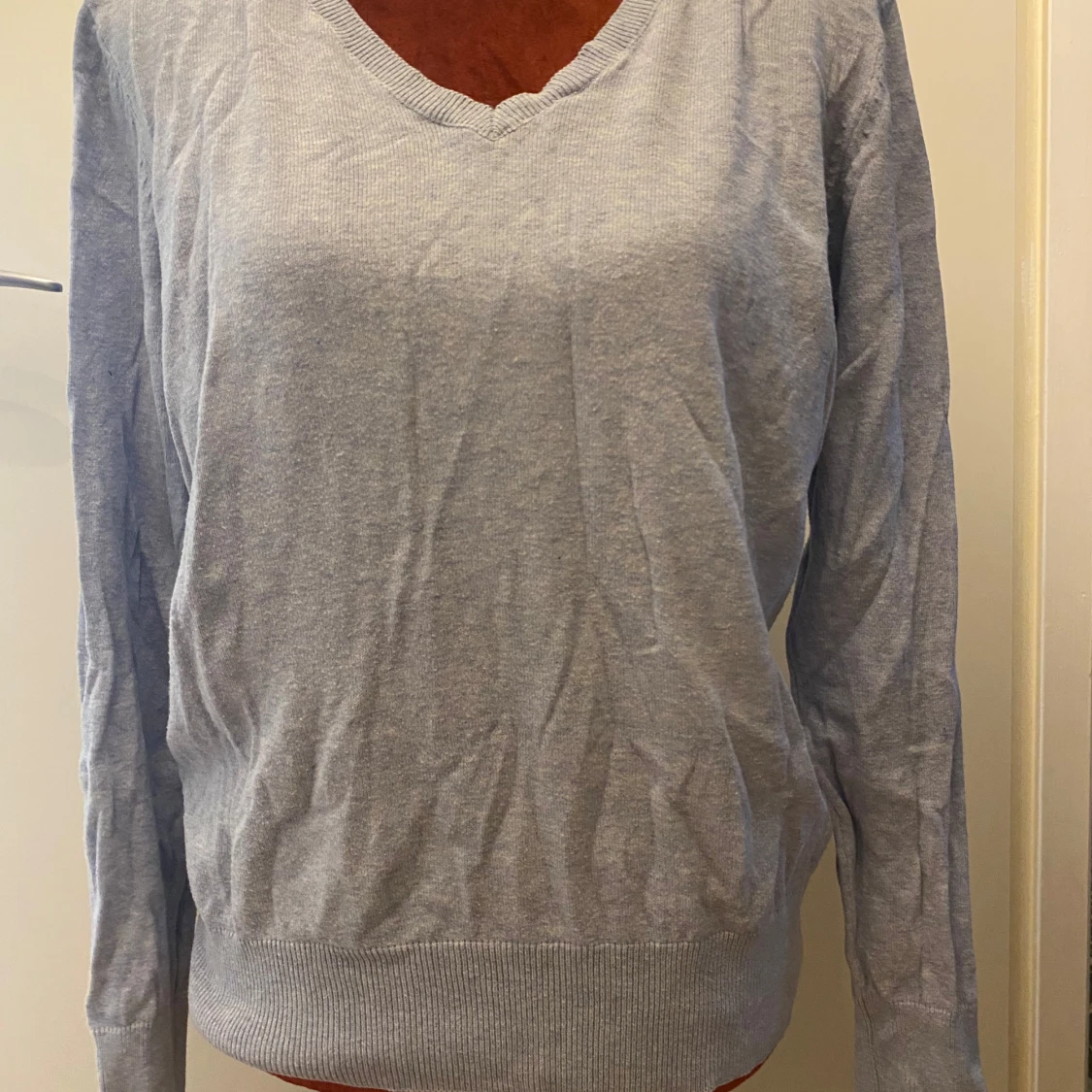 Ljusblå stickad tröja med V-ringning och långa ärmar. Ribbstickning vid halsringningen, ärmslut och nederkant. 87% bomull, 17% polyamid Längd: 64 cm, byst: 97 cm