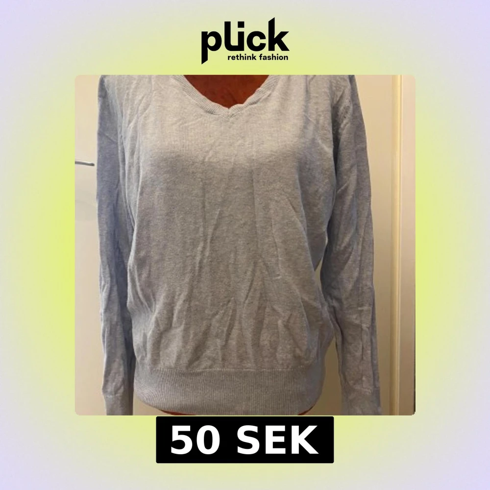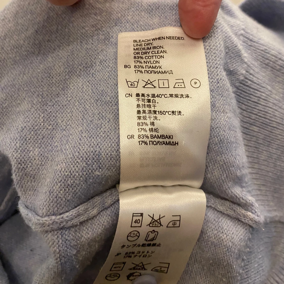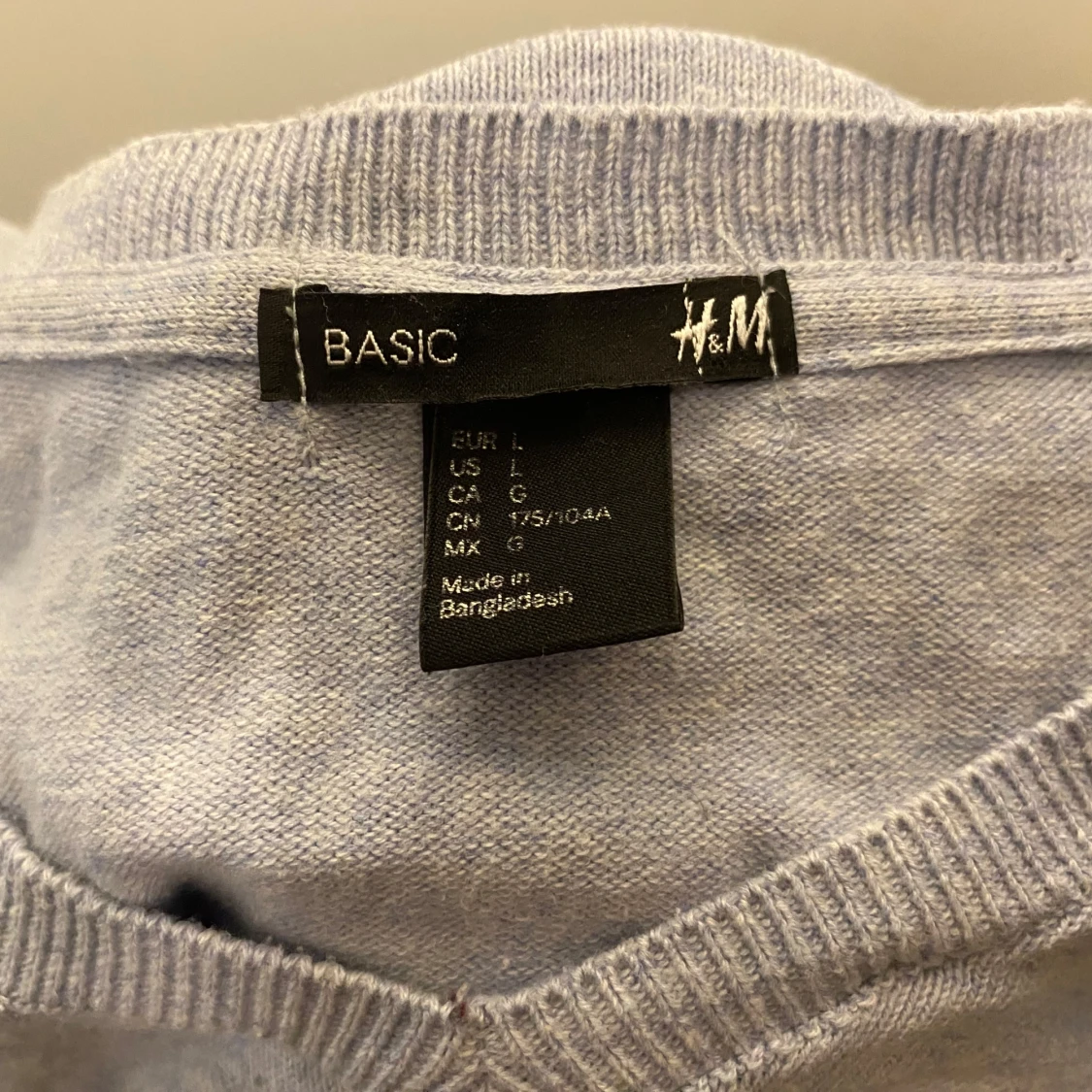 Ljusblå stickad tröja med V-ringning och långa ärmar. Ribbstickning vid halsringningen, ärmslut och nederkant. 87% bomull, 17% polyamid Längd: 64 cm, byst: 97 cm
