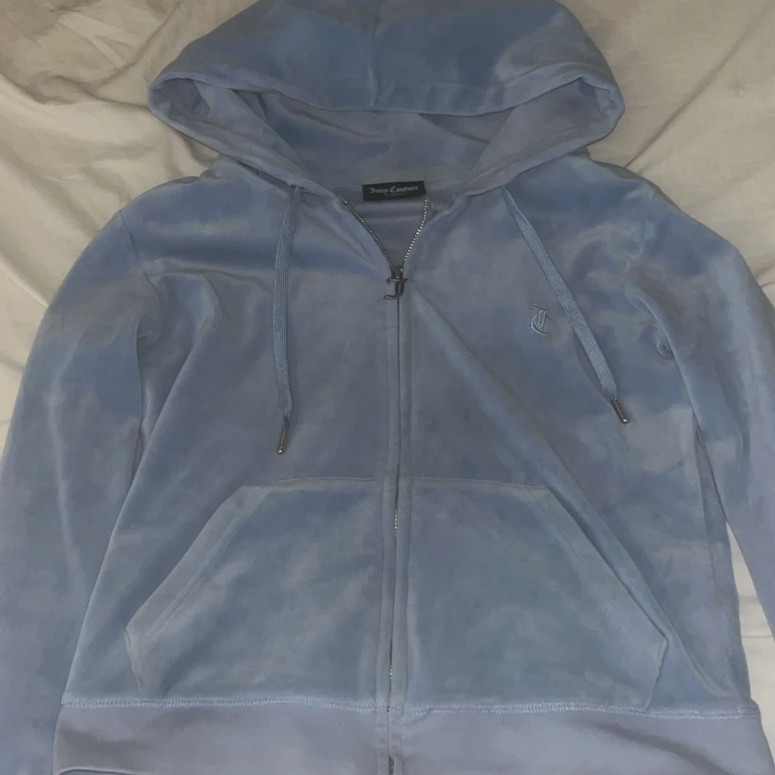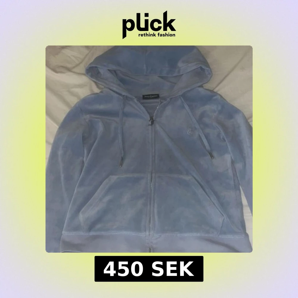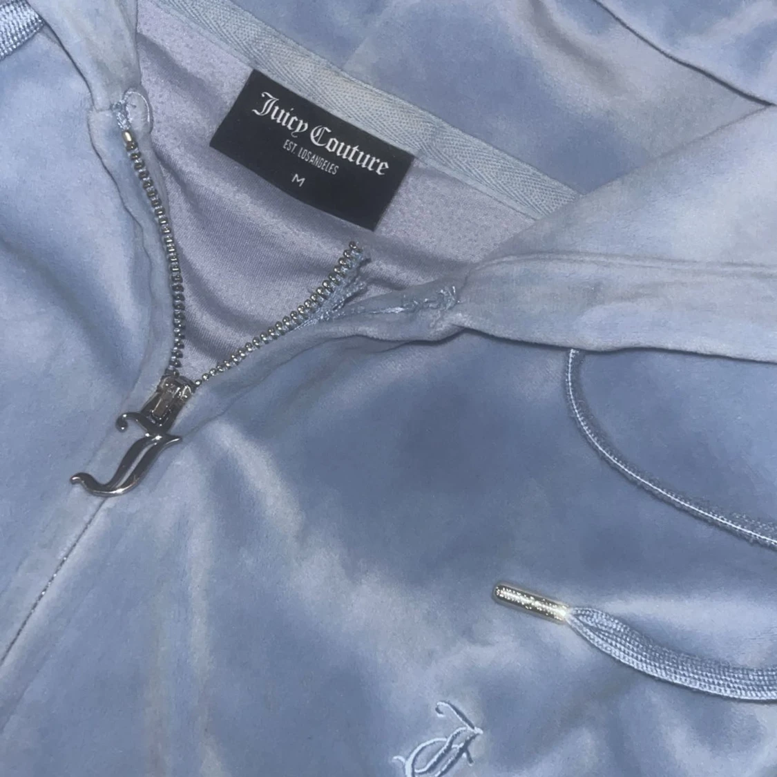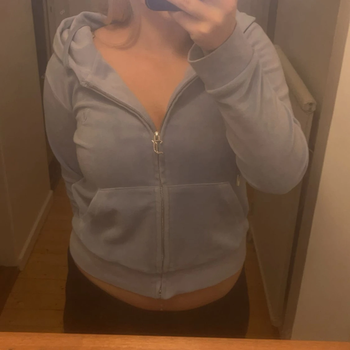 Supermjuk ljusblå hoodie från Juicy Couture i velour med dragkedja och huva. Klassisk JC-logga broderad på bröstet och snygga snören med metalländar. Croppad passform och känguruficka framtill. Perfekt för en chill och trendig look. Lite trasig längst upp i dragkedjan men det påverkar inget. Går att fixa.