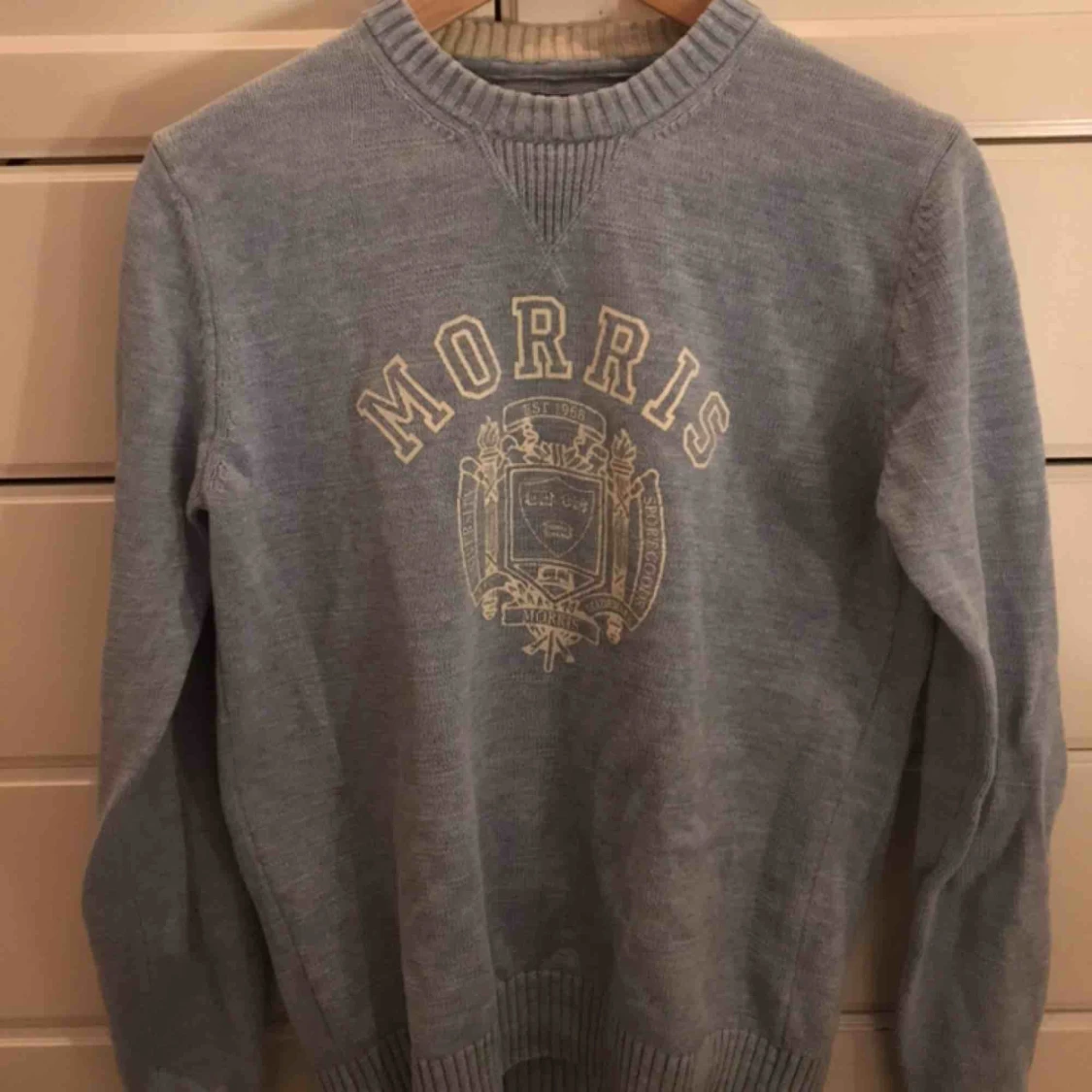 En ljusblå, stickad Morris tröja i mycket bra skick. Inga tydliga slitningar. Herrstorlek S. Möts upp i Stockholm.