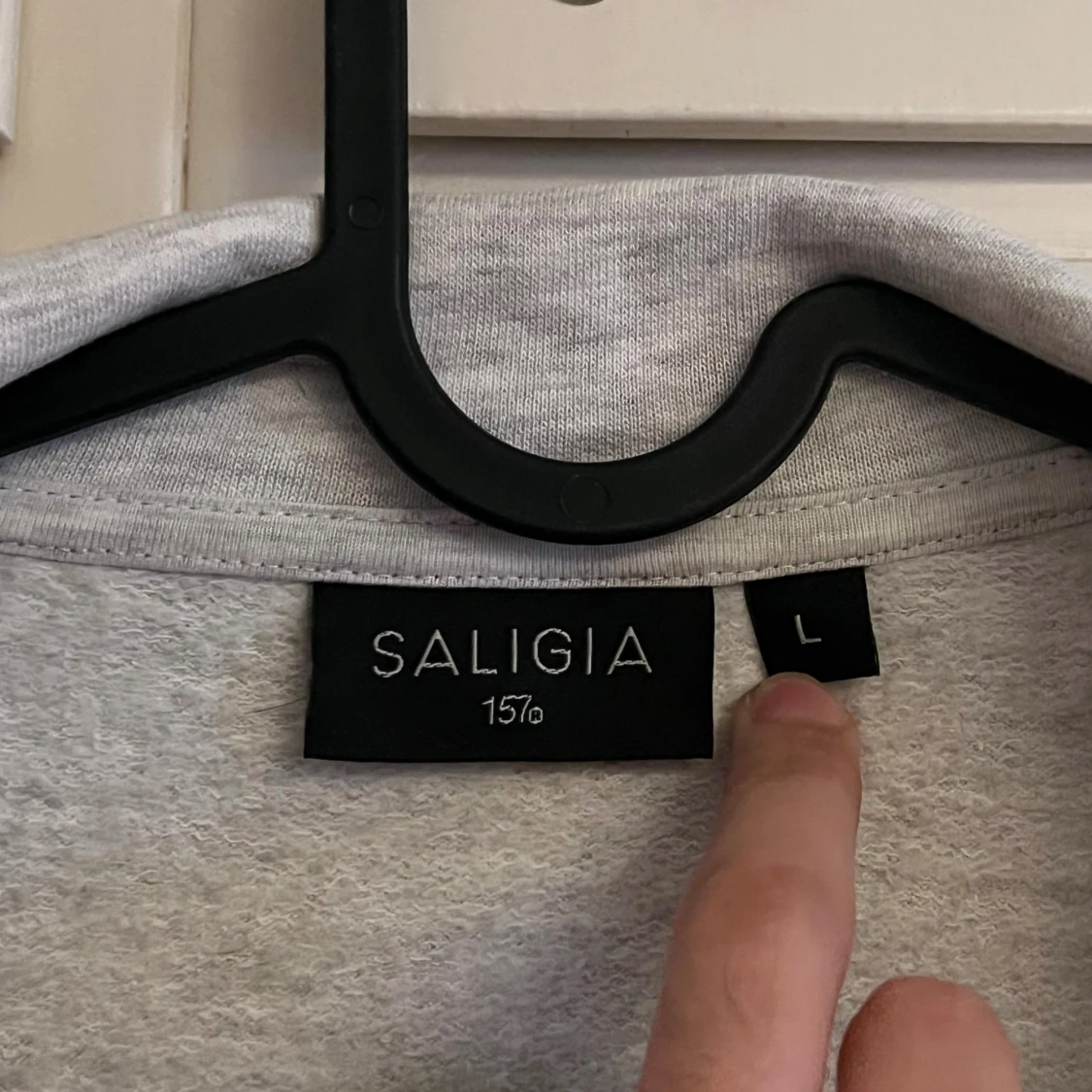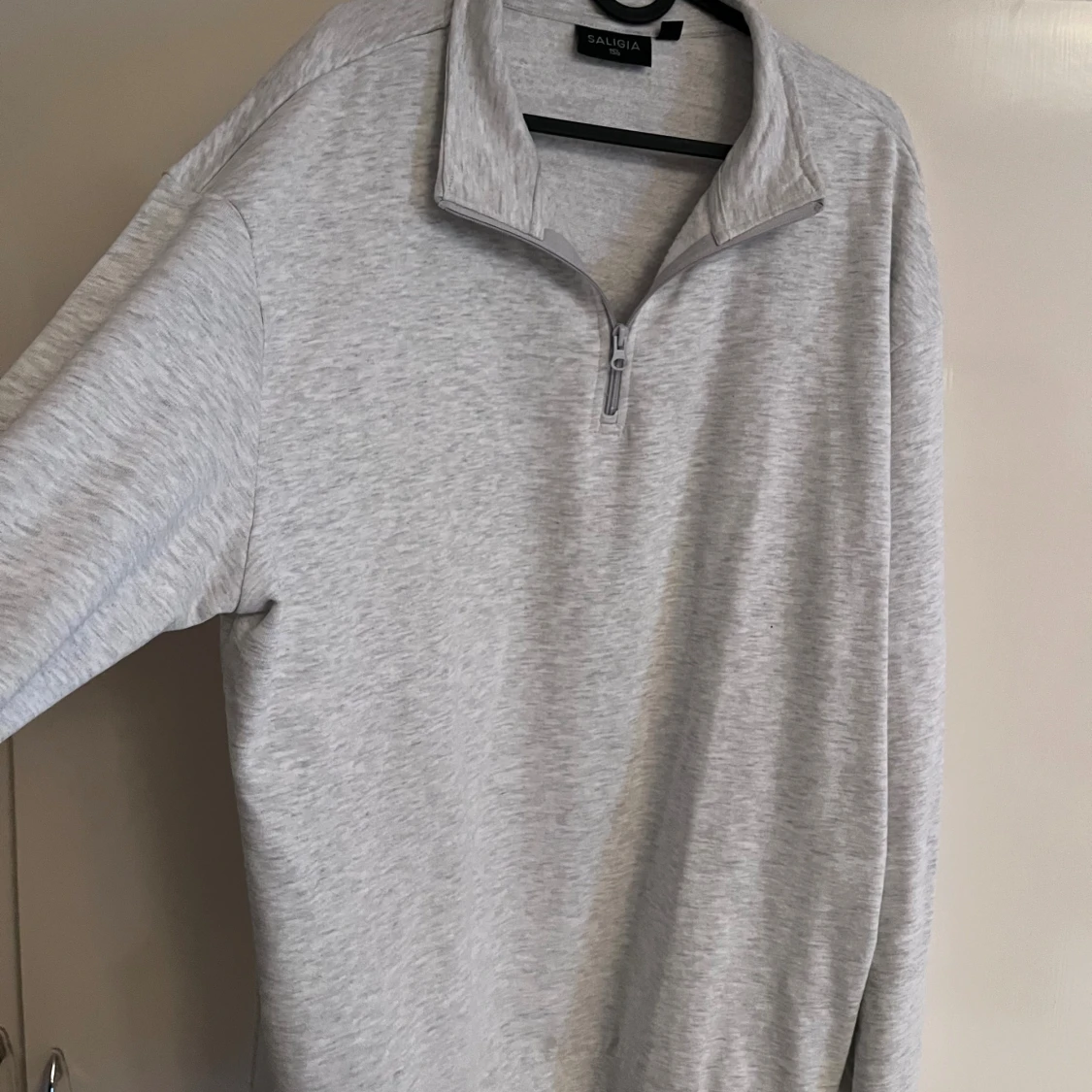Säljer en stilren ljusgrå långärmad tröja från Saligia i storlek L. Tröjan har en snygg half zip-dragkedja vid kragen och är tillverkad i mjukt bomullsmaterial. Perfekt för lager-på-lager och chill dagar.
