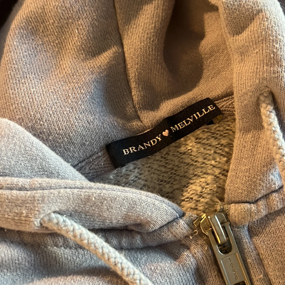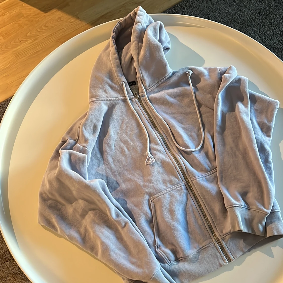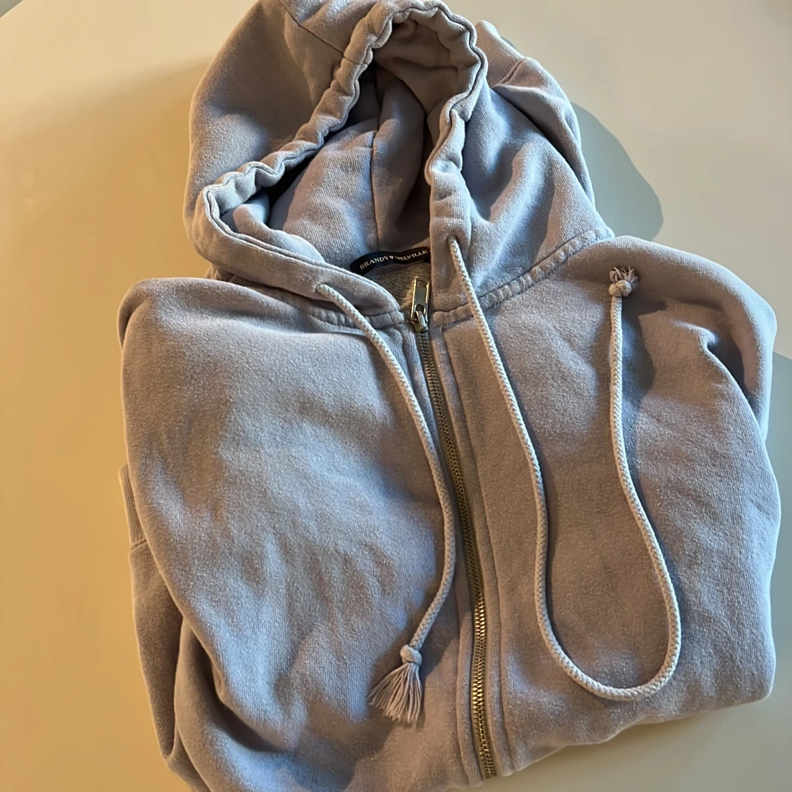 Mysig ljusblå hoodie från Brandy Melville med dragkedja framtill, huva med snörning och känguruficka. Tillverkad i mjuk bomullsmix, perfekt för chill dagar. Klassisk passform och långa ärmar.