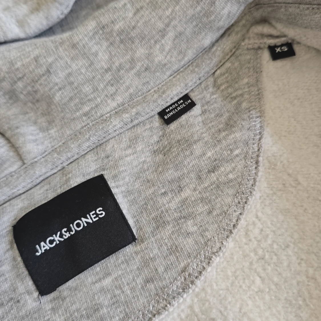 Säljer en ljusgrå hoodie från Jack & Jones i storlek XS. Tröjan har huva med snörning, hel dragkedja framtill och två fickor. Tillverkad i mjuk bomullsmix, perfekt för chill dagar. Enkel och stilren design som funkar till det mesta.