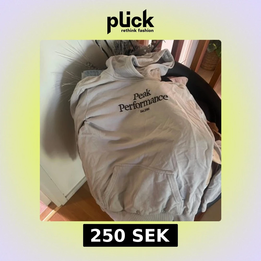 Säljer en ljusgrå hoodie från Peak Performance med svart logga på bröstet. Tröjan har huva, magficka och ribbade muddar. Perfekt för chill dagar eller när du vill ha en clean och enkel stil.