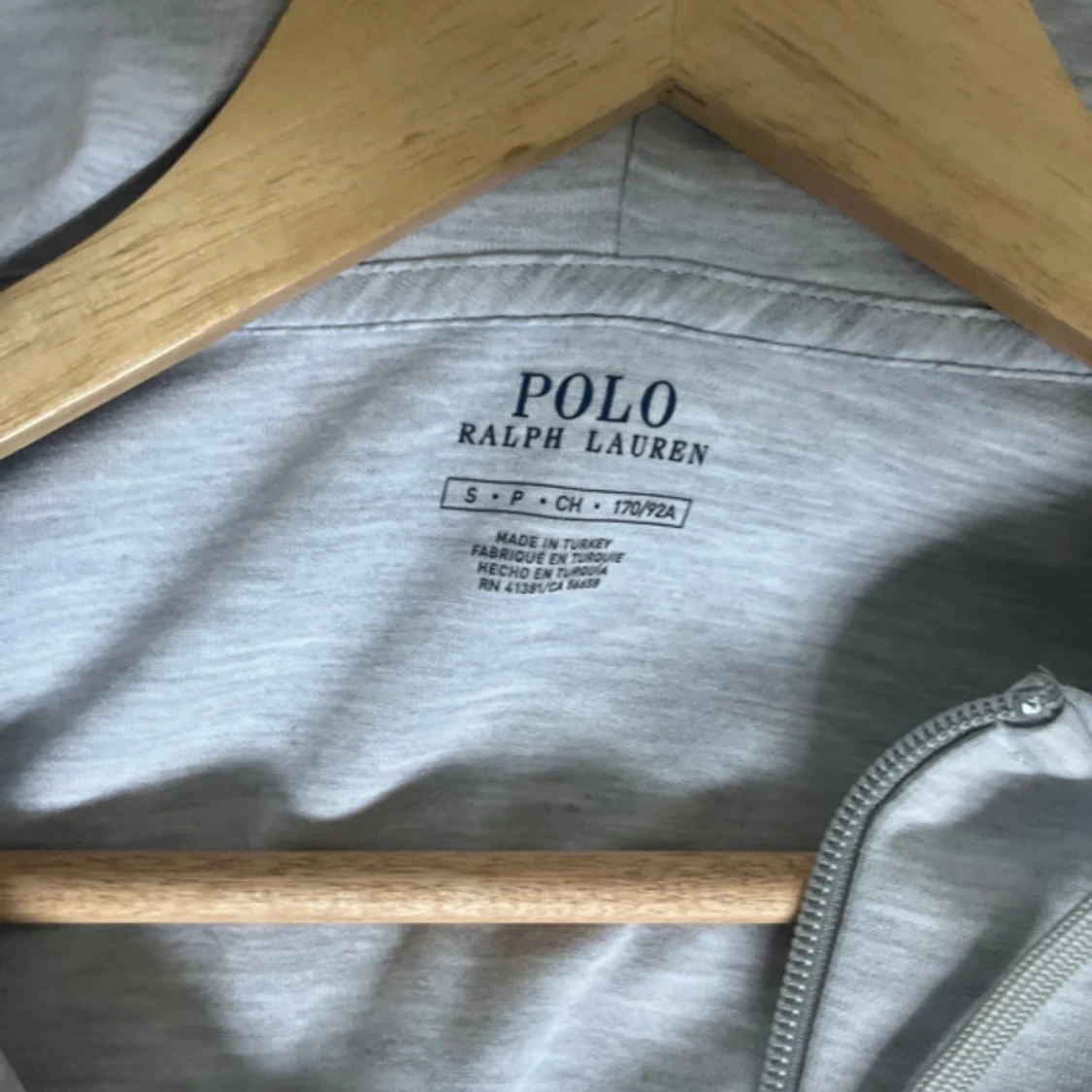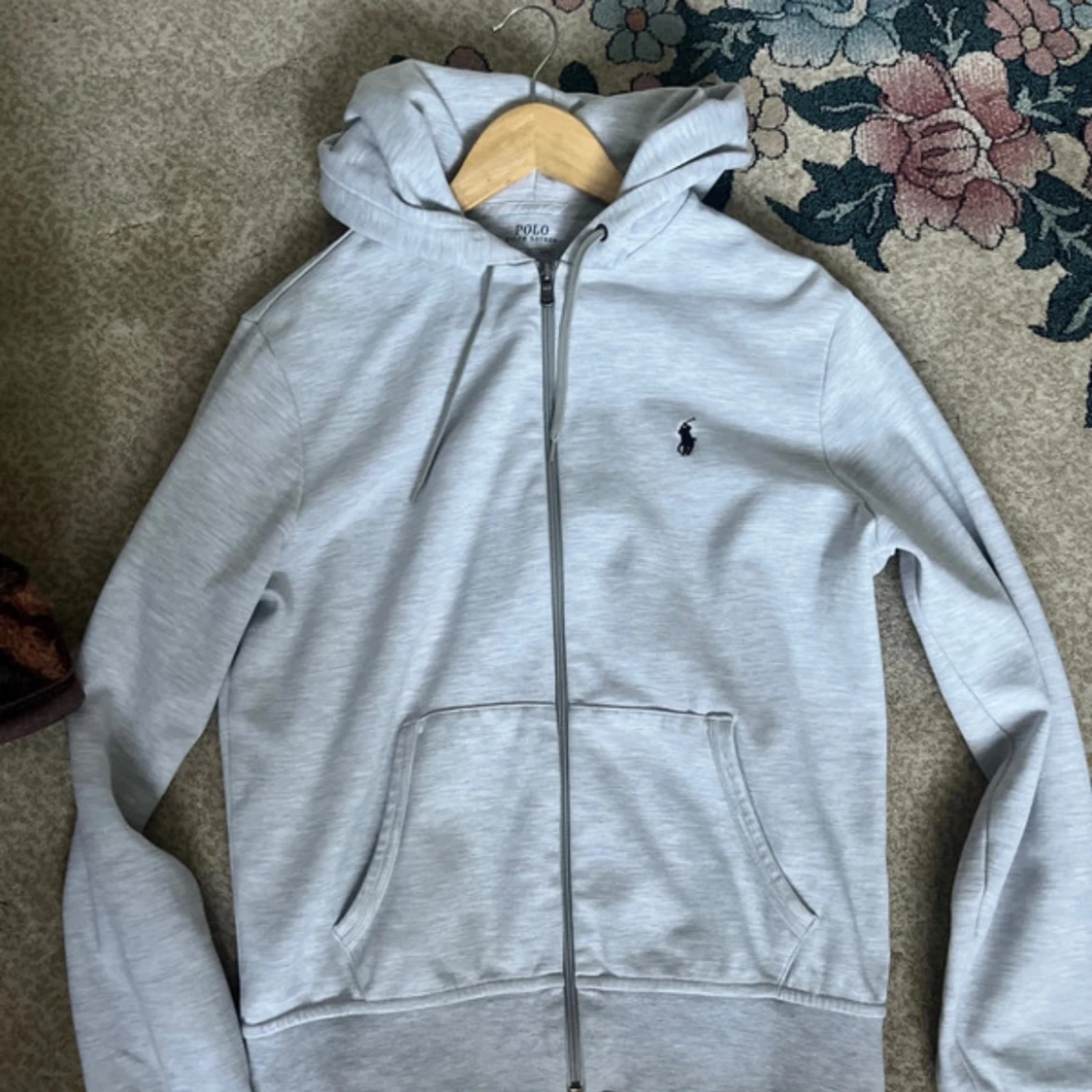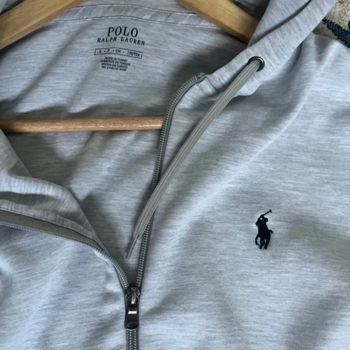 Säljer en stilren ljusgrå hoodie från Polo Ralph Lauren med dragkedja och klassisk broderad logga på bröstet. Tröjan har huva med snörning och två fickor framtill. Perfekt för en chill och avslappnad look.