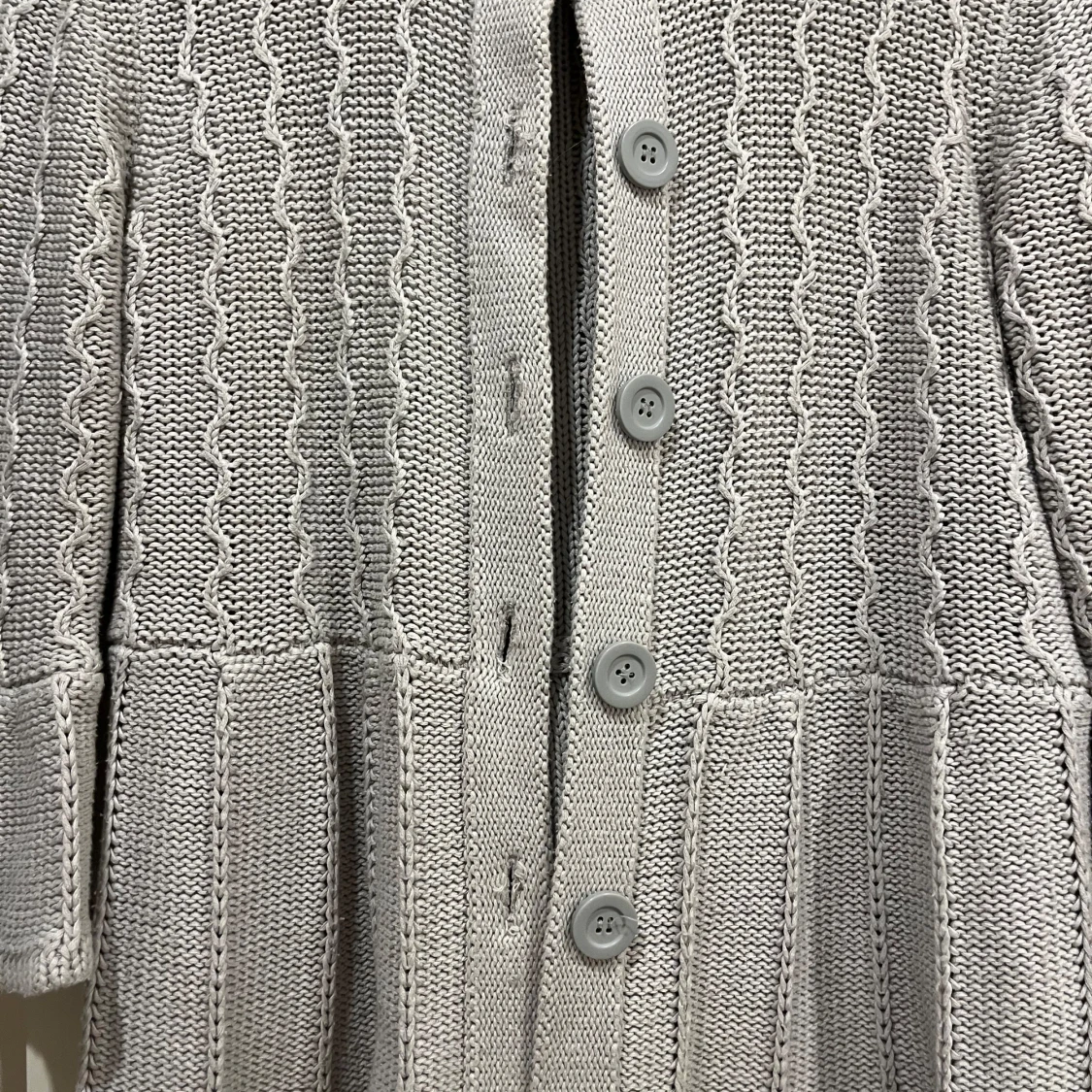 Supersöt ljusgrå kofta från Vero Moda med snyggt stickat mönster och stora knappar framtill. Koftan har lite utsvängda ärmar och rund halsringning. Perfekt att slänga över en topp för en chill och stilren look.3/4-ärmar!