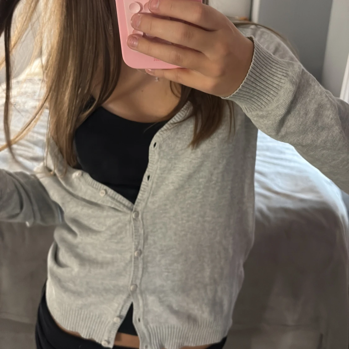 Säljer en ljusgrå kofta ifrån Zara med långa ärmar och knappar framtill. Koftan är ribbad vid ärmslut och nederkant, har en klassisk passform och är tillverkad i mjukt material som känns skönt mot huden. Perfekt att slänga över ett linne eller t-shirt. Strl S💞