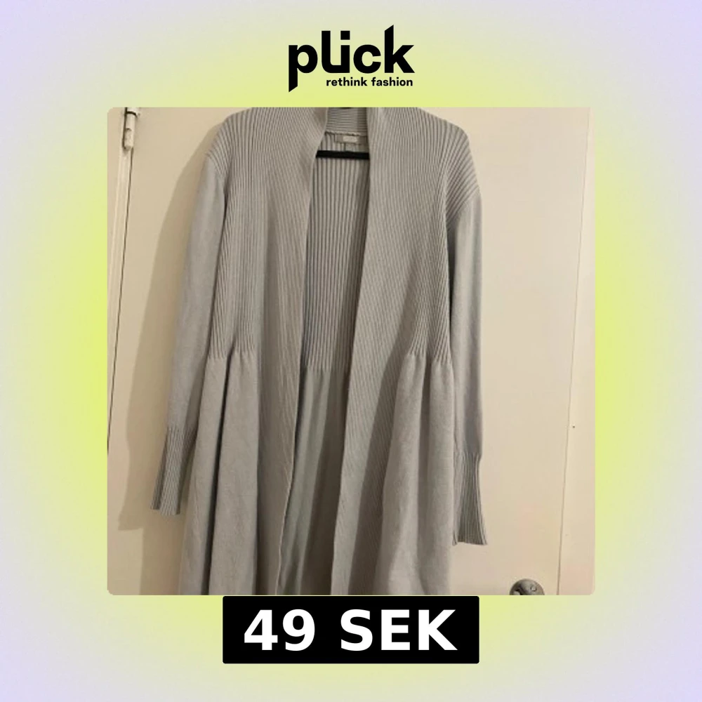 Säljer en lång, ljusgrå kofta från SCS med ribbade partier upptill och på ärmarna. Koftan är öppen framtill, har lång ärm och är tillverkad i ett mjukt stickat material. Perfekt att slänga på sig över en t-shirt eller topp för en chill look.