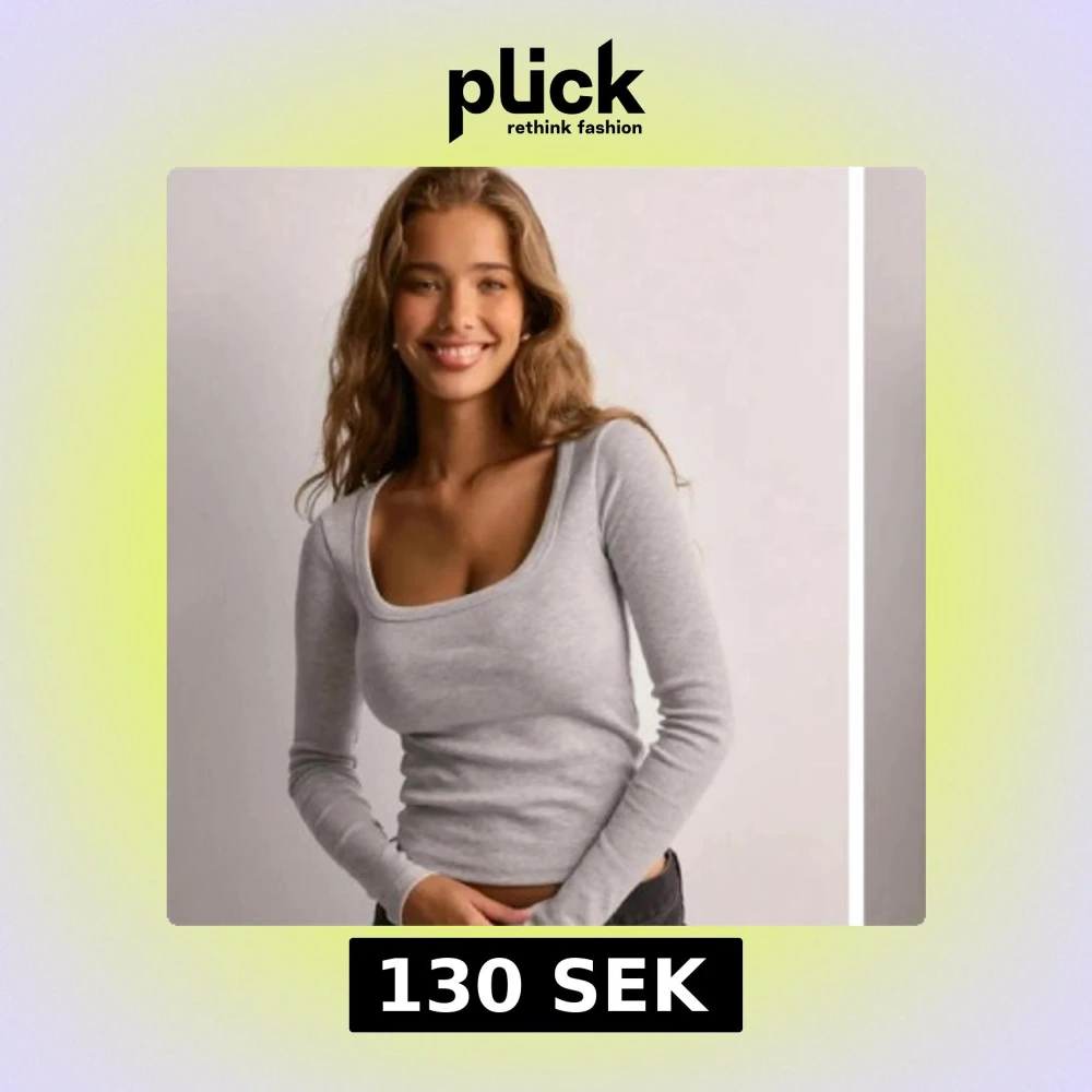 Säljer en ljusgrå långärmad topp med snygg fyrkantig ringning. Modellen är figurnära och passar perfekt till jeans eller kjol. Mjuk och stretchig bomullsblandning som känns skön mot huden.