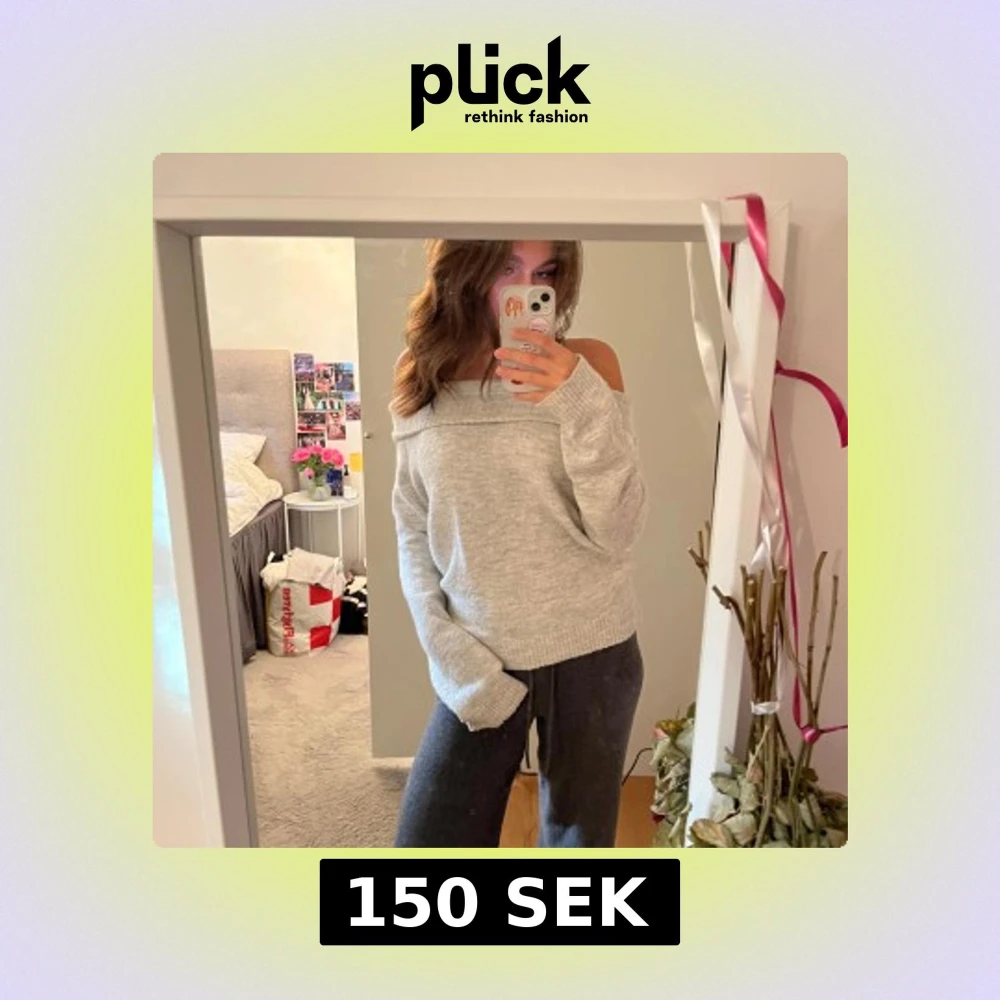 Supermysig ljusgrå stickad tröja med offshoulder-modell och bred krage. Tröjan har långa ärmar och en relaxed fit som ger en chill vibe. Perfekt för kalla dagar när du vill vara både snygg och bekväm.