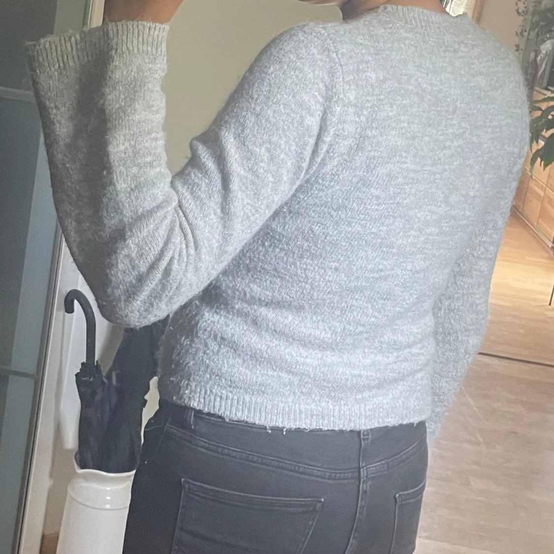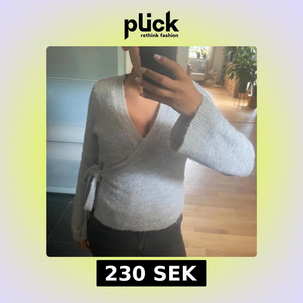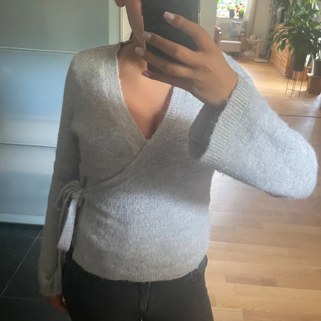 Supermysig ljusgrå stickad kofta med omlottmodell och knyt i sidan. Tröjan har lång ärm och är ribbad vid ärmslut och nederkant. Perfekt för lager-på-lager och chill dagar. Snygg och enkel att matcha med jeans eller kjol.