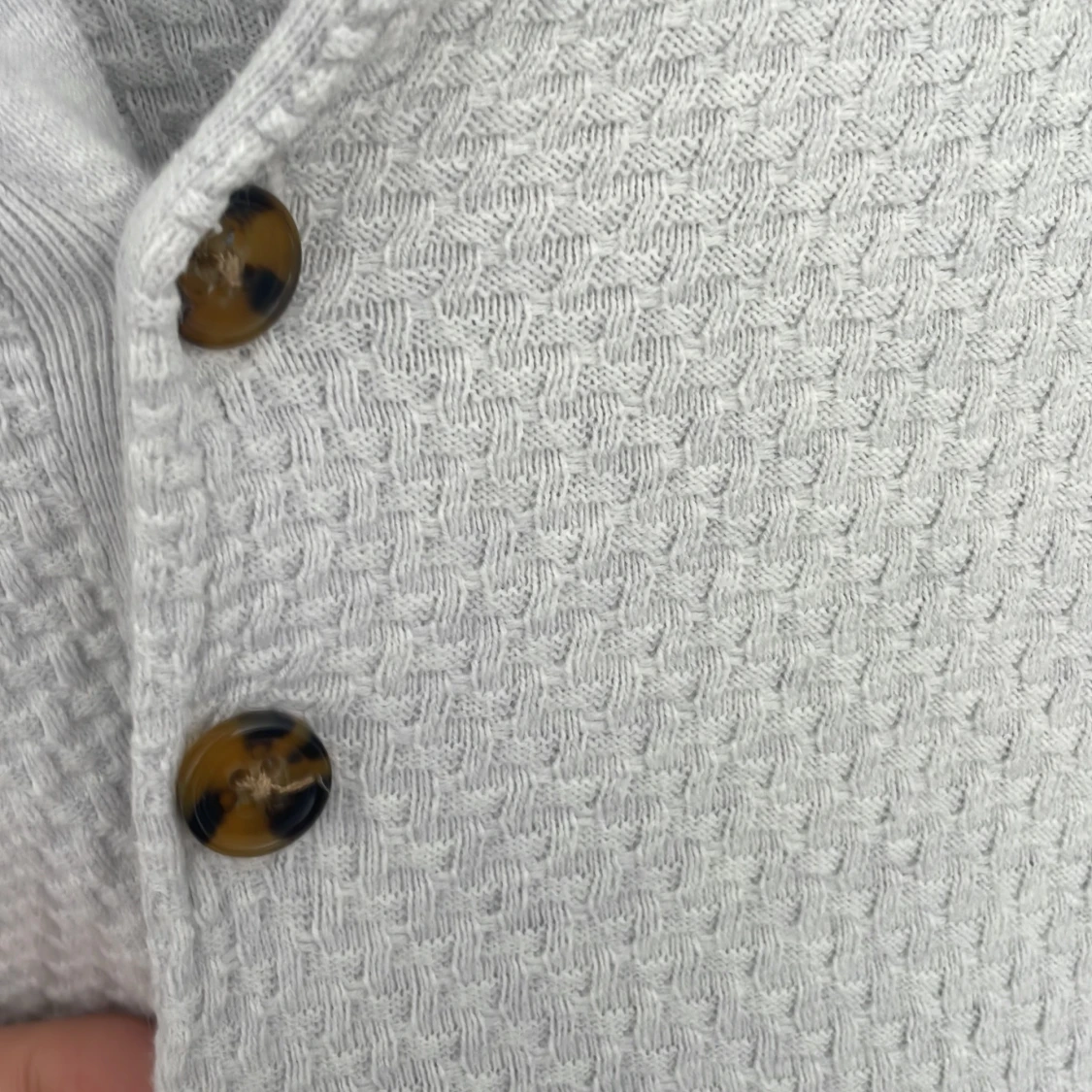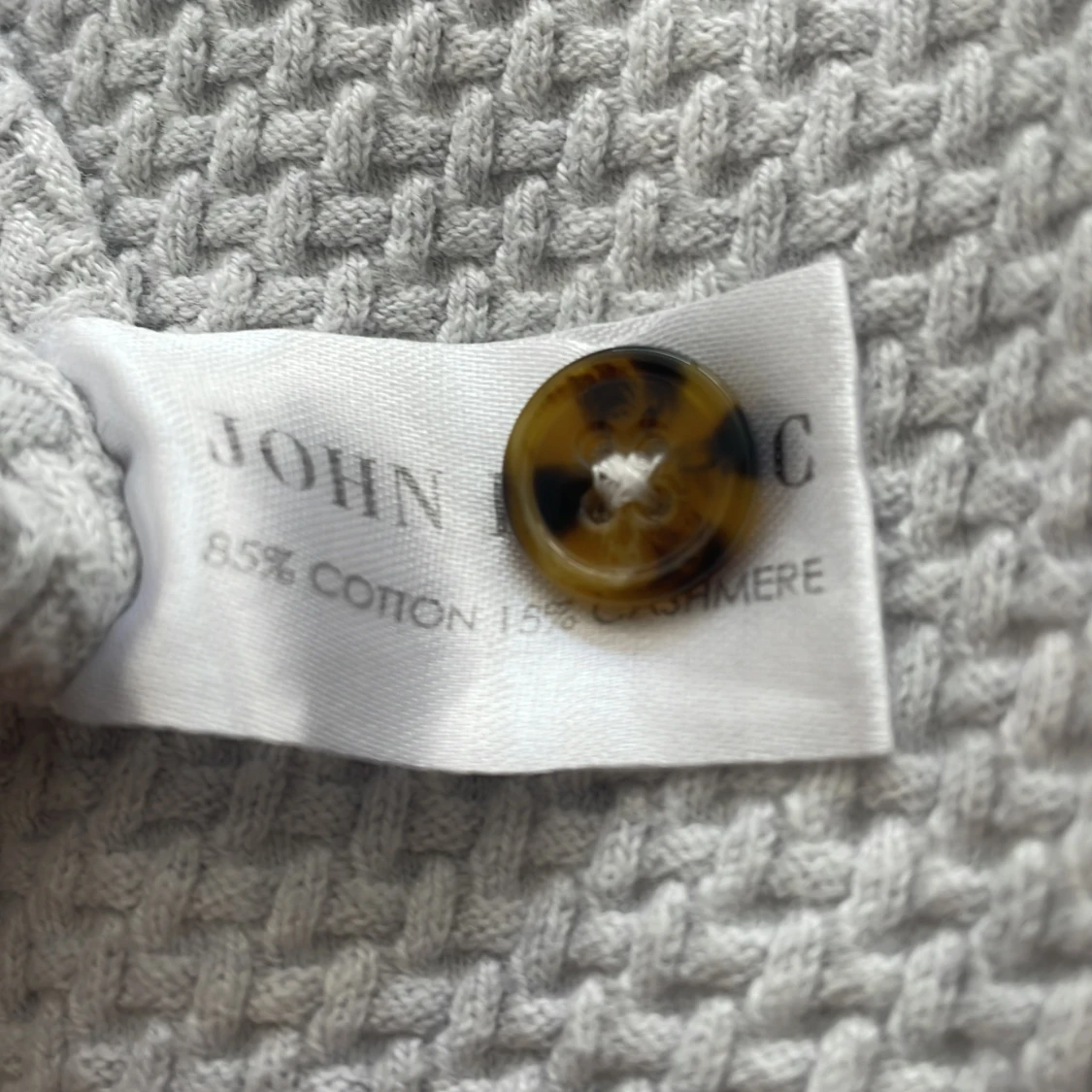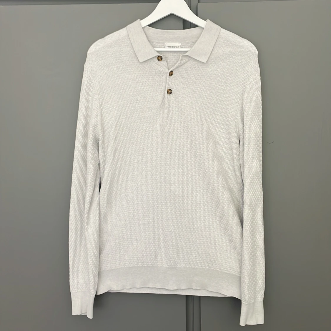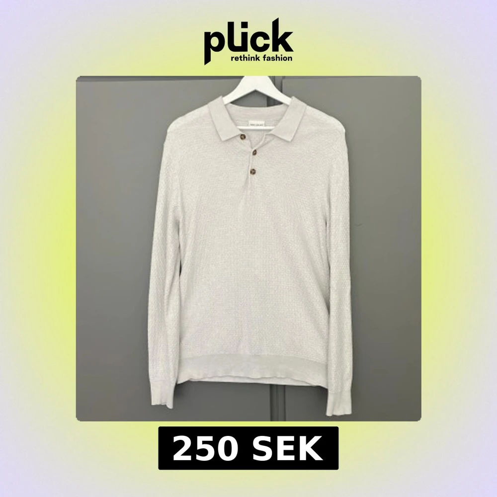 Säljer en ljusgrå stickad pikétröja från John Henric. Tröjan har lång ärm, klassisk krage och tre bruna knappar framtill. Materialet är en blandning mellan 85% bommul och 15% kashmir. Skick 10/10. Nypris: 1000kr