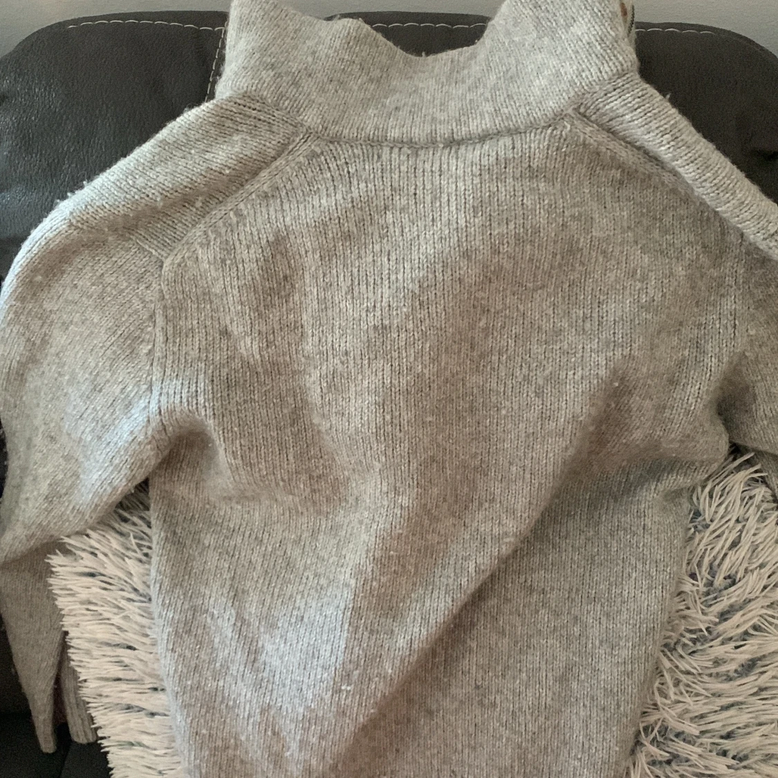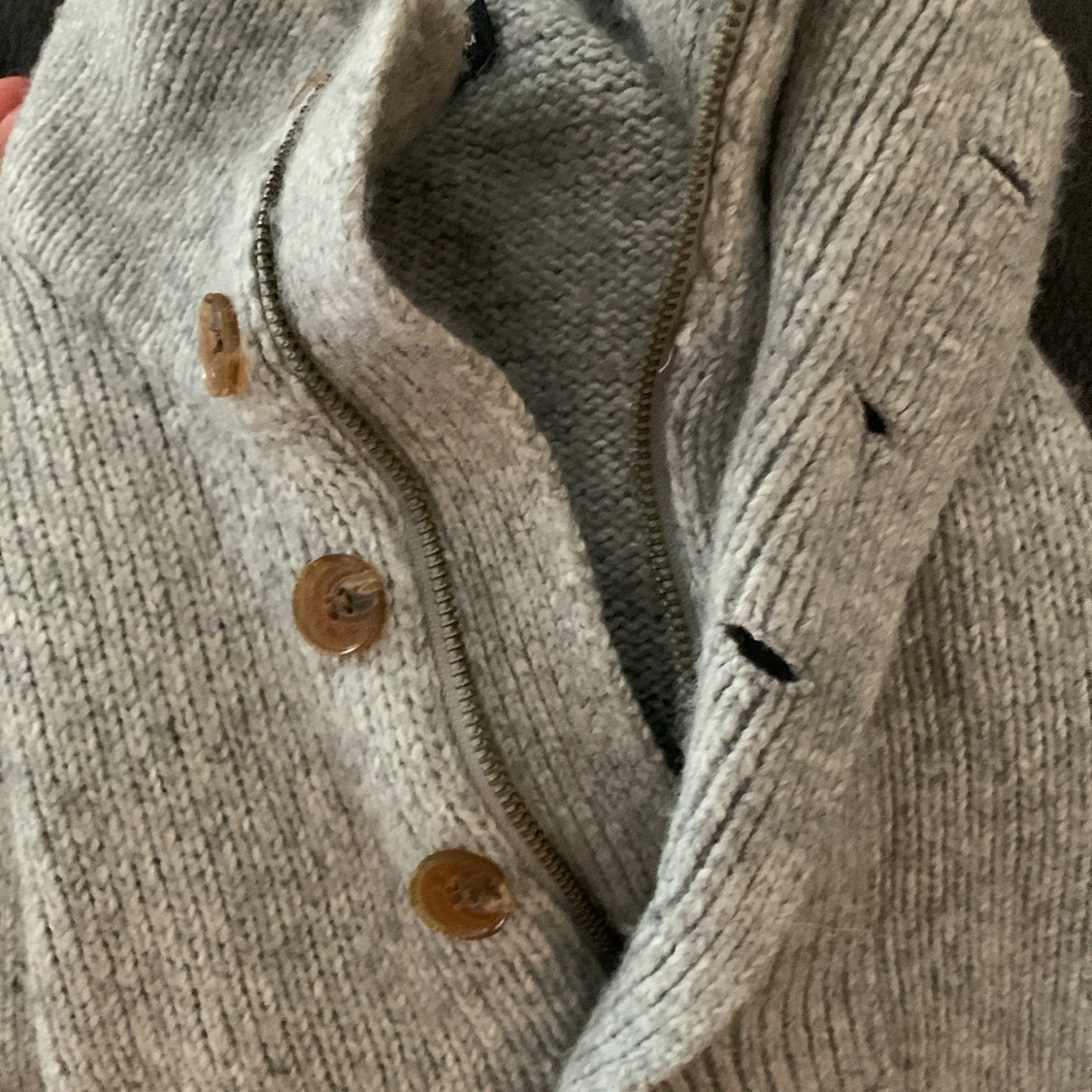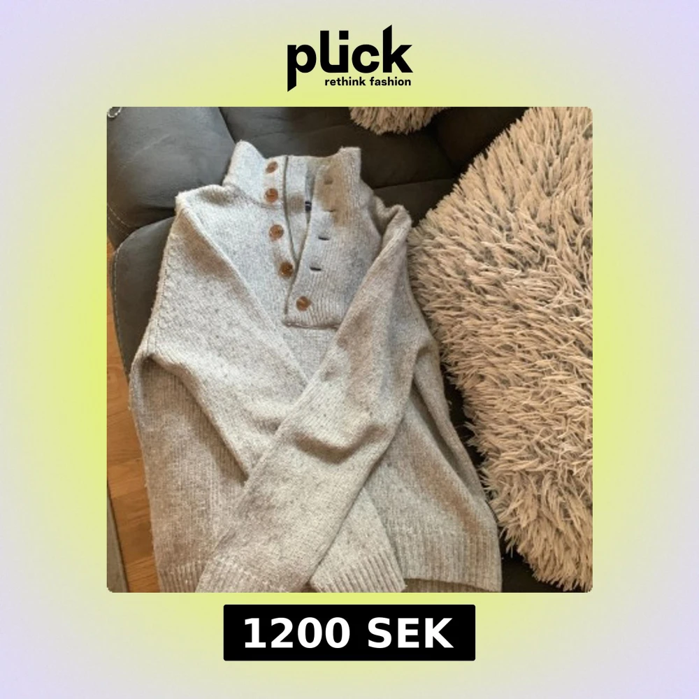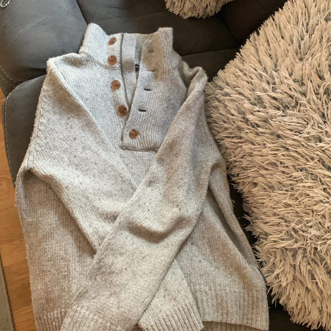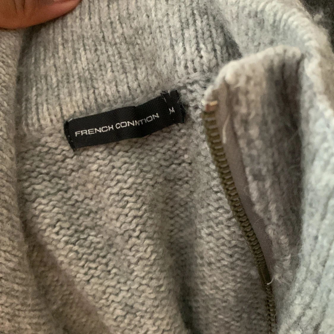 Säljer en ljusgrå stickad tröja från French Connection med hög krage, knappar och dragkedja framtill. Tröjan har långa ärmar och ribbade muddar. Perfekt för kyliga dagar och enkel att matcha med olika outfits.