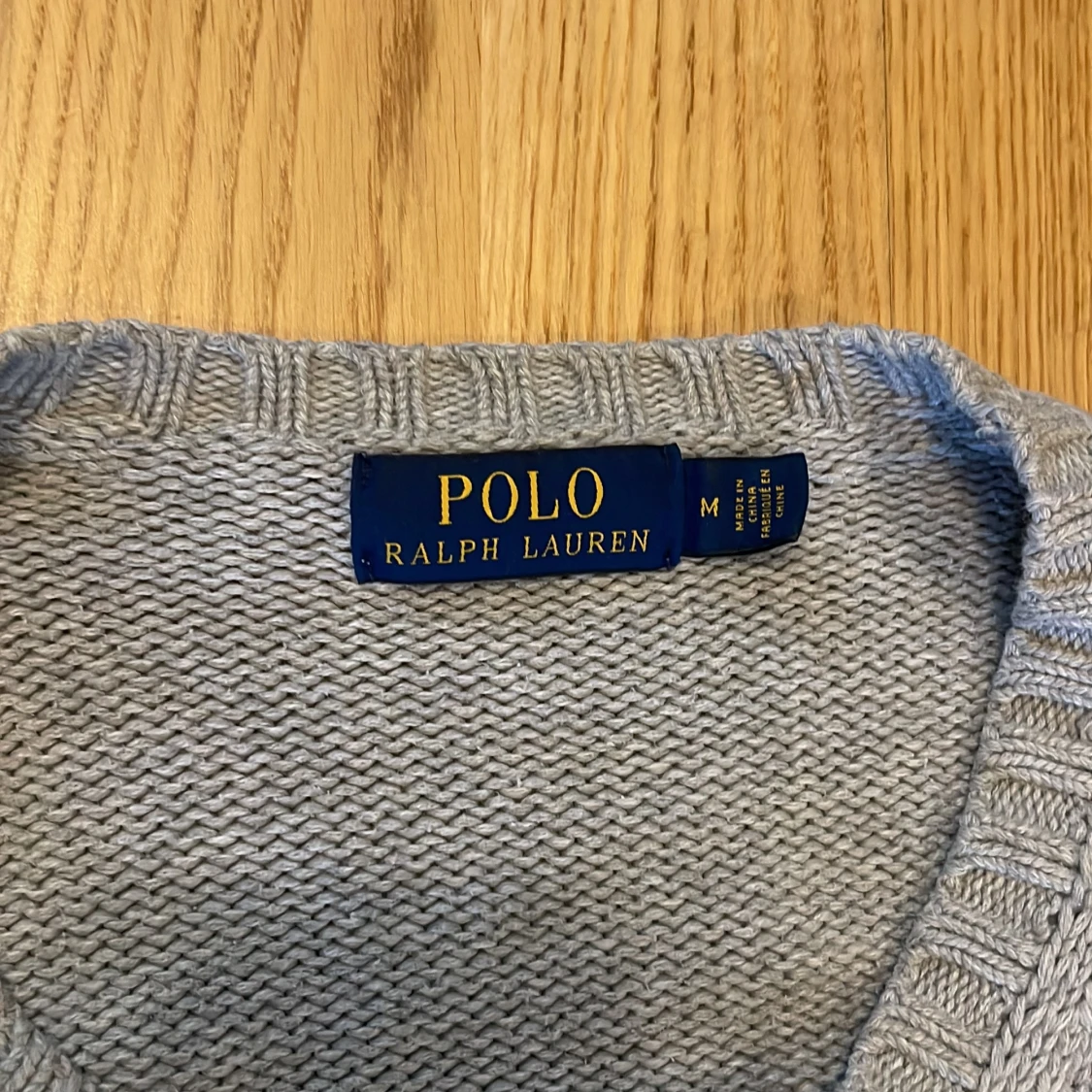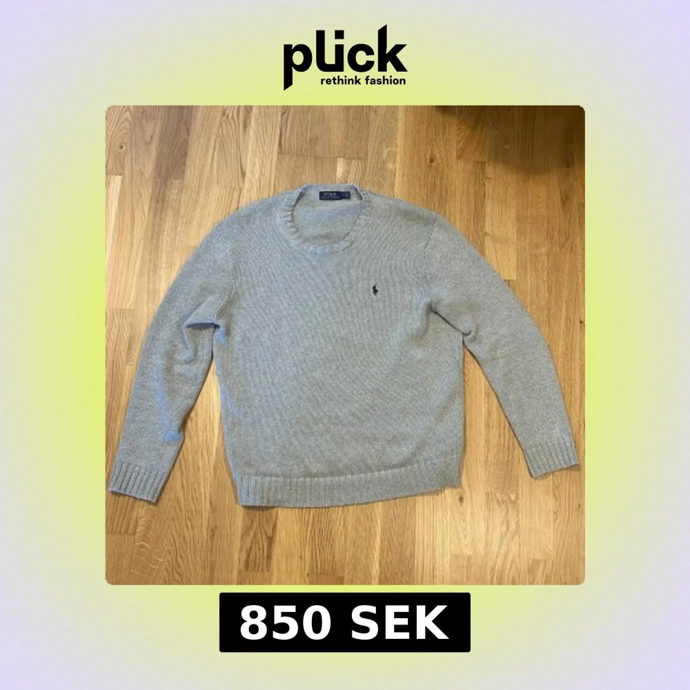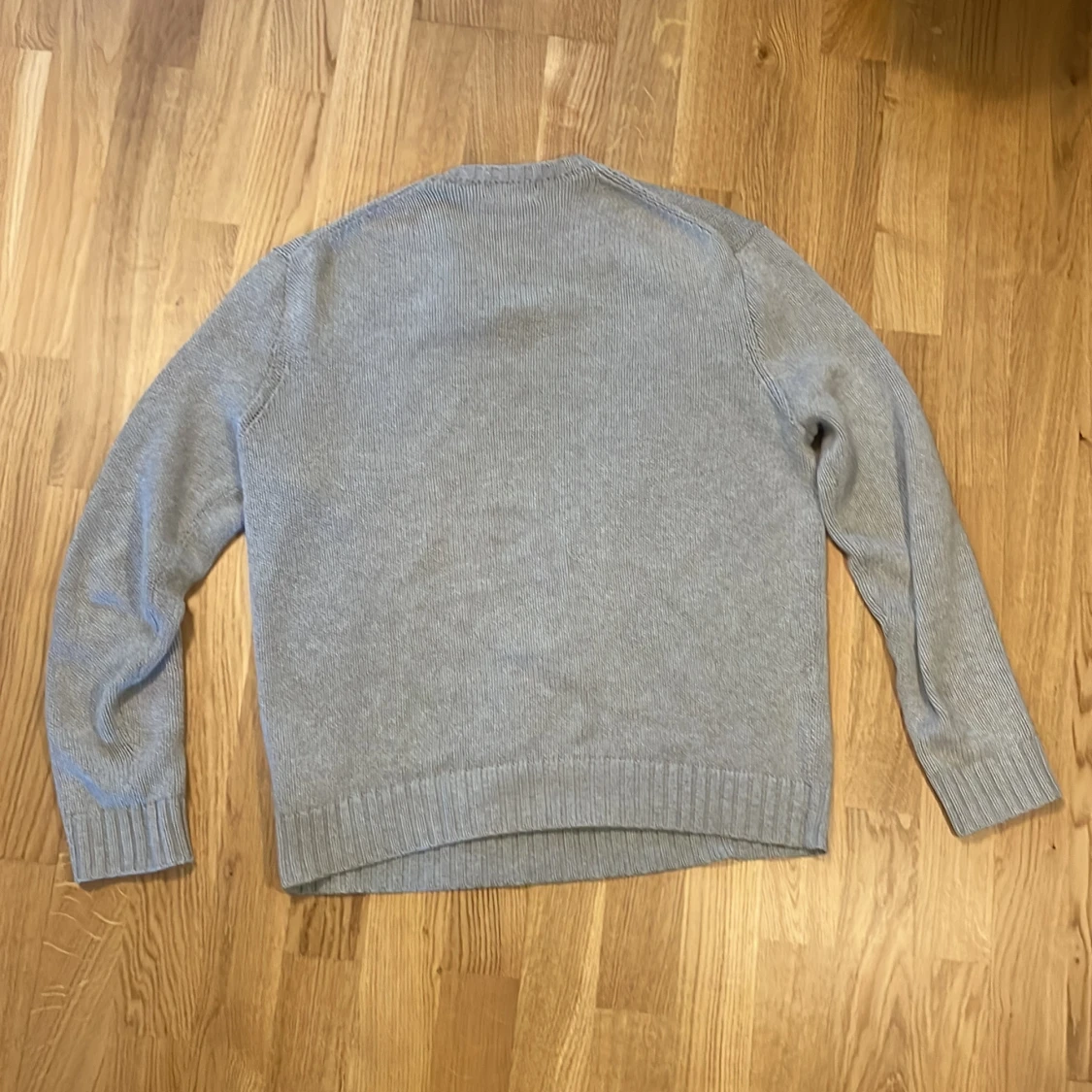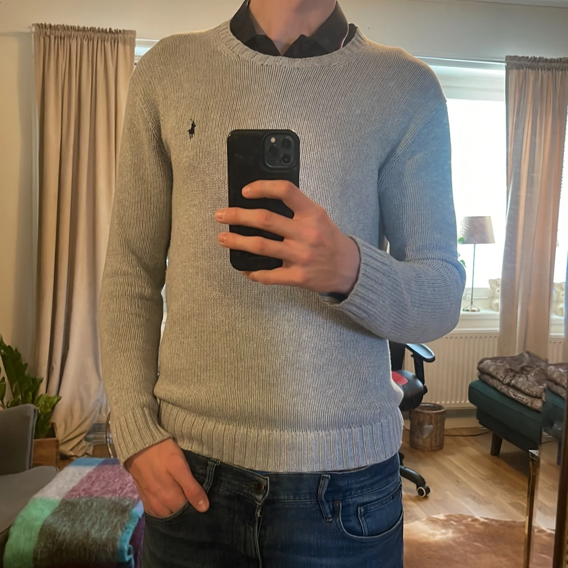 Säljer en klassisk ljusgrå stickad tröja från Polo Ralph Lauren med rund halsringning och den ikoniska broderade loggan på bröstet. Tröjan har långa ärmar och ribbade muddar vid ärmslut och nederkant. Perfekt för lager-på-lager-stil.