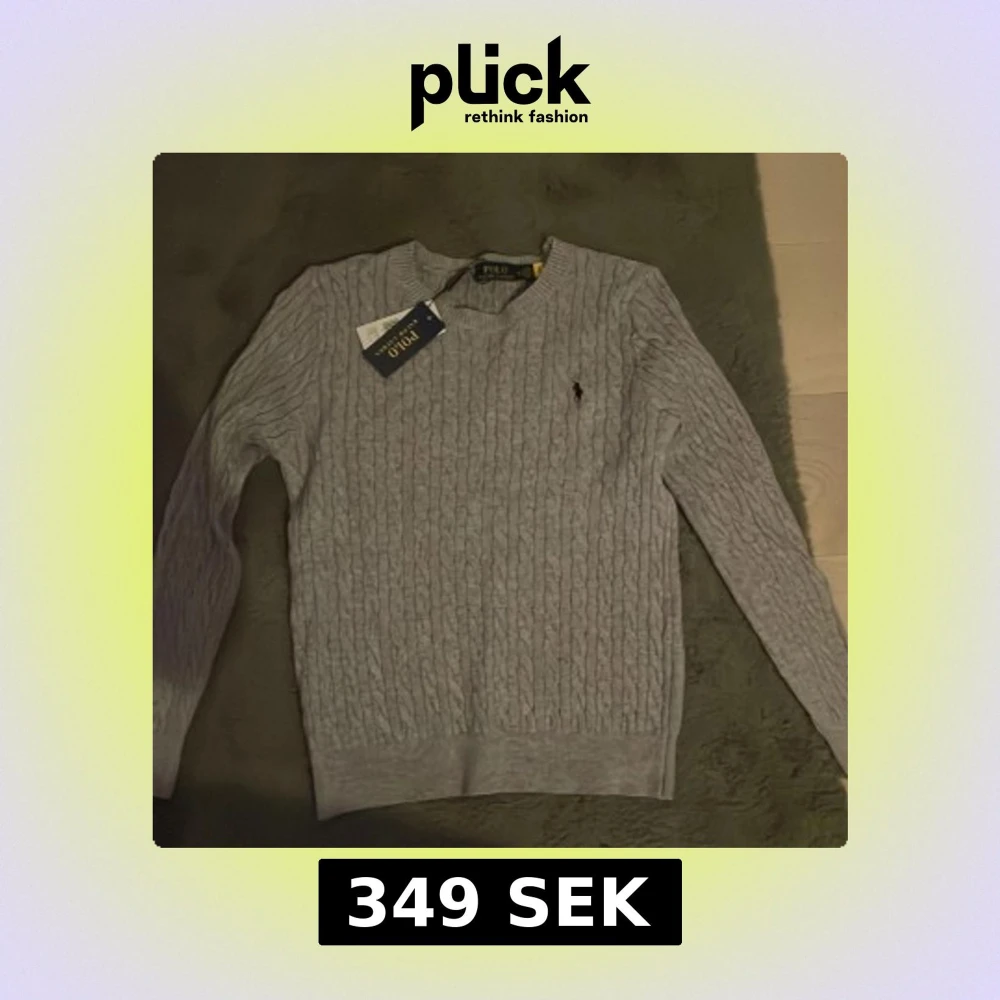 Snygg ljusgrå stickad tröja från Polo Ralph Lauren med klassiskt kabelstickat mönster och broderad logga på bröstet. Rund hals och långa ärmar, perfekt för att hålla värmen under kyliga dagar.