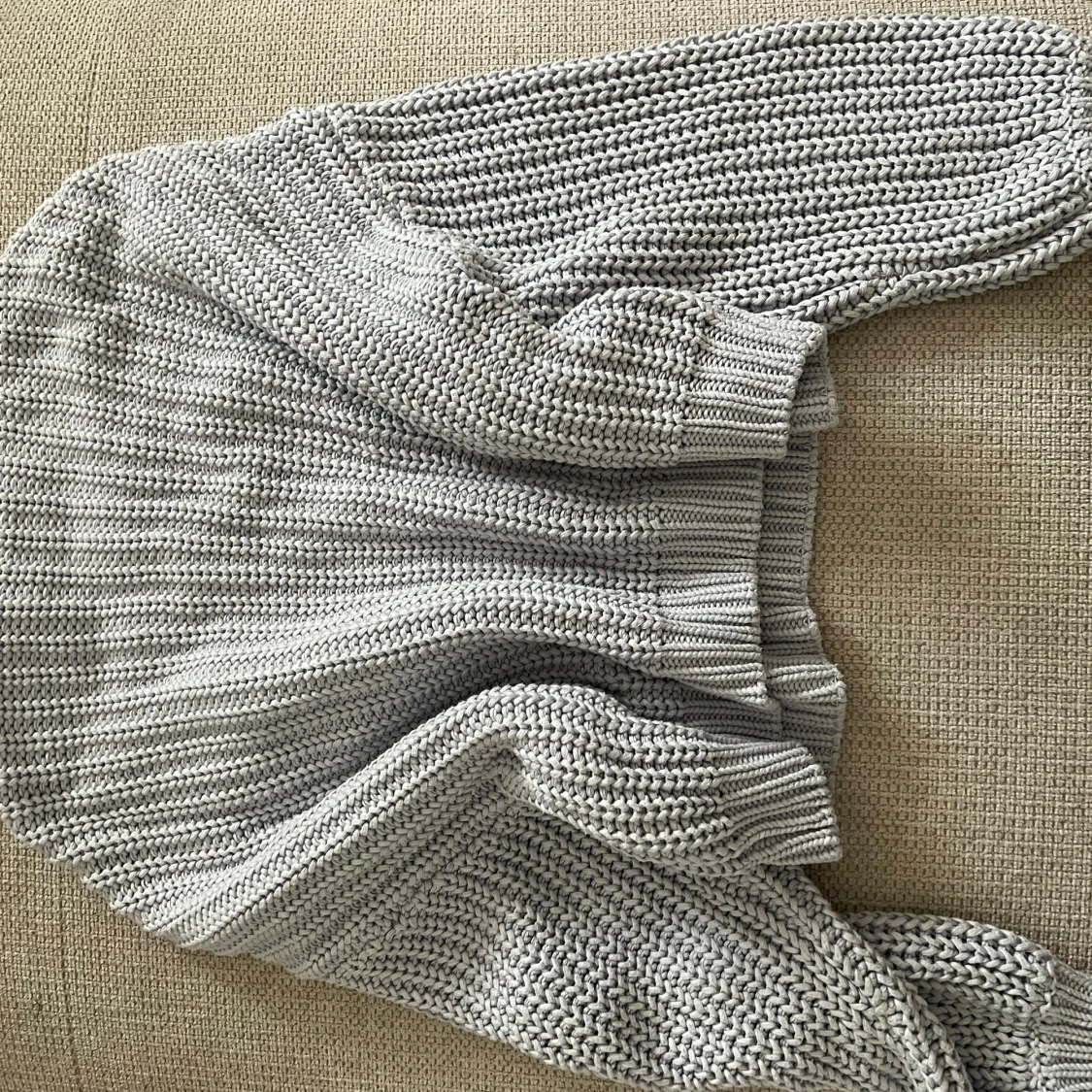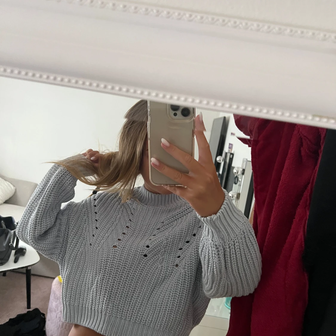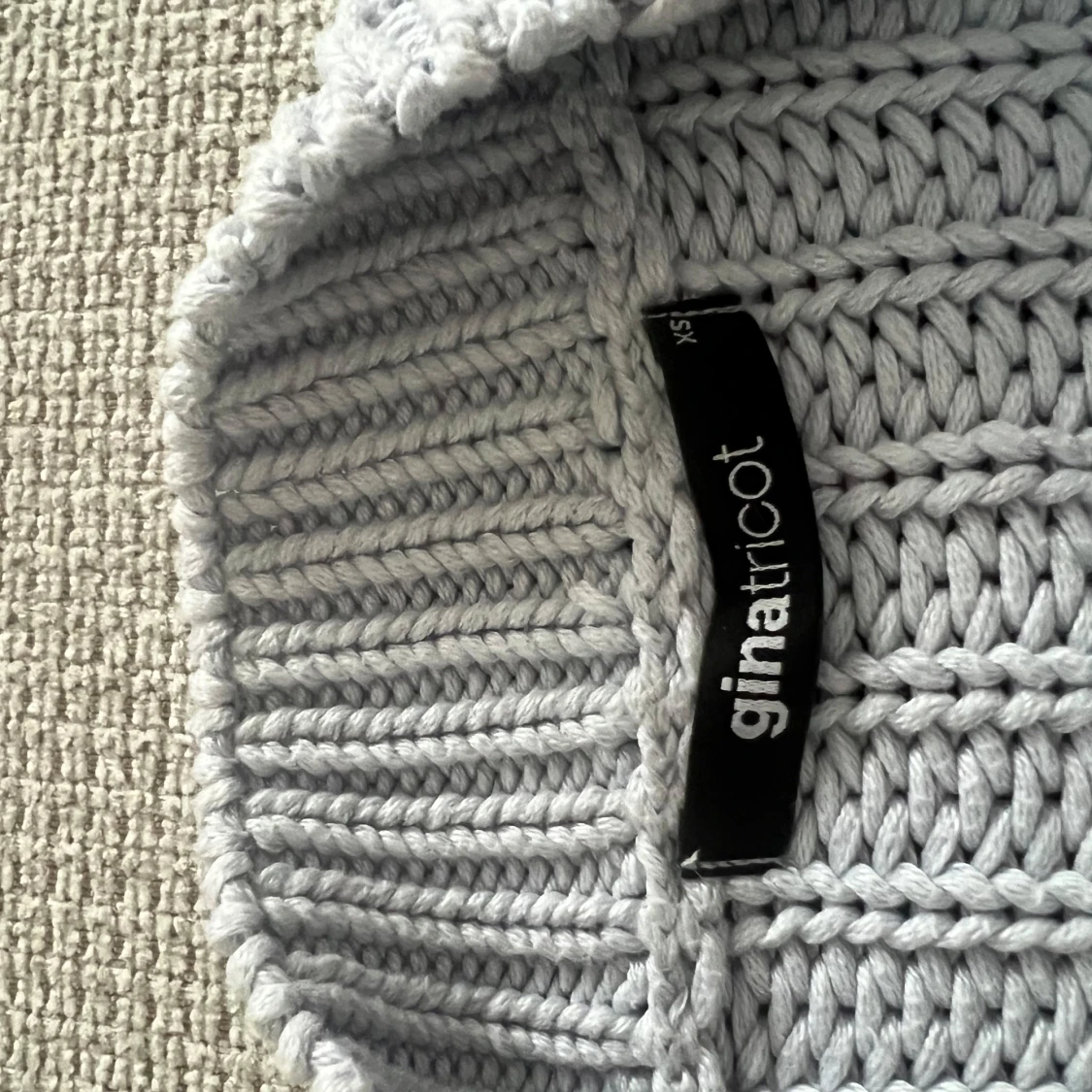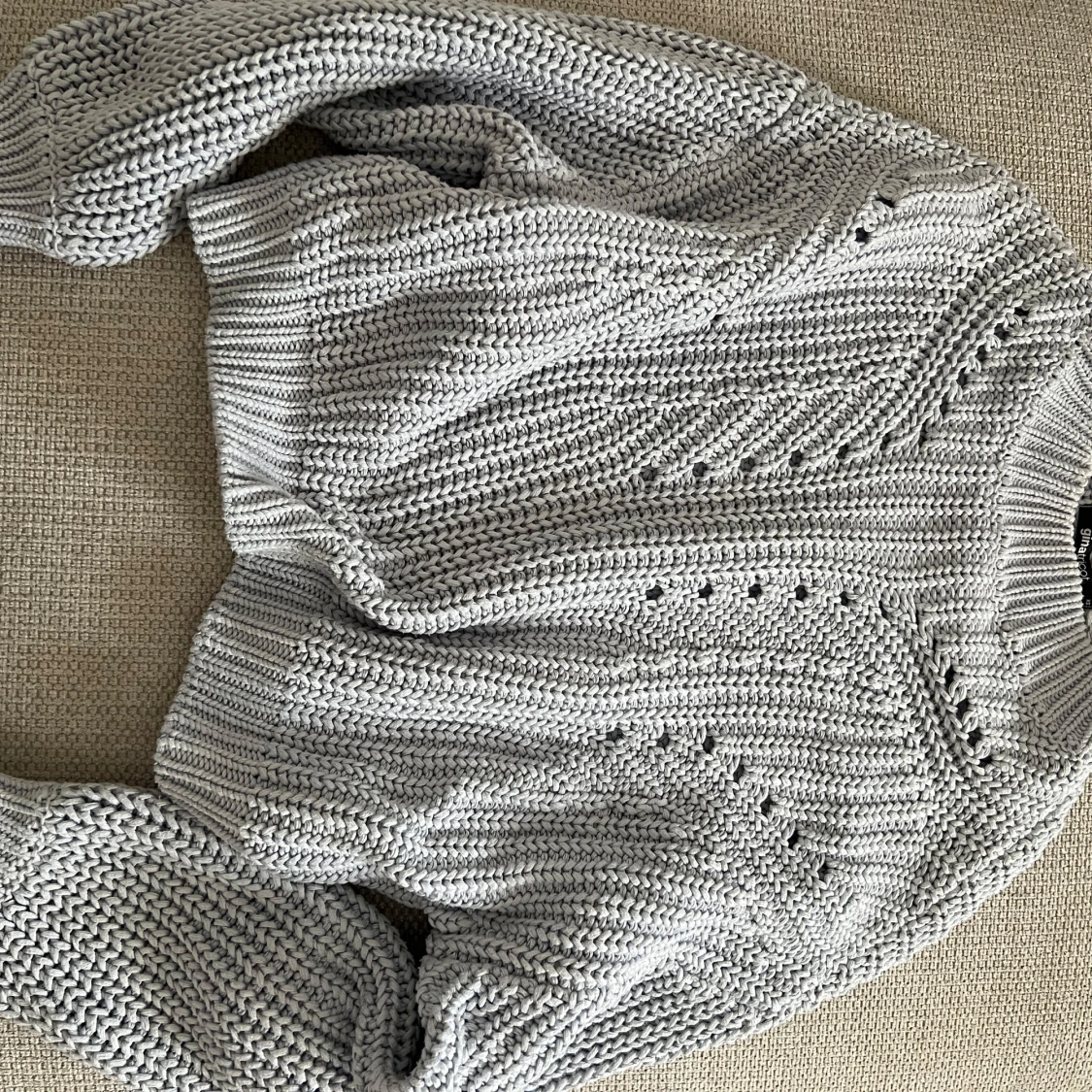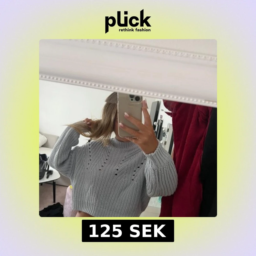 Superfin ljusgrå stickad tröja från Gina Tricot. Tröjan har ett snyggt hålmönster framtill, ribbade muddar och hög hals. Perfekt till höst och vinter för en chill men trendig look.