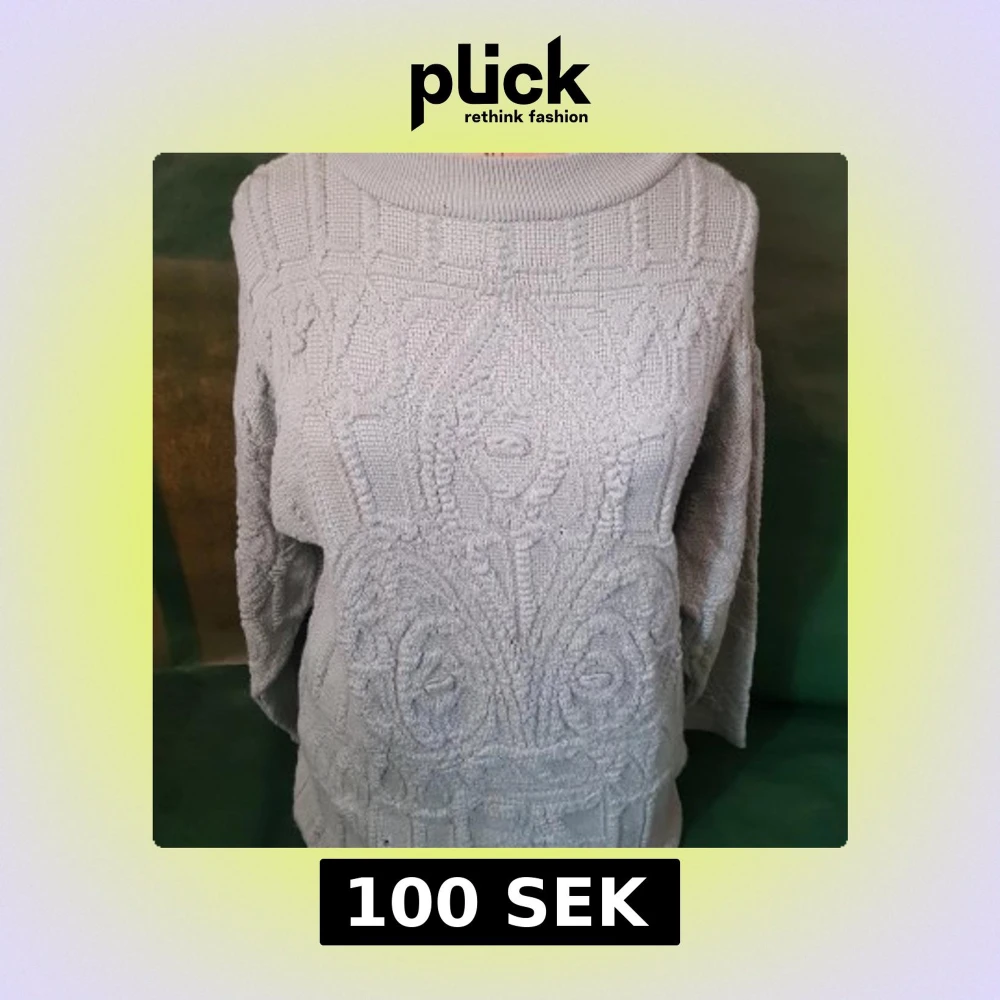 Säljer en ljusgrå stickad tröja med unikt strukturmönster och bred krage. Tröjan har lång ärm och är perfekt för kyligare dagar. Passar dig som gillar en klassisk men ändå speciell look.
