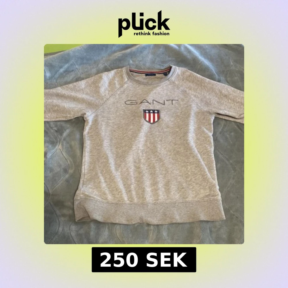 Säljer en ljusgrå sweatshirt från GANT med broderad logga och sköld på bröstet. Tröjan har rund halsringning och långa ärmar. Perfekt för en avslappnad och stilren look.