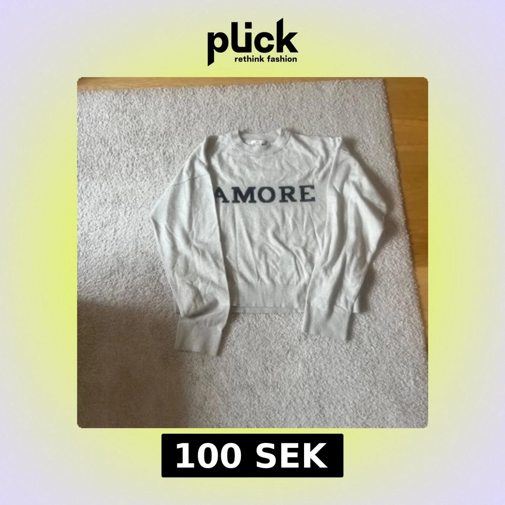 Ljusgrå långärmad tröja från Gina Tricot med svart texten 'AMORE' framtill. Klassisk rund halsringning och ribbade muddar. Perfekt för dig som gillar enkel men snygg stil.