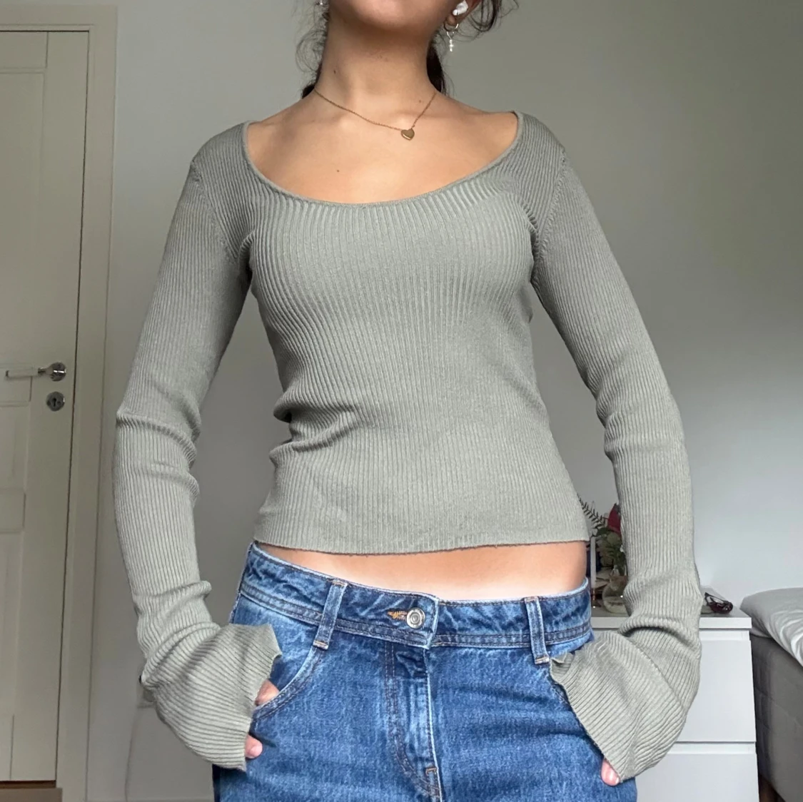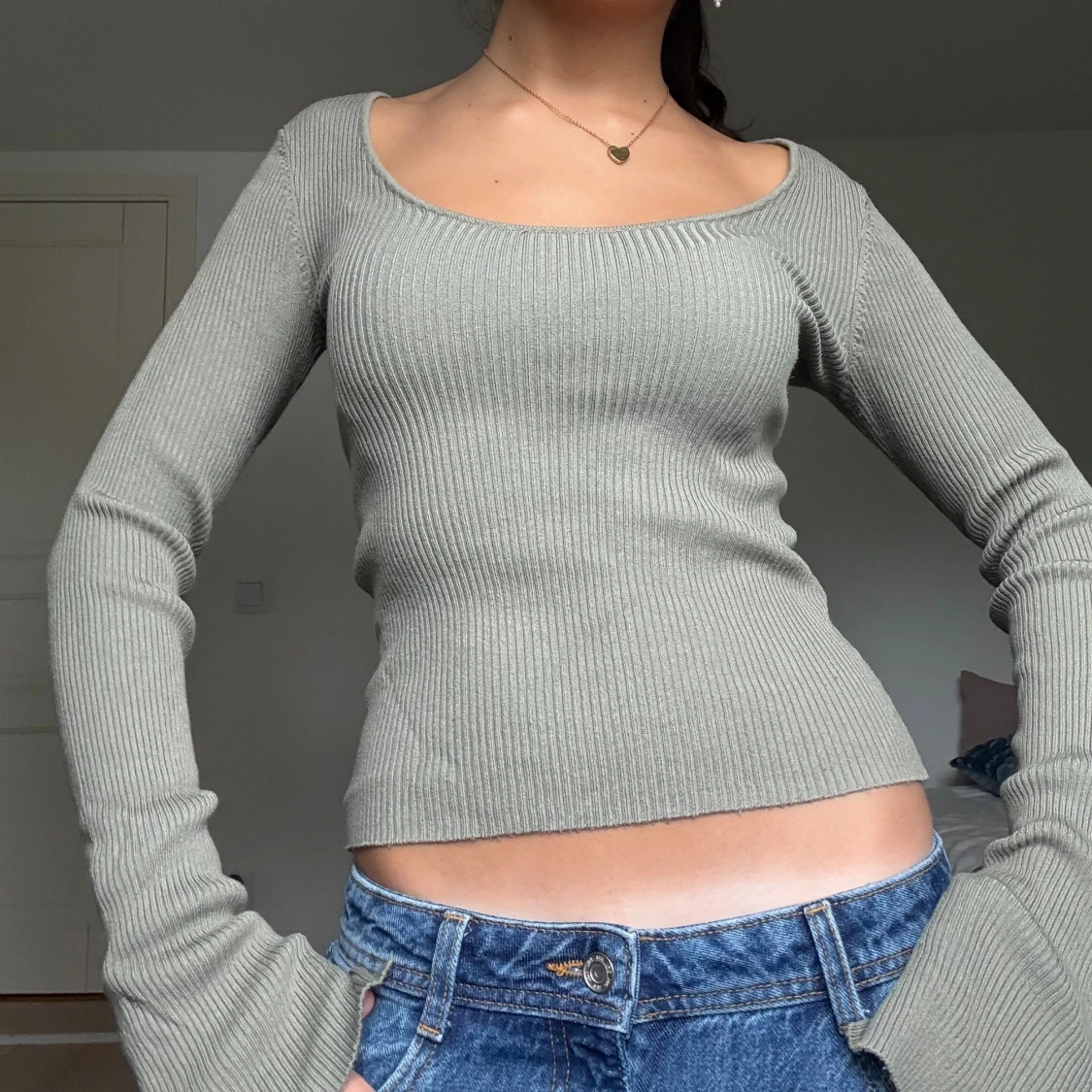 Supersnygg ljusgrön ribbad tröja med lång ärm och rundad, djup urringning.