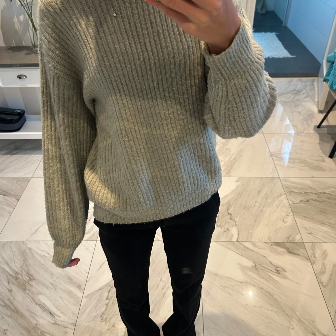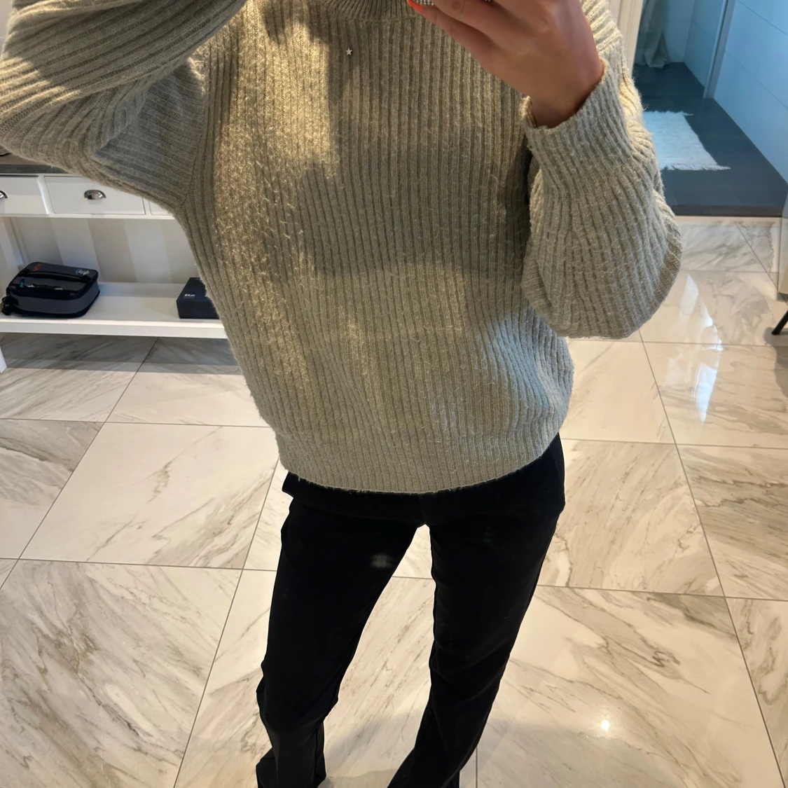 Säljer en ”ljusgrön” stickad tröja med ribbat mönster. Mycket skön tröja.