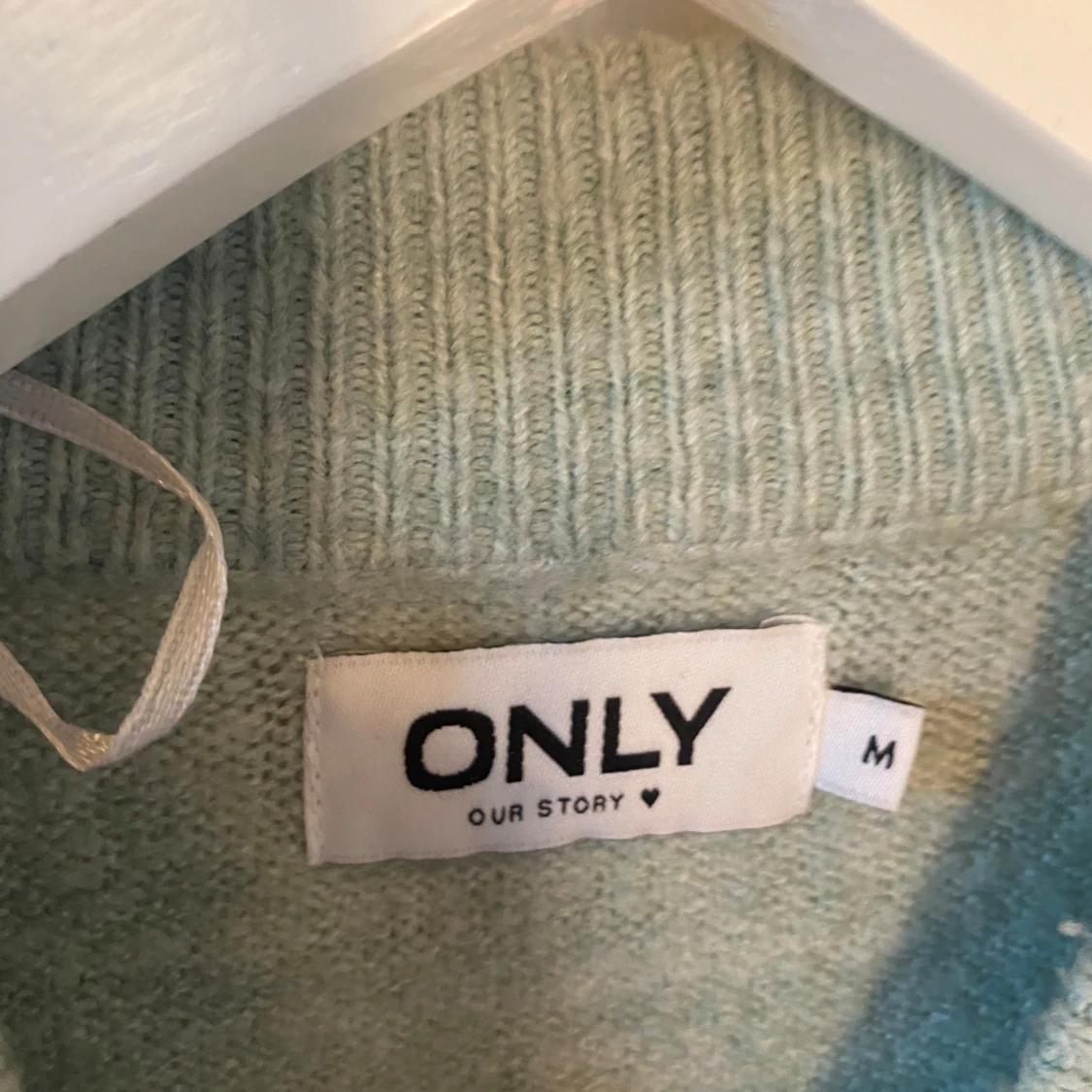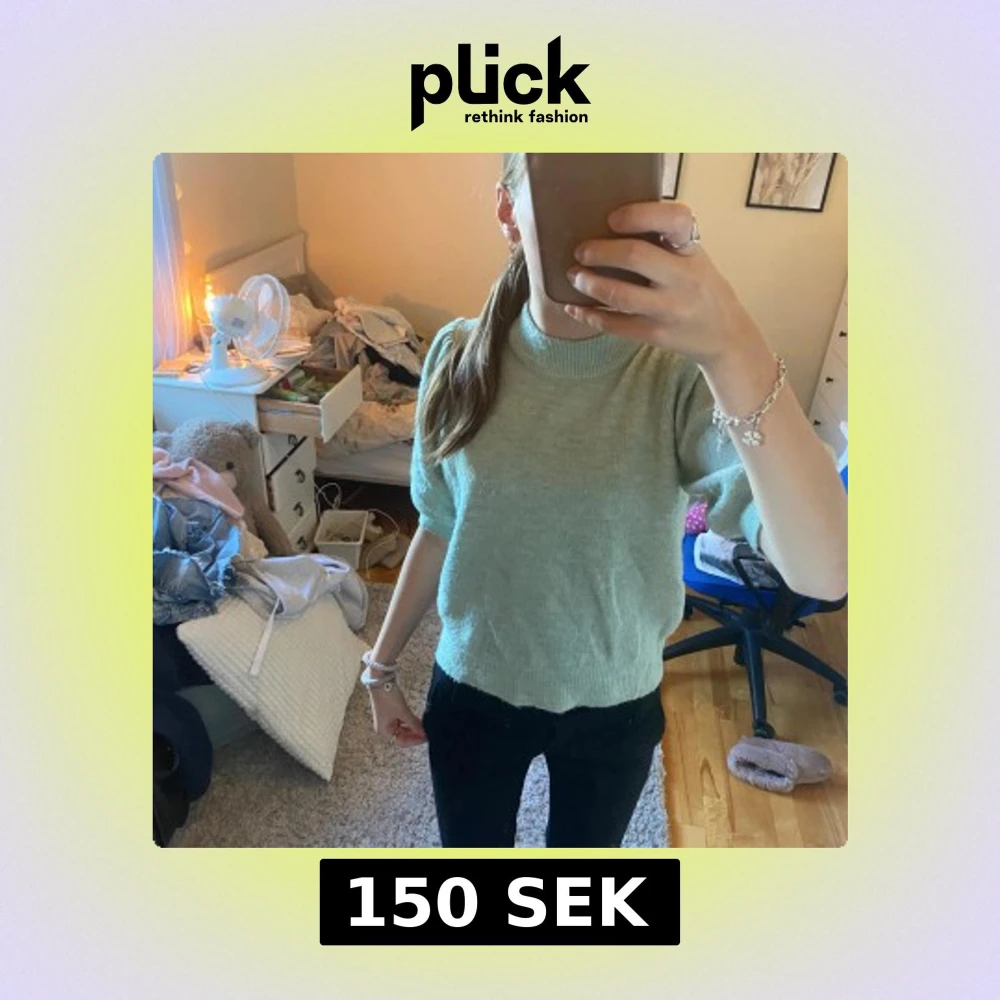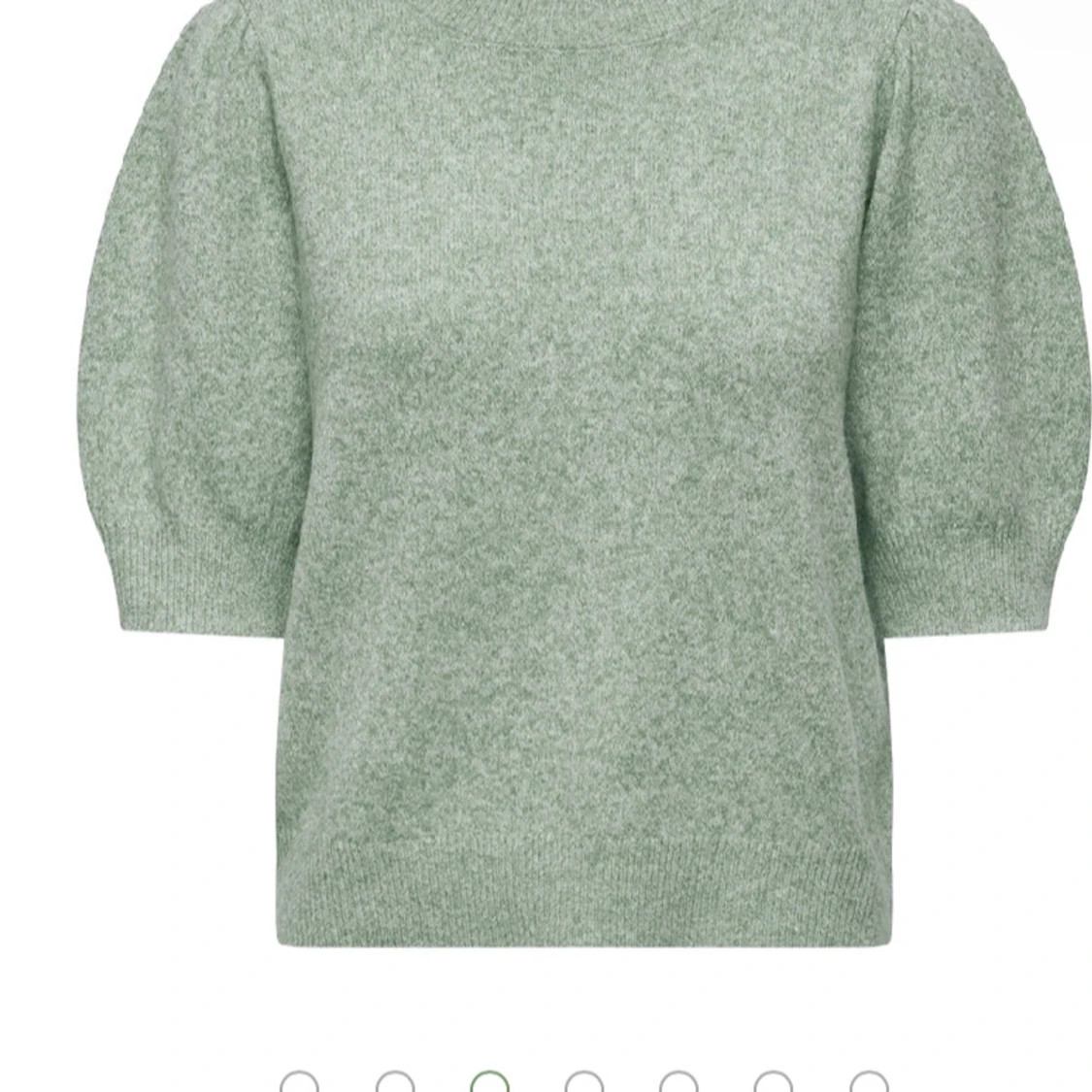 Säljer en ljusgrön stickad tröja med puffärmar. Ärmarna är trekvarts och modellen är rak.