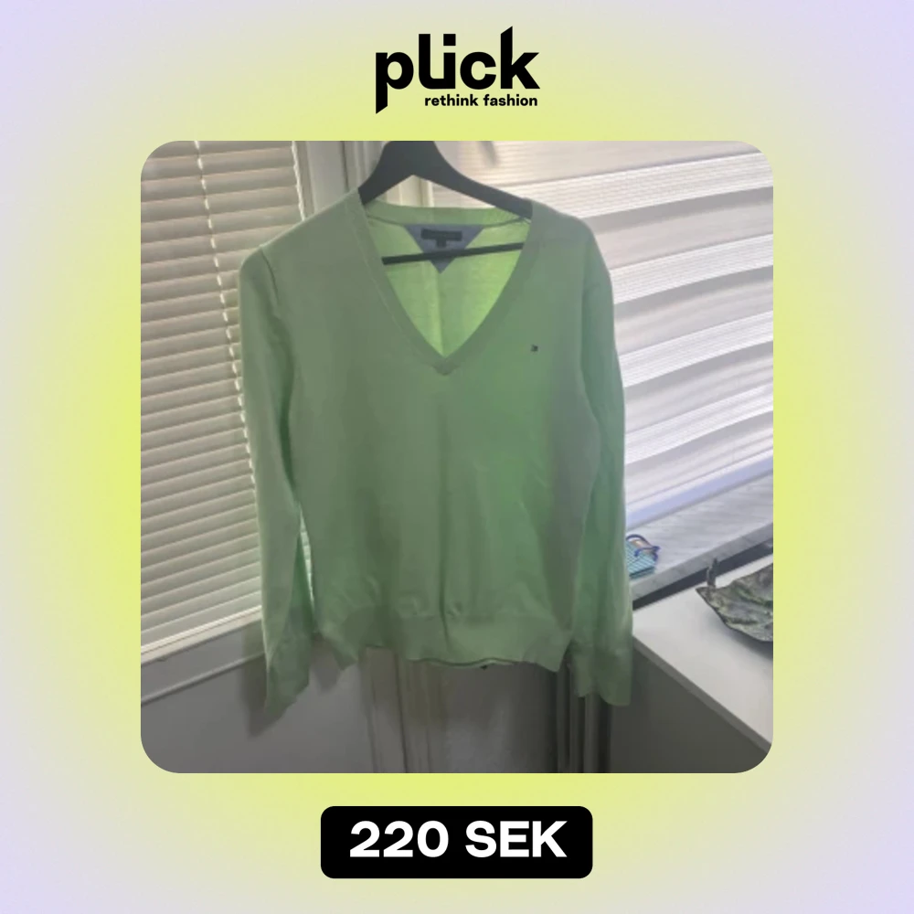 Säljer en snygg ljusgrön tröja från Tommy Hilfiger. Den har en stilren v-ringning och är i ett mjukt material som känns skönt mot huden. Perfekt för både vår och sommar! Tröjan har långa ärmar och en liten logga på bröstet. Passar perfekt för en casual look.