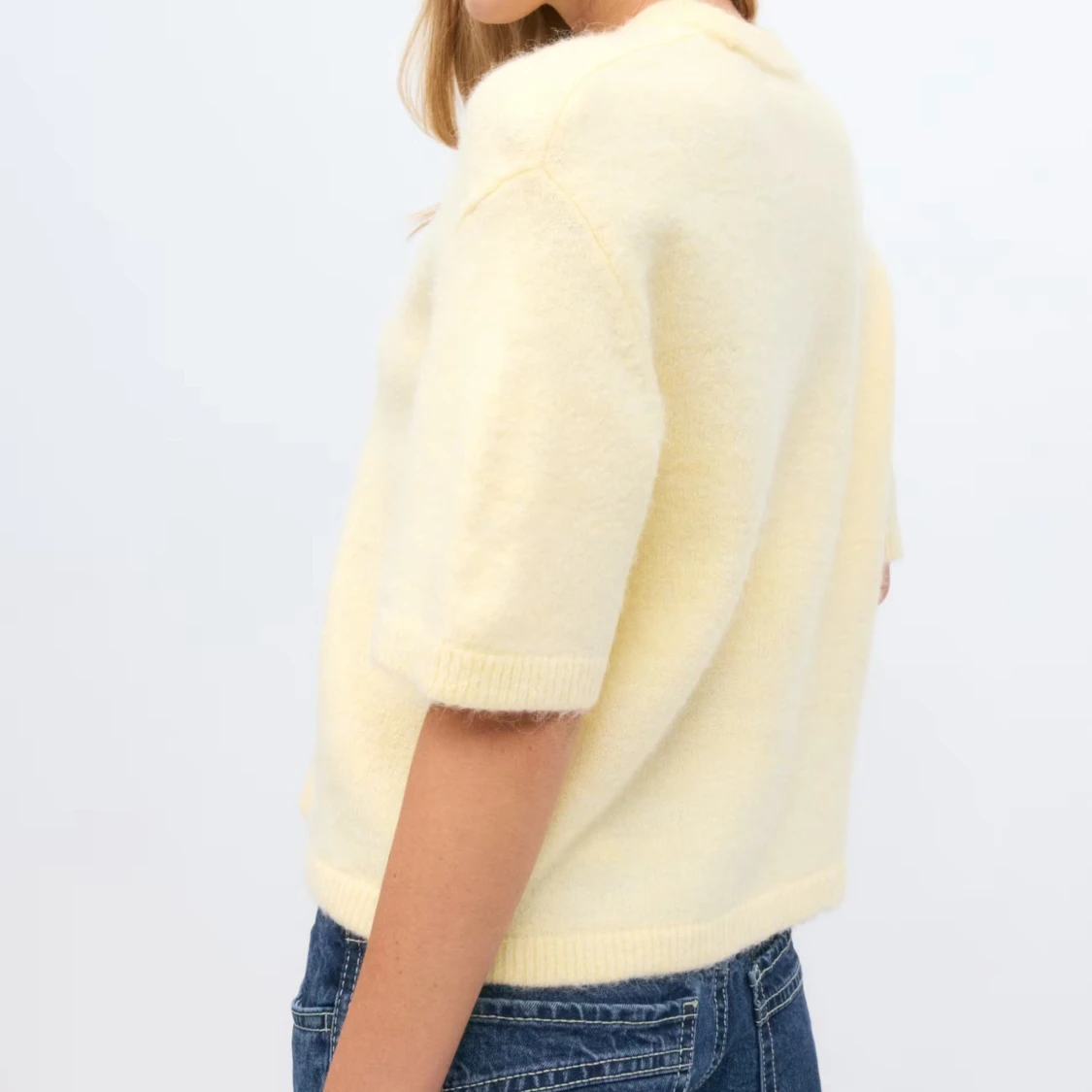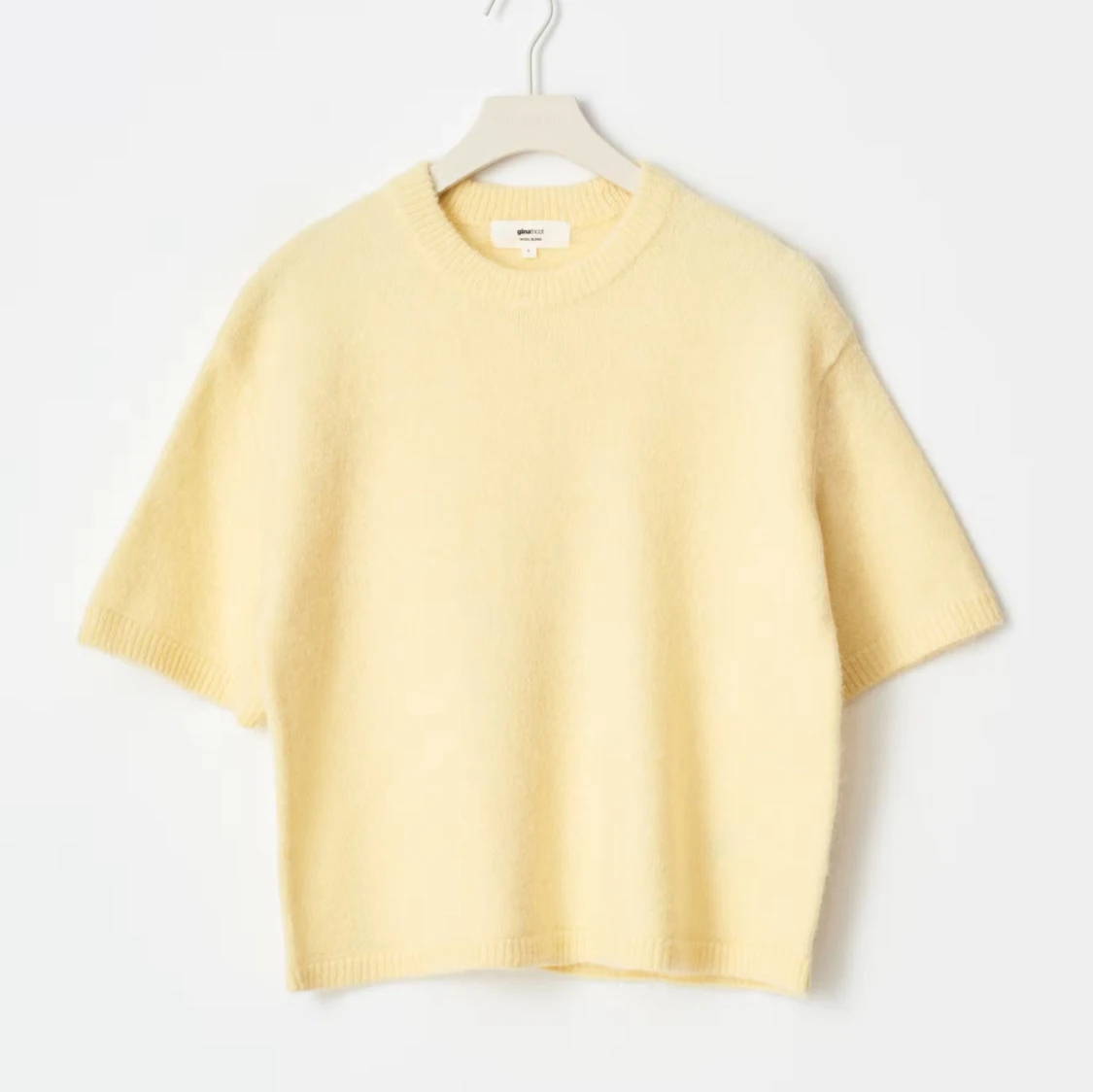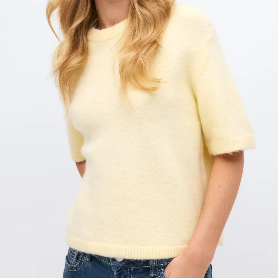 Ljusgul stickad tröja från Gina med kort ärm och rund halsringning. Endast använd ett fåtal gånger