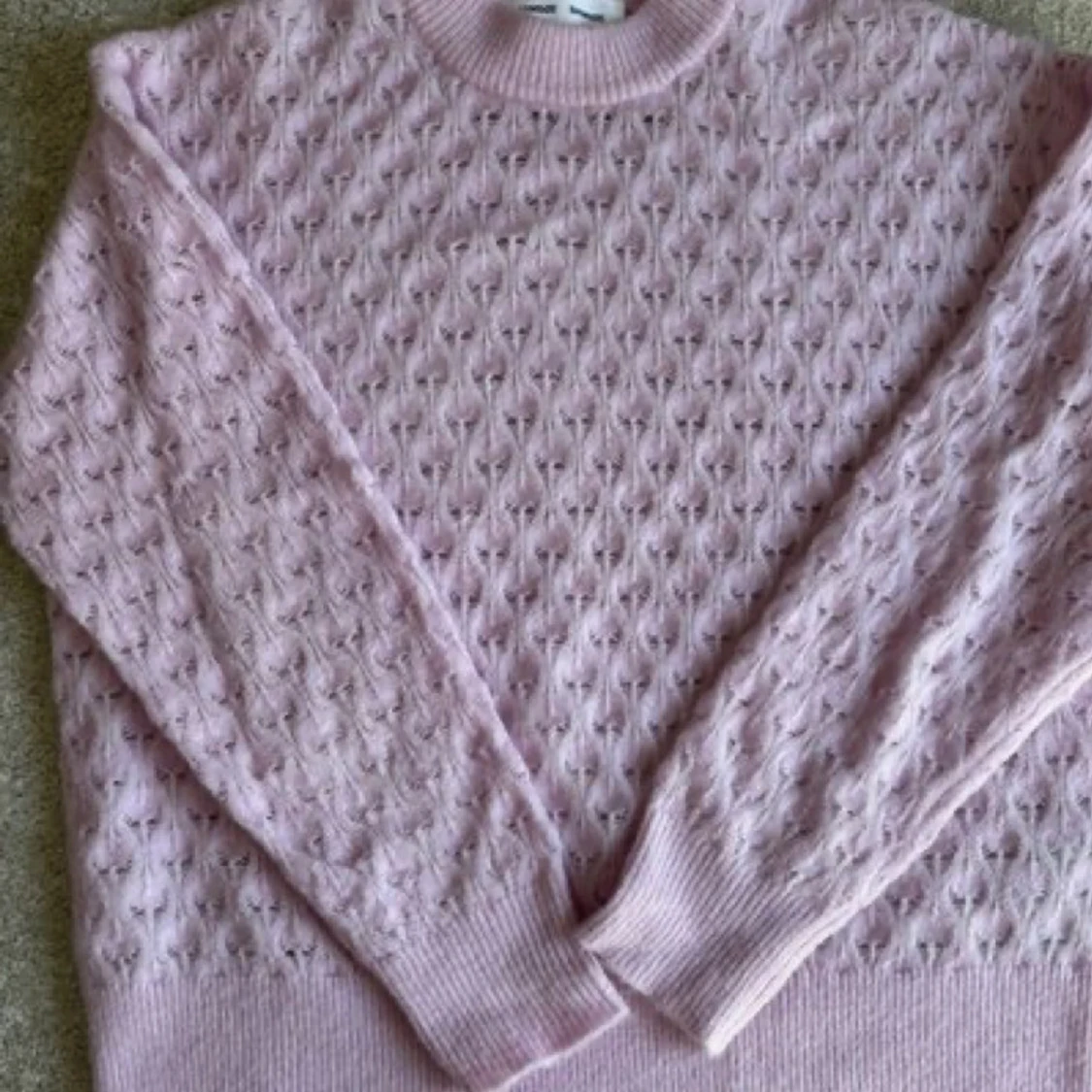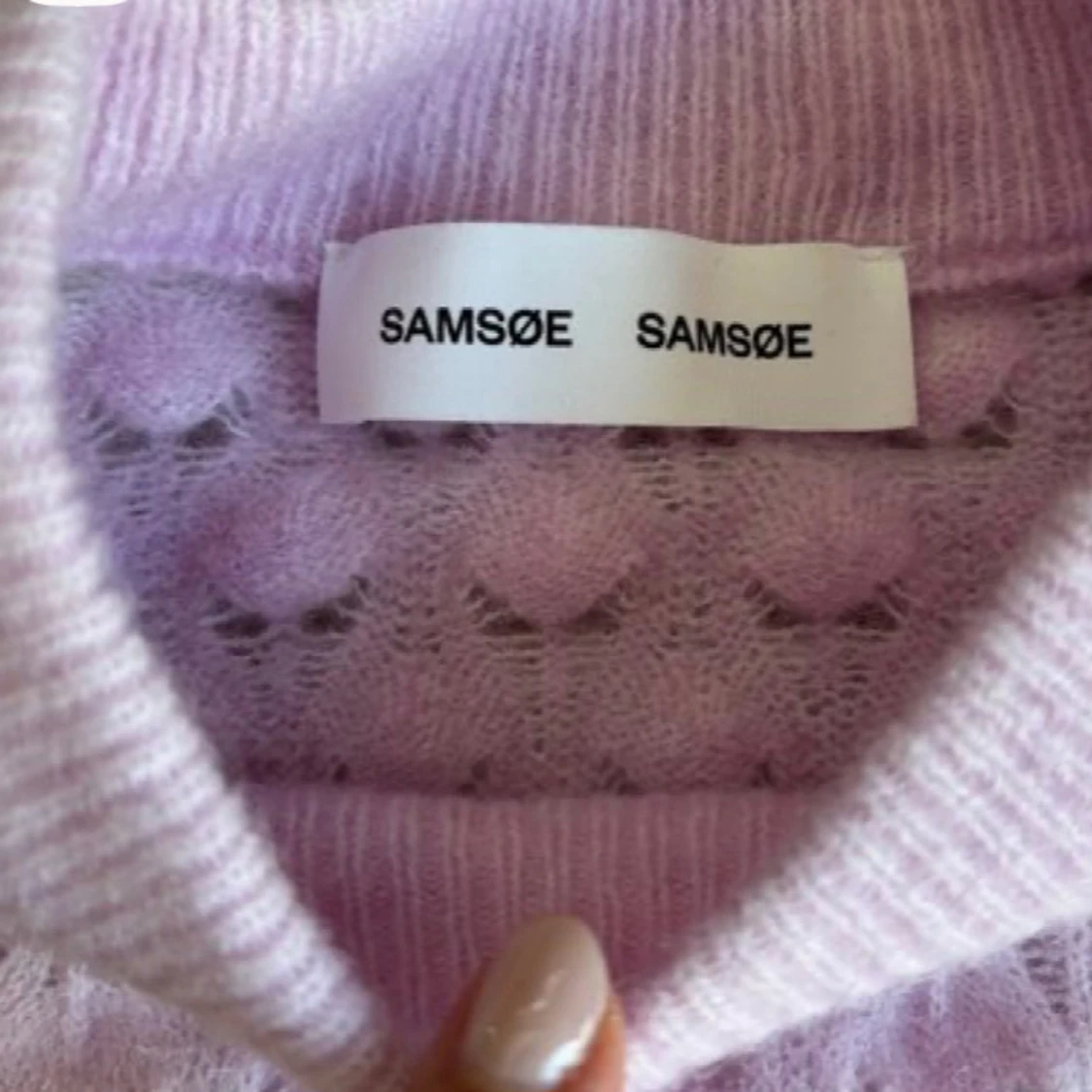 Superfin ljuslila stickad tröja från Samsøe Samsøe med ett snyggt hålmönster över hela tröjan. Rund hals och långa ärmar med ribbade muddar. Perfekt att styla med jeans eller kjol för en chill look.