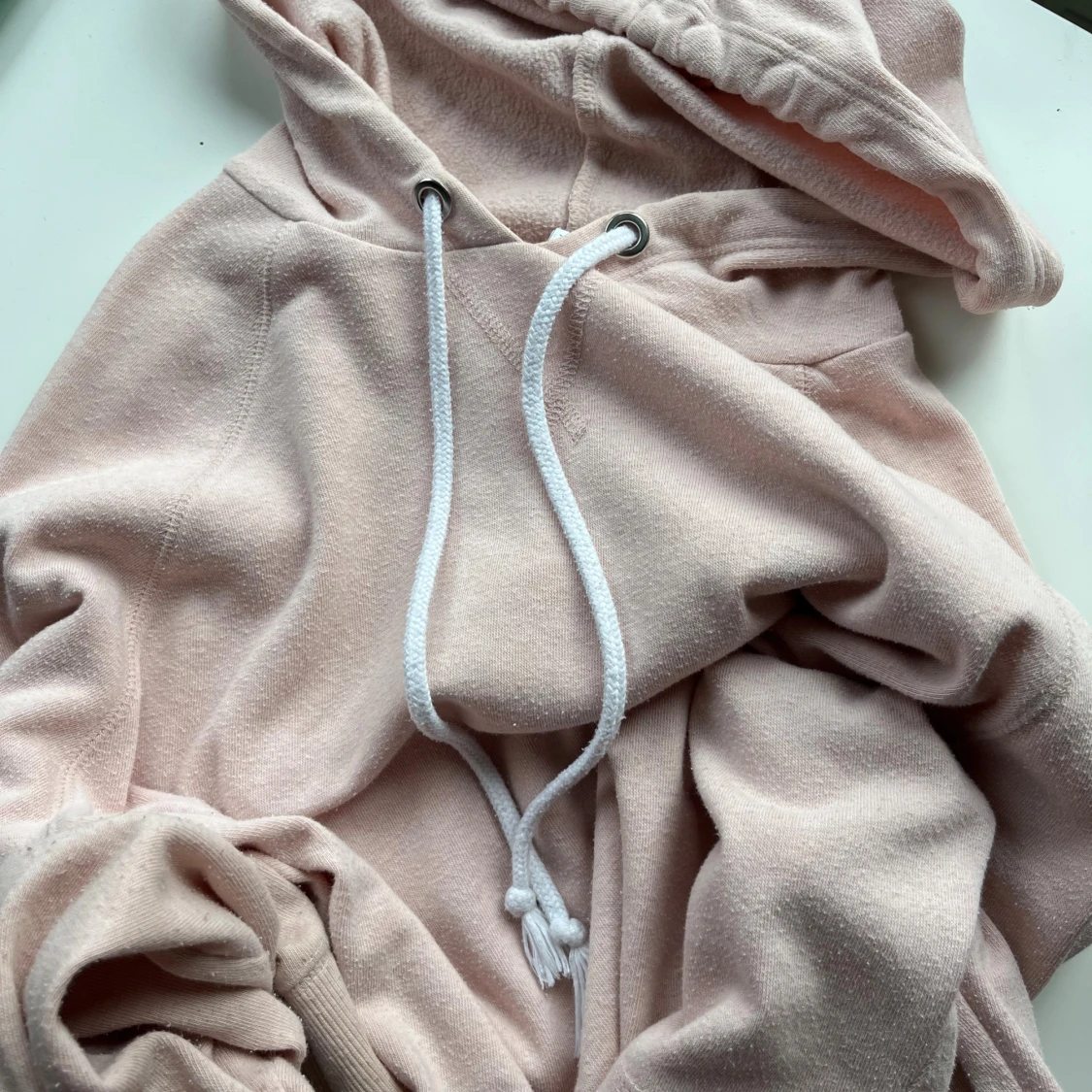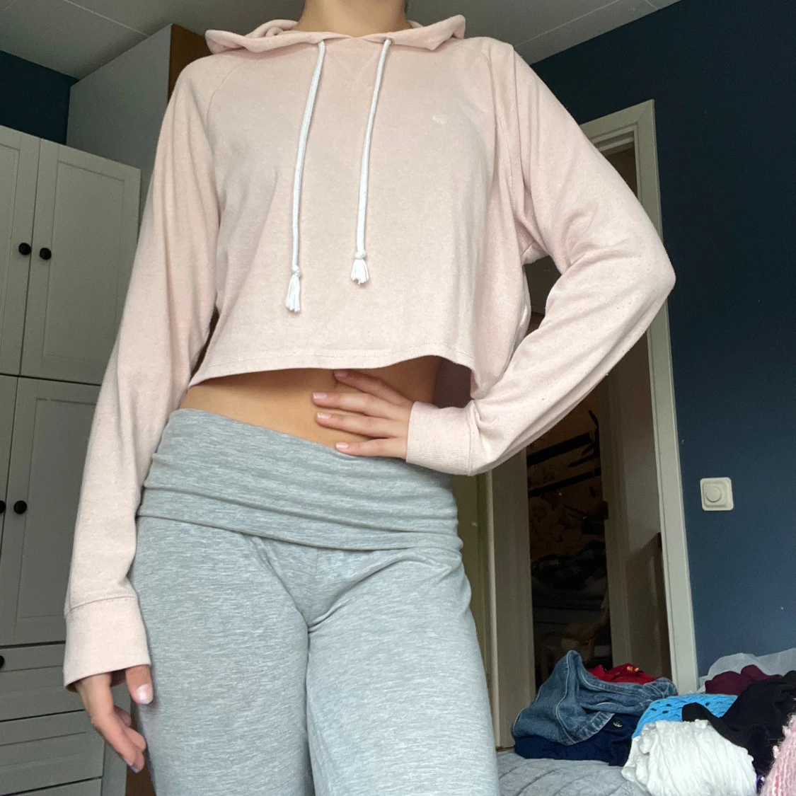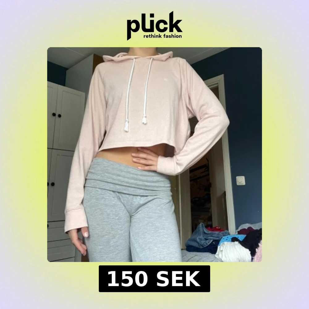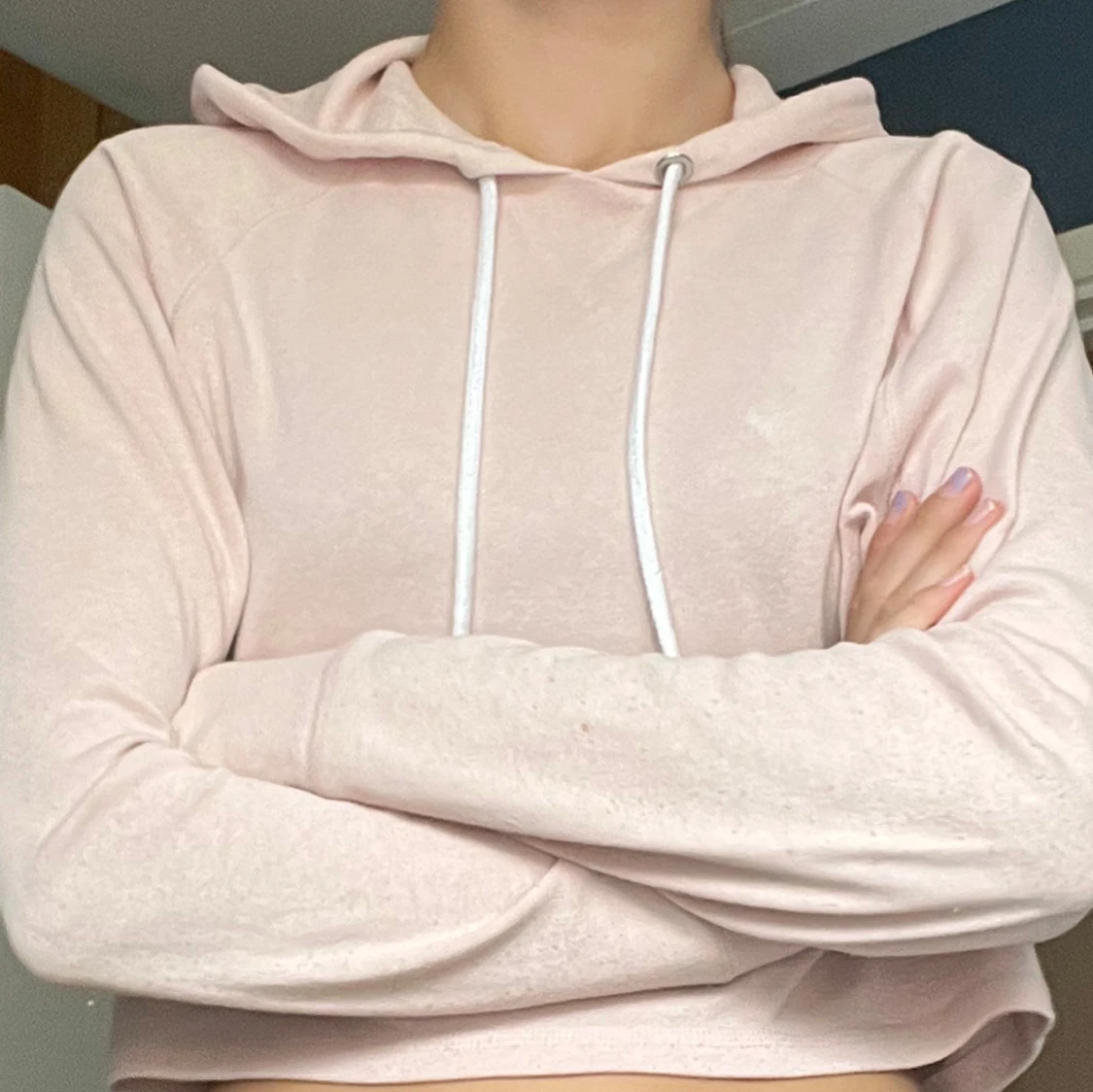 Superfin ljusrosa croppad hoodie med huva och vita snören. Tröjan har långa ärmar och är i mjukt bomullsmaterial, perfekt för en chill och avslappnad look. Enkel och stilren design som passar till allt.