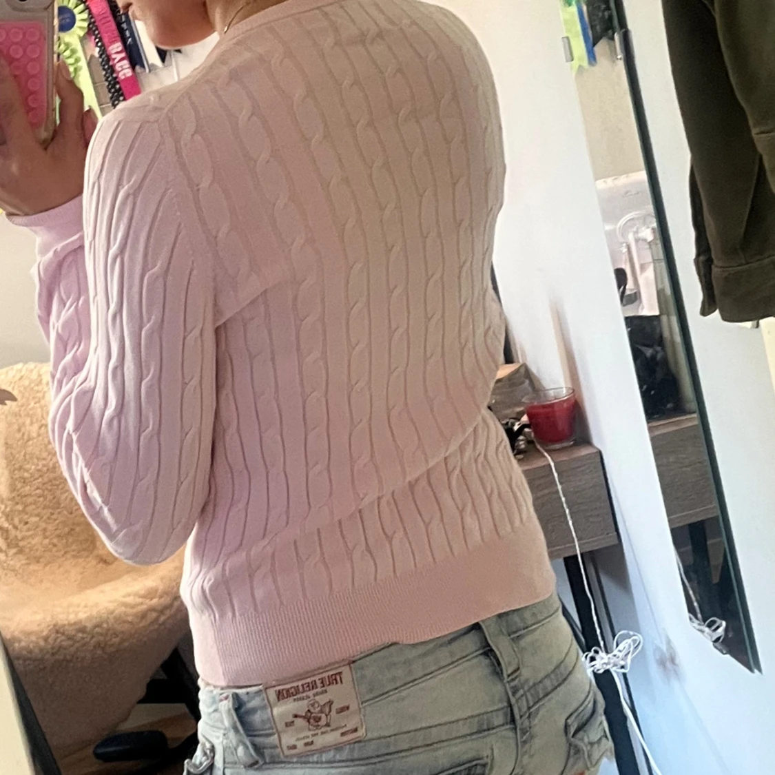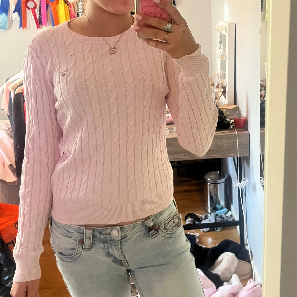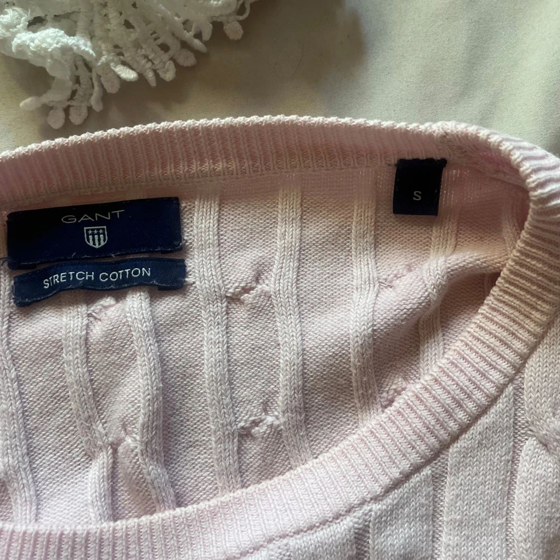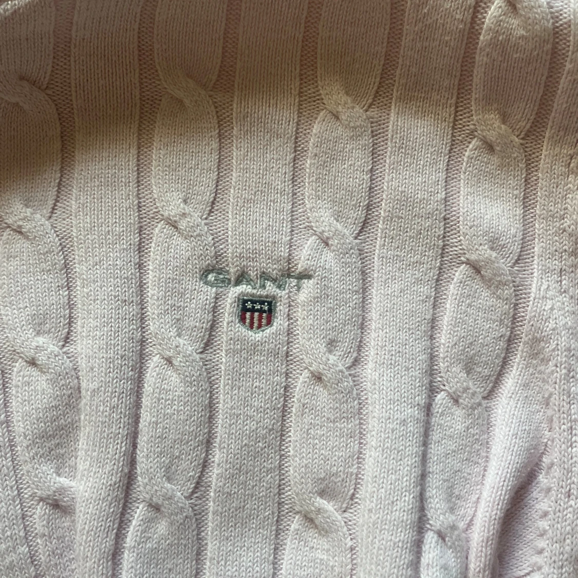 Supersöt ljusrosa kabelstickad tröja från Gant i stretchig bomull. Klassisk rund halsringning, diskret broderad logga på bröstet och ribbade muddar. Perfekt för dig som gillar preppy och stilren look.
