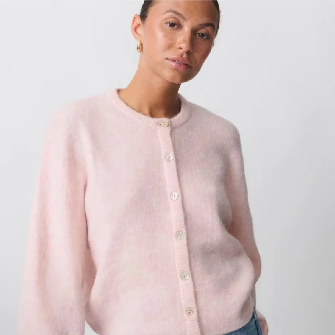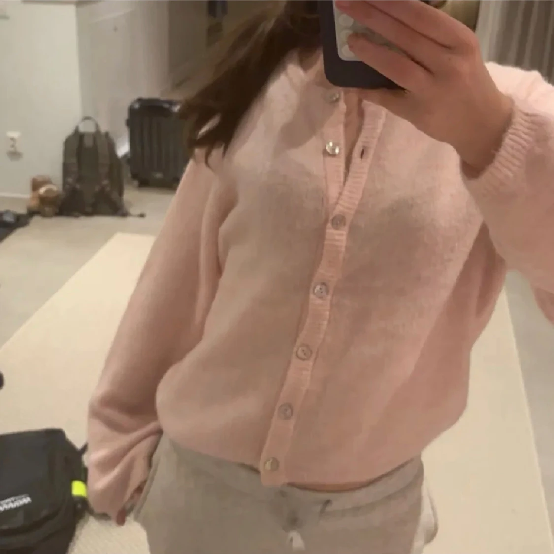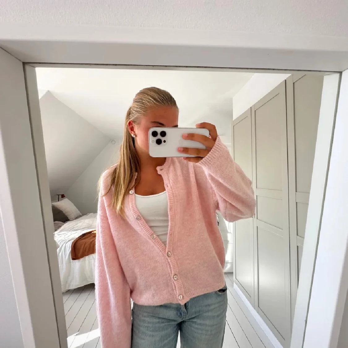 Jättegullig och skön ljusrosa kofta med rund hals och fina knappar framtill. Koftan har en loose passform och långa ärmar, perfekt att ha över ett linne eller t-shirt. Materialet känns stickat och ger en mysig vibe. Lånade bilder men skriv om ni vill ha fler! Använd fåtal gånger, nypris 400kr