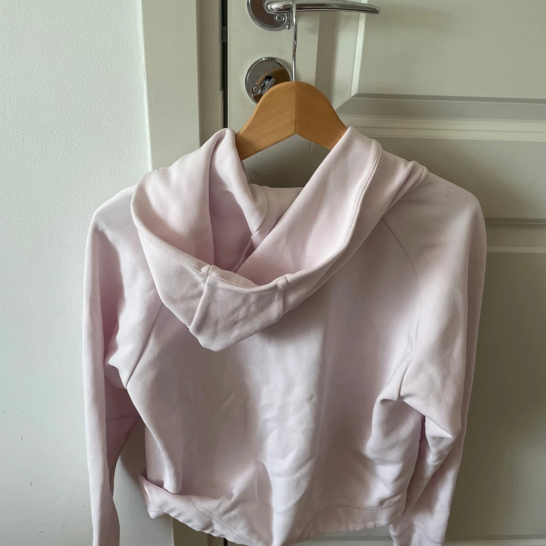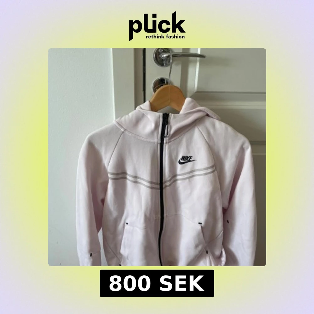 Säljer en ljusrosa hoodie från Nike med hel dragkedja och huva. Tröjan har svarta Nike-loggan på bröstet, två fickor framtill och en snygg randig detalj över bröstet. Perfekt för chill dagar eller när du vill ha en sportig look.