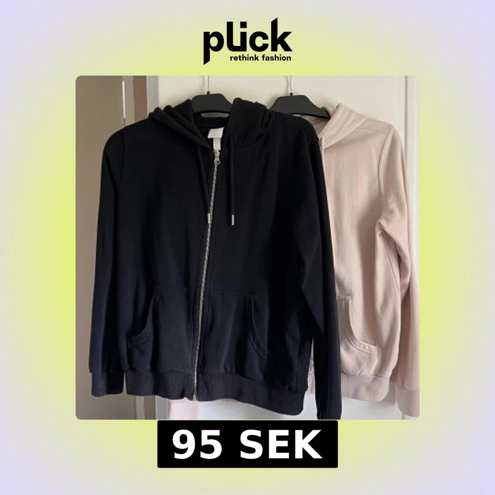 Säljer en ljusrosa (svårt att få rätt färg på bild) och en svart hoodie med dragkedja och huva. Tröjan har två fickor framtill och justerbara snören i huvan. Perfekt för en avslappnad stil och passar året runt. Använd fåtal gånger, dock har den rosa fått två små fläckar (knappt synbara på) men kan nog lätt tas bort med hjälp av solen eller fläckborttagning (jag har ej behandlat). M men passar S