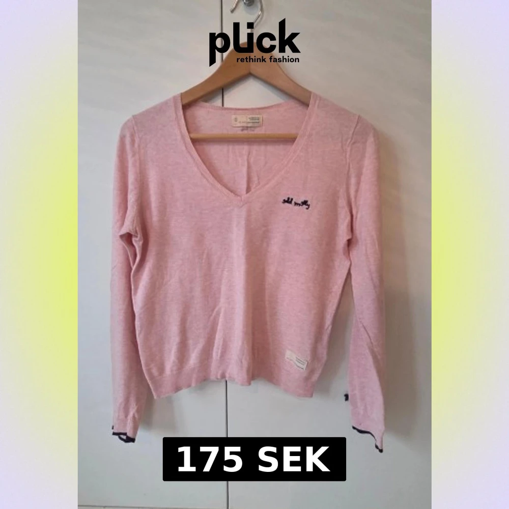 Söt ljusrosa tröja från Odd Molly med v-ringning och lång ärm. Tröjan har en liten mörkblå rosett på ärmsluten och mörkblå broderad logga på bröstet. Materialet är mjukt och tunt, 100% bomull.. Svarta detaljer vid muddar ger en extra touch.