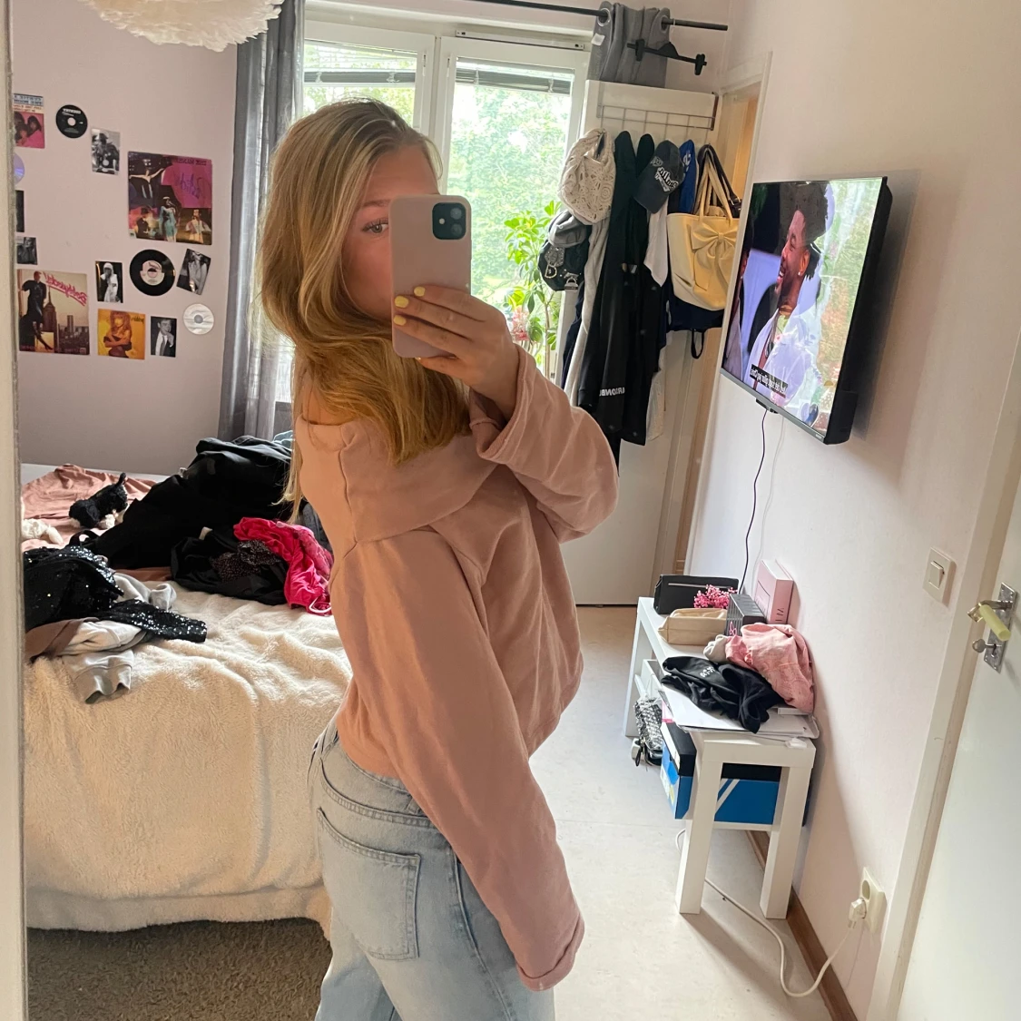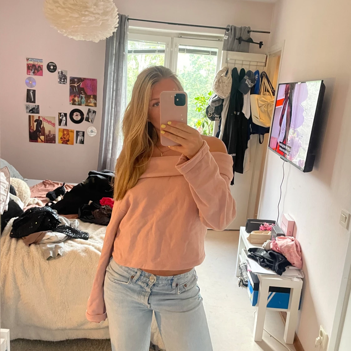 Superfin ljusrosa offshoulder tröja med lång ärm och loose passform. Mjuk och skön, perfekt till jeans eller kjol. Enkel och stilren design utan mönster eller detaljer, passar dig som gillar en chill vibe.