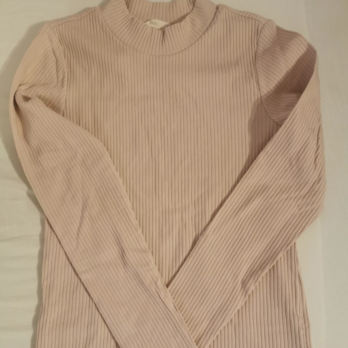 Supersnygg ljusrosa ribbad tröja från H&M. Tröjan har lång ärm, rund halsringning och är i ett mjukt, stretchigt material som sitter skönt på kroppen. Perfekt att styla med jeans eller kjol för en clean look.