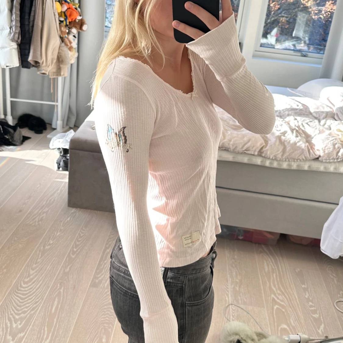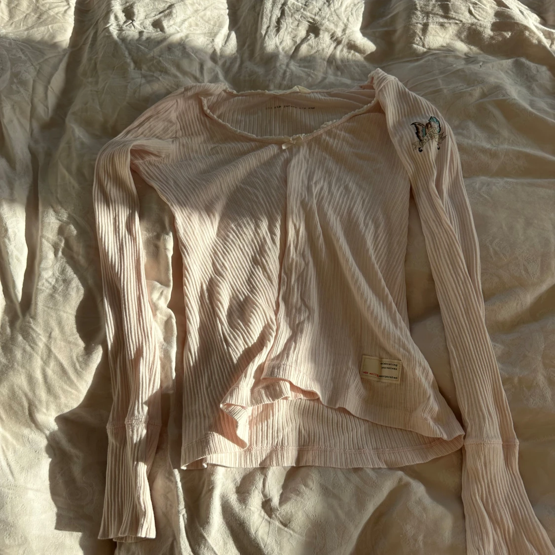 Säljer en superfin ljusrosa ribbad tröja med v-ringning och långa ärmar. Den har en söt liten broderad detalj på ärmen. Tröjan är i bra skick. Märket är Odd molly och storlek 0 vilket är som XS.